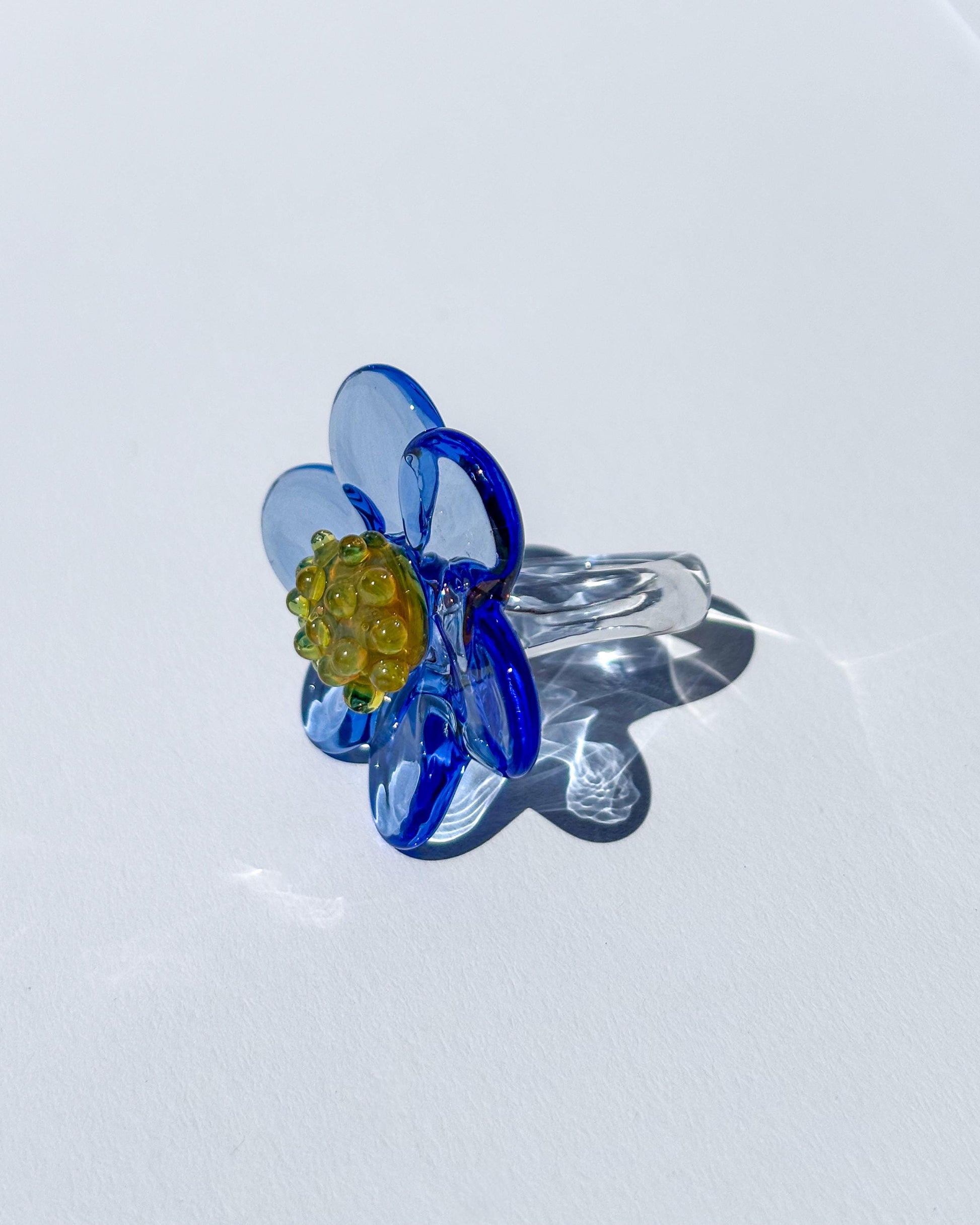Die Blue Bloom Ohrringe sind ausdrucksstarke Statement-Ohrringe aus handgearbeitetem Borosilikatglas. Jede tiefblaue Glasblume besitzt ein sonnengelbes Zentrum und erinnert in ihrer intensiven Farbe an leuchtendes Kobaltblau, kraftvoll, lebendig und klar.