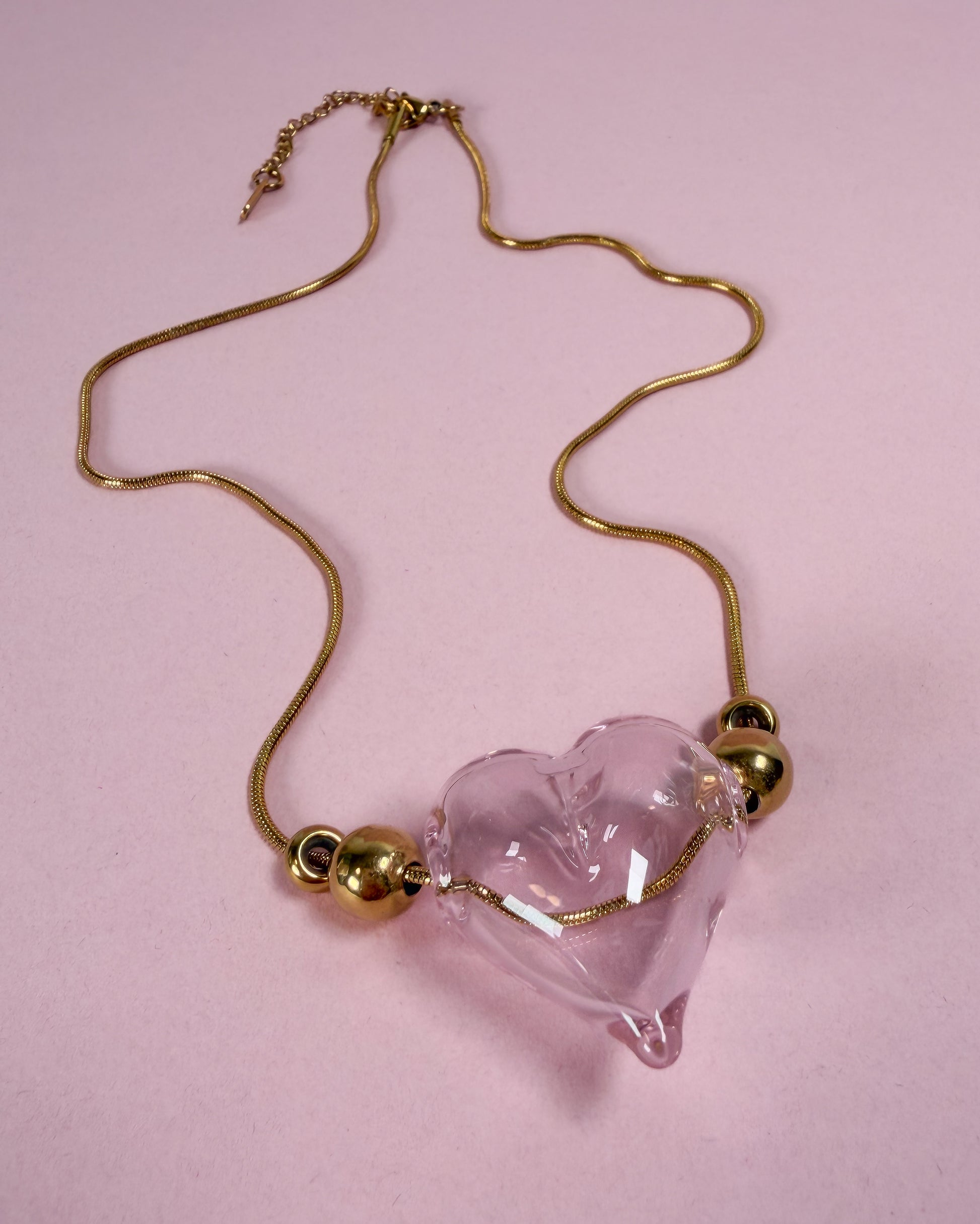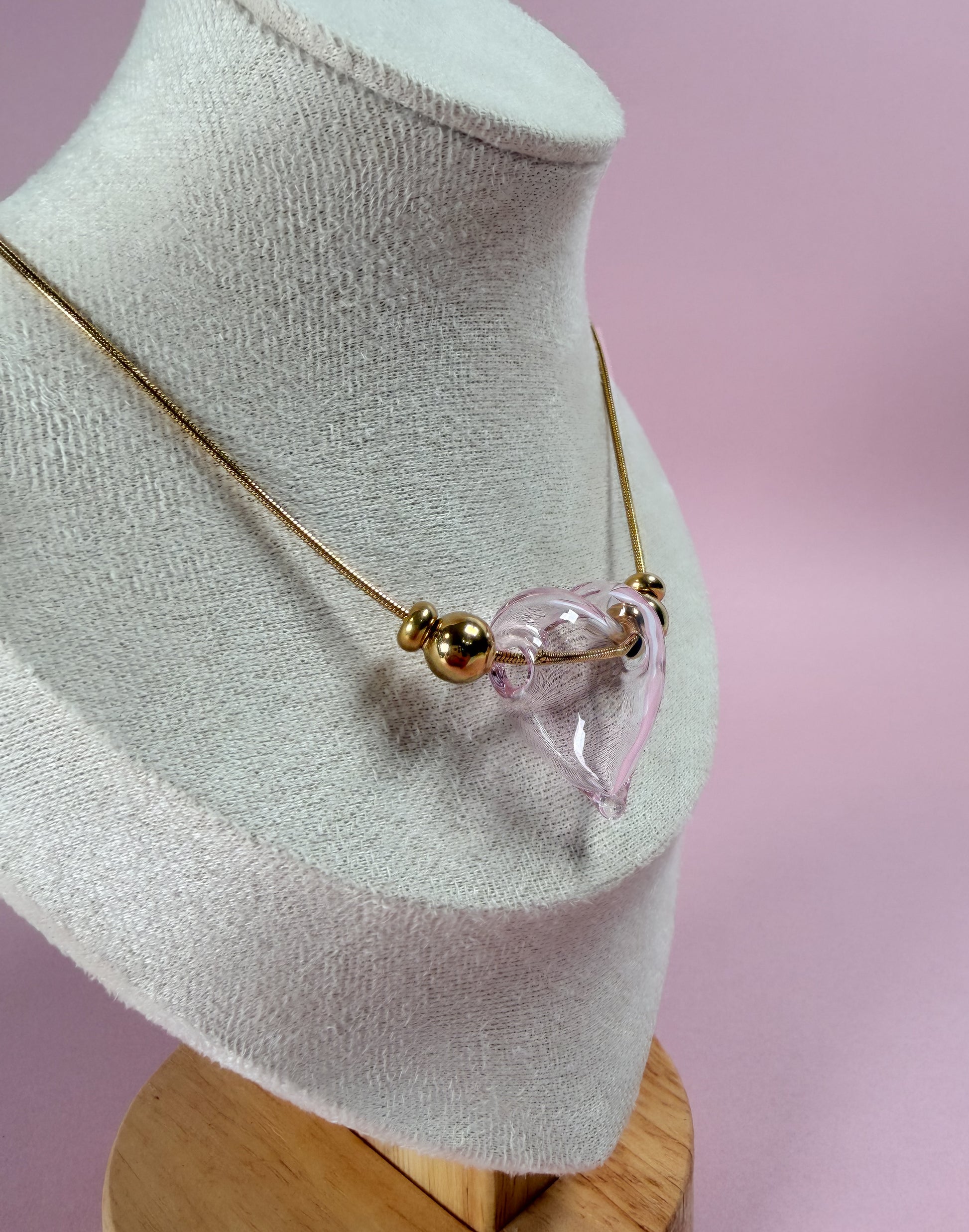 Die transparent rosafarbenen Herzen werden aus Borosilikatglas frei am Brenner geblasen und hohl gearbeitet. Dadurch entstehen dreidimensionale Formen mit außergewöhnlicher Leichtigkeit, die das Licht aufnehmen und im Inneren des Glases brillante Reflexionen erzeugen.