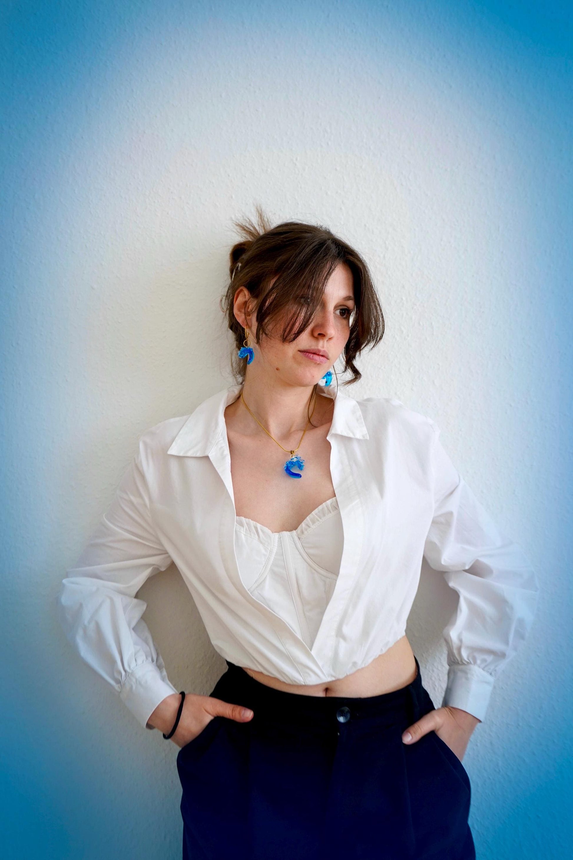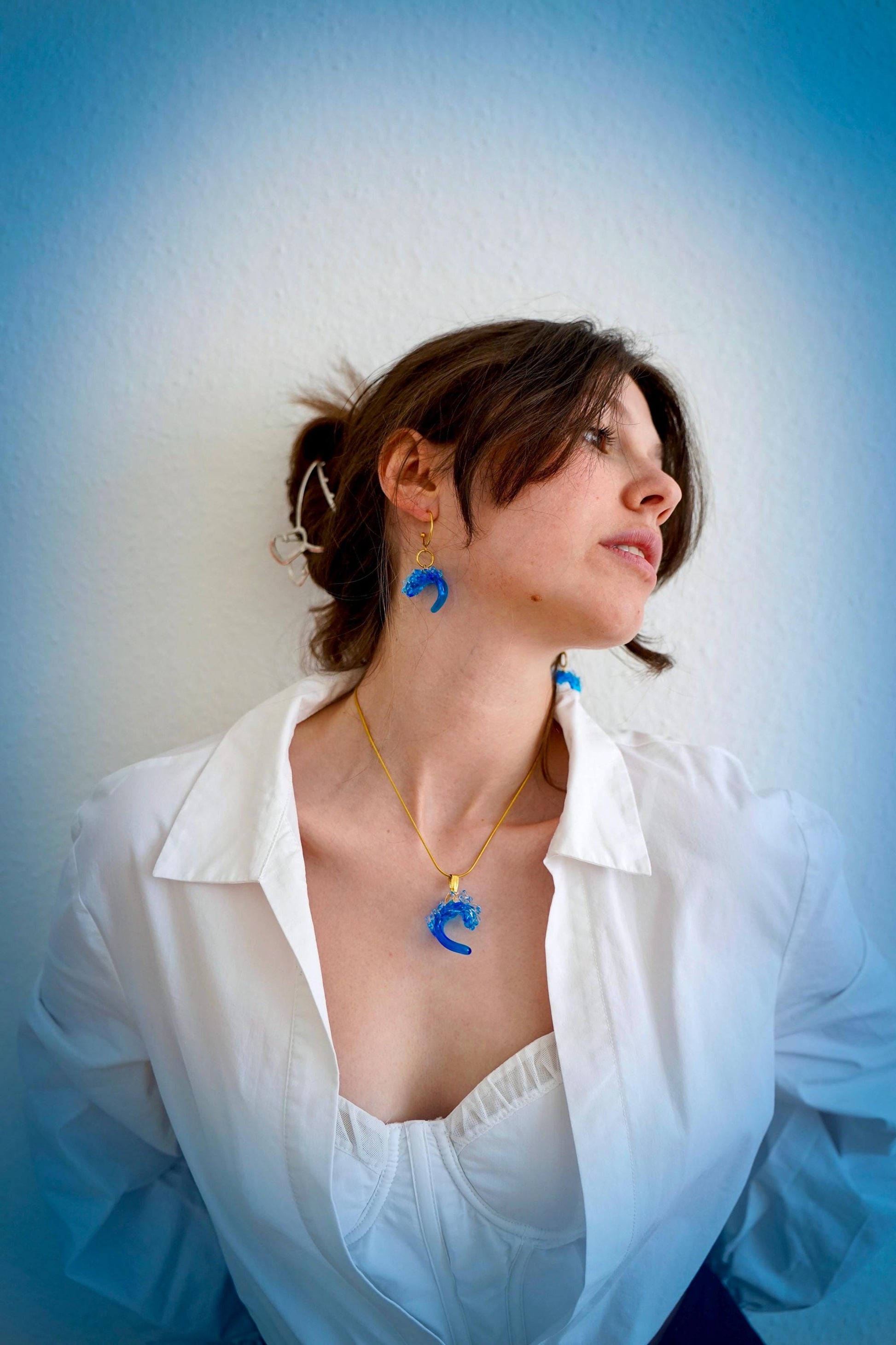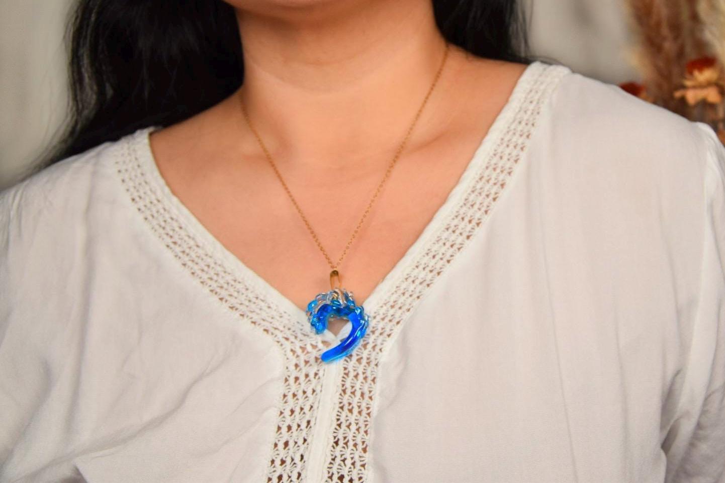 Die geschwungene Wellenform vereint tiefes Meeresblau, leuchtendes Türkis und klares Glas. Diese Farbkombination lässt das Licht sanft durch den Anhänger fließen und verleiht ihm eine besondere Leichtigkeit und Tiefe. Je nach Lichteinfall wirkt die Oberfläche lebendig und fast schwebend.