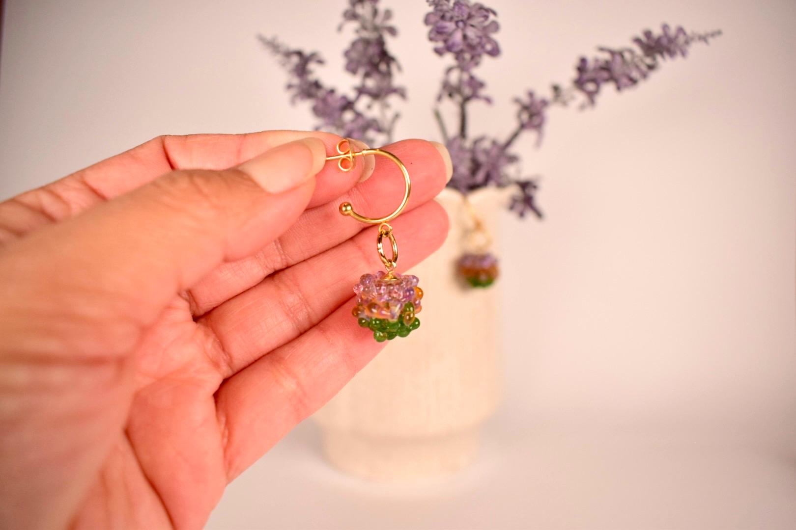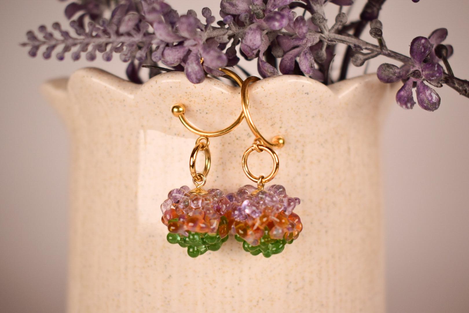 Die Farbtöne in Lila, Bernstein und Grün sind als feine Glasdots in den Glaskugeln eingefangen und reflektieren das Licht auf lebendige Weise. Jede Kugel wird in traditioneller Lampwork-Technik gefertigt und besitzt ihre eigene Struktur, jedes Paar ist ein echtes Unikat.