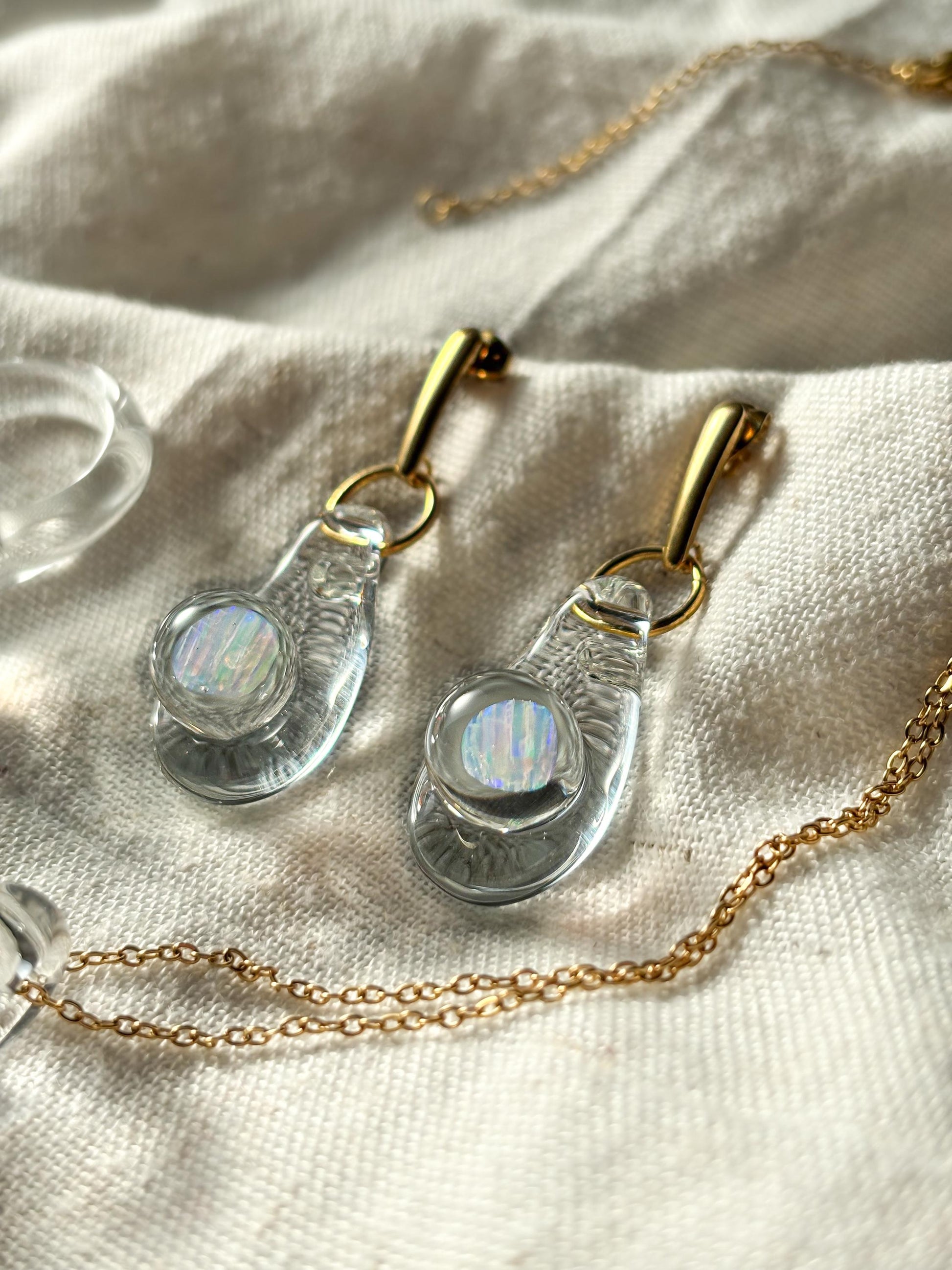 Diese filigranen Ohrringe kombinieren klares, handgefertigtes Borosilikatglas mit schimmernden Gilson-Opalen. Das transparente Glas verstärkt die Farben der Opale, die je nach Licht in magischen Nuancen leuchten wie Sonnenstrahlen auf dem Meer.