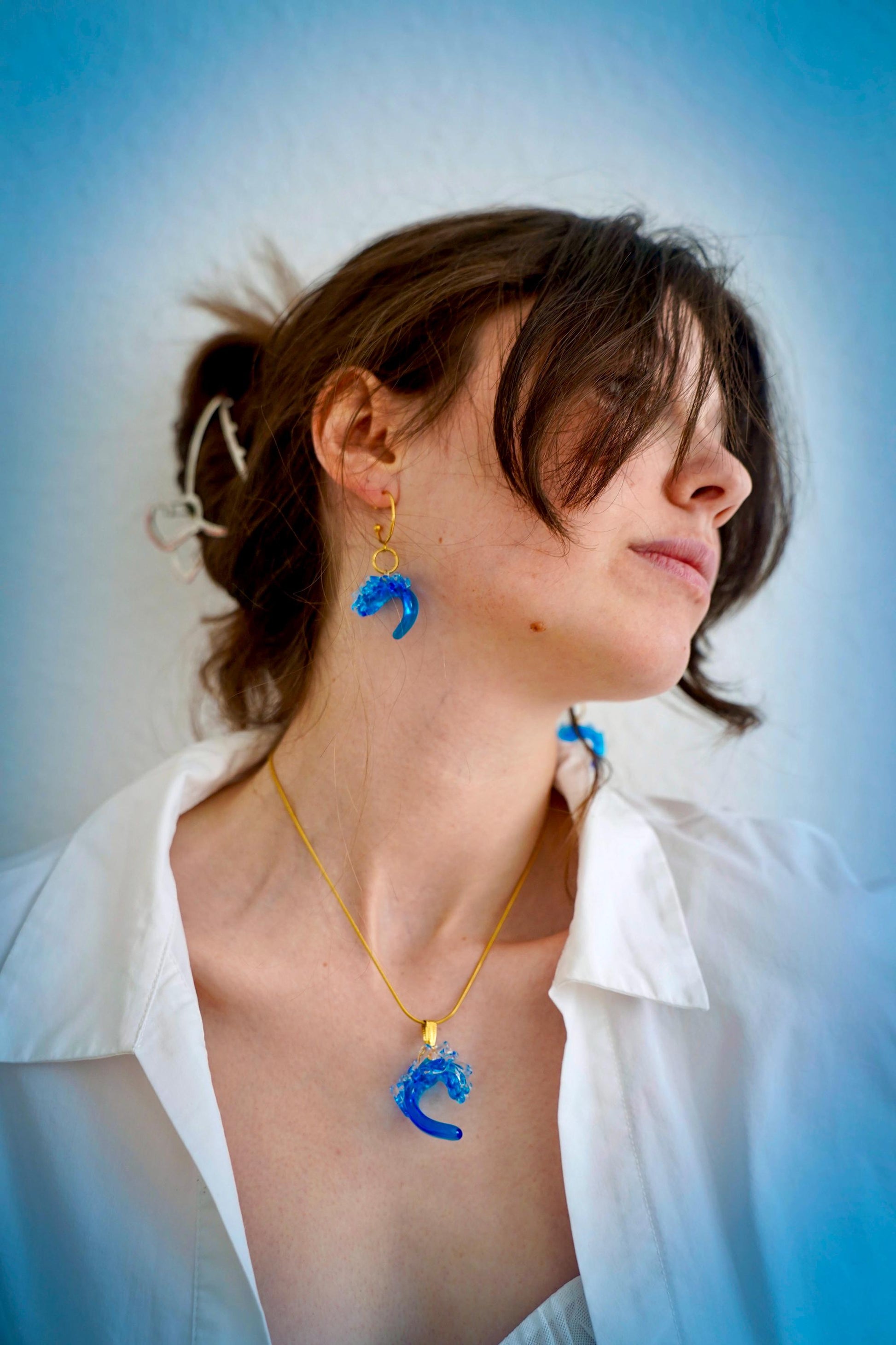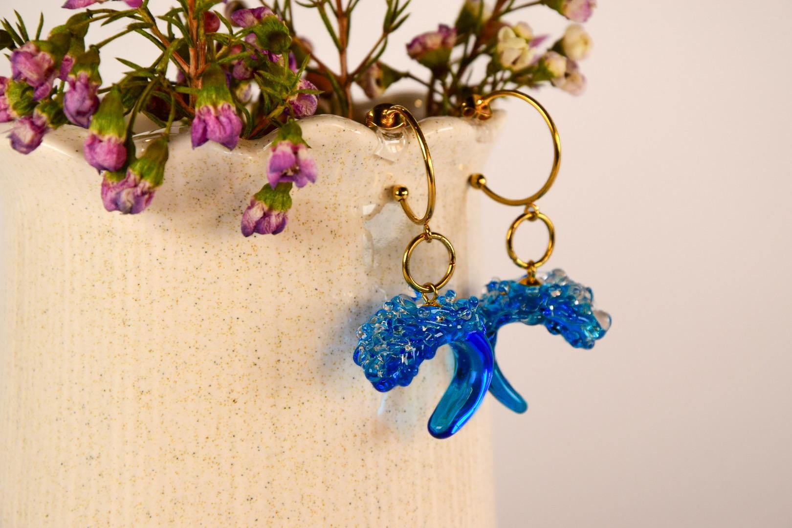 Das klare Glas verleiht den Ohrringen eine leichte, fast schwebende Optik. Je nach Lichteinfall entstehen lebendige Reflexionen, die die organische Form unterstreichen. Jedes Paar wird in meinem Atelier mit großer Sorgfalt von Hand gefertigt und ist ein echtes Unikat.