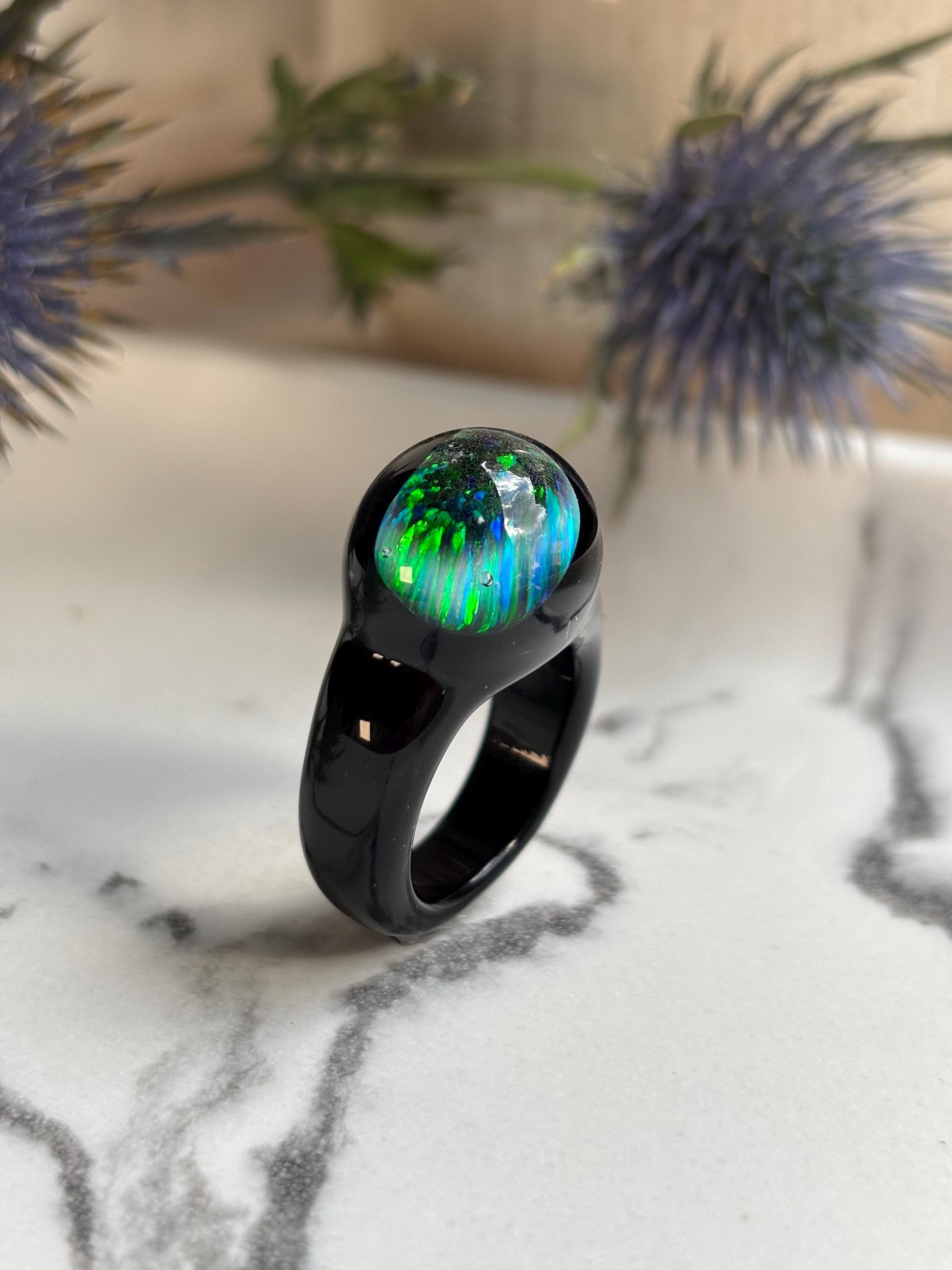 Dieser handgefertigte Glasring vereint die Tiefe von tiefschwarzem Borosilikatglas mit einem imposanten, extra großen schwarzen Gilson-Opal. Der Opal zeigt ein intensives Farbspiel aus grünen und blauen Reflexen, das sich je nach Lichteinfall ständig verändert. Besonders eindrucksvoll: Das Funkeln entsteht ohne künstliche Lichtquellen, die Farben leuchten allein im natürlichen Sonnenlicht.