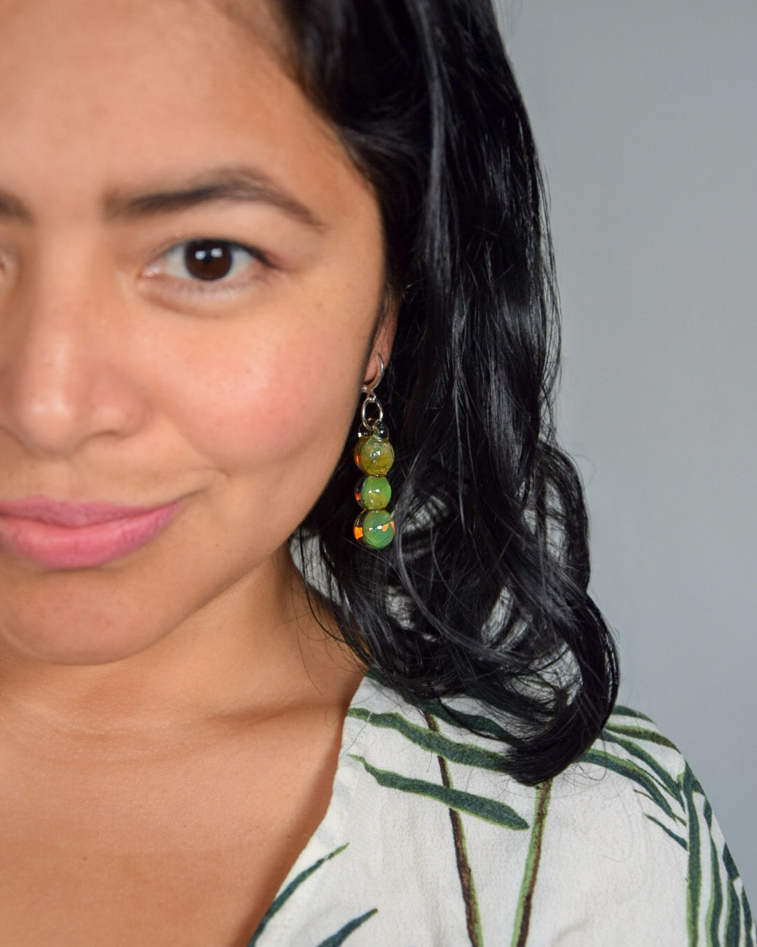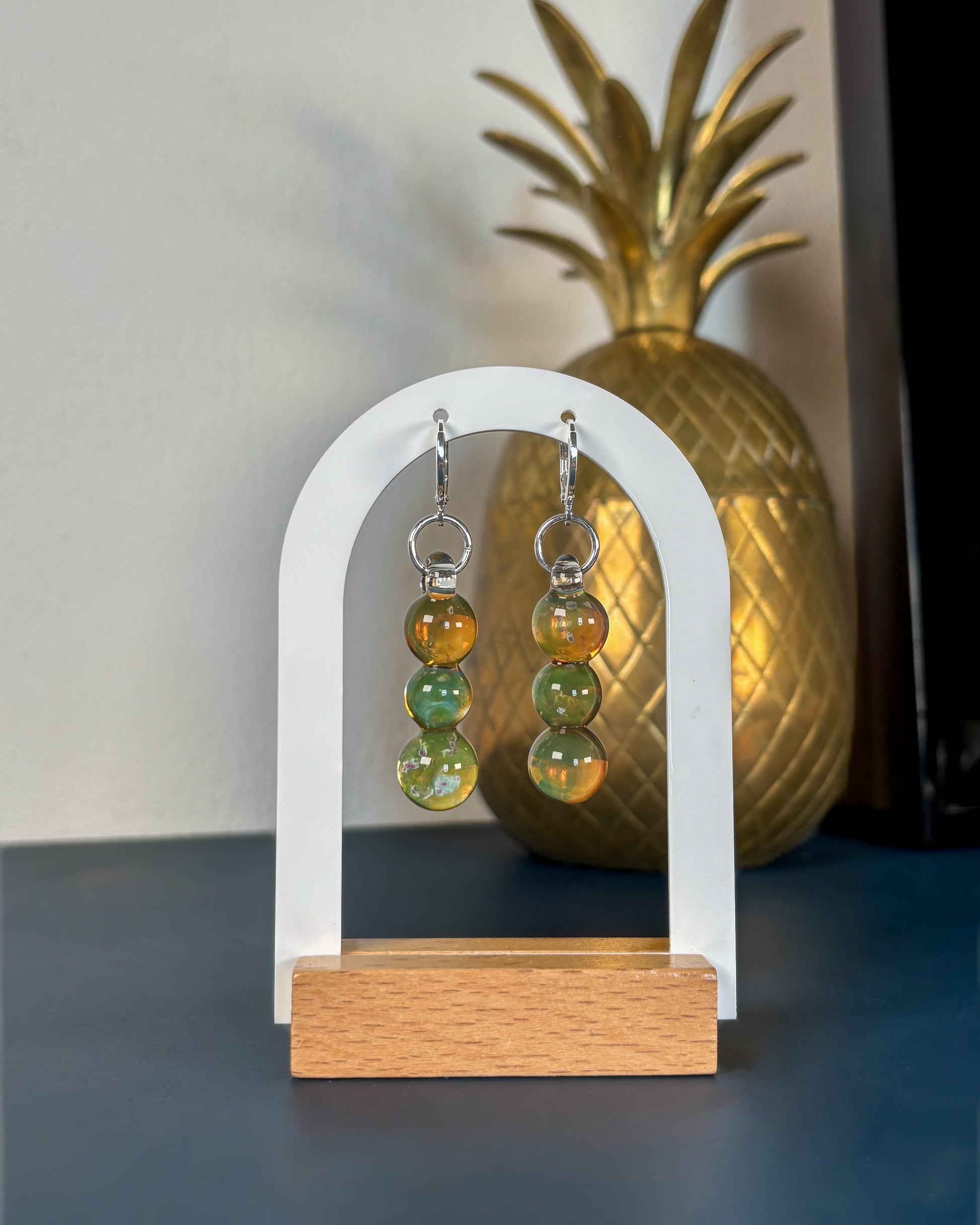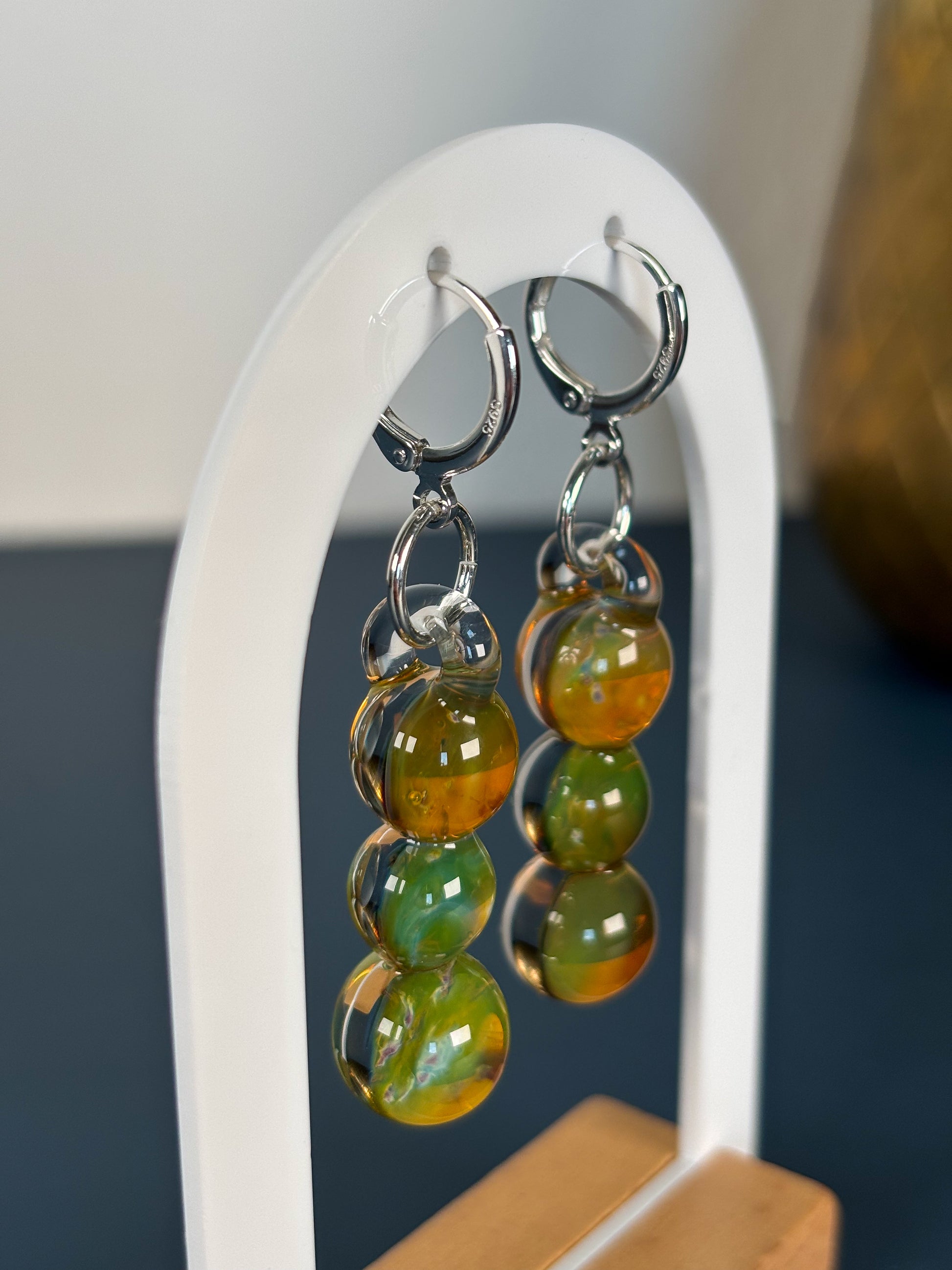 Die Green Universe Trio Earrings sind handgefertigte Glasohrringe aus hochwertigem Borosilikatglas. Drei kleine Glaskugeln bilden jeweils einen Ohrring, jede Kugel wirkt wie ein eigenes Mini-Universum mit Tiefe, Bewegung und Lichtspiel.