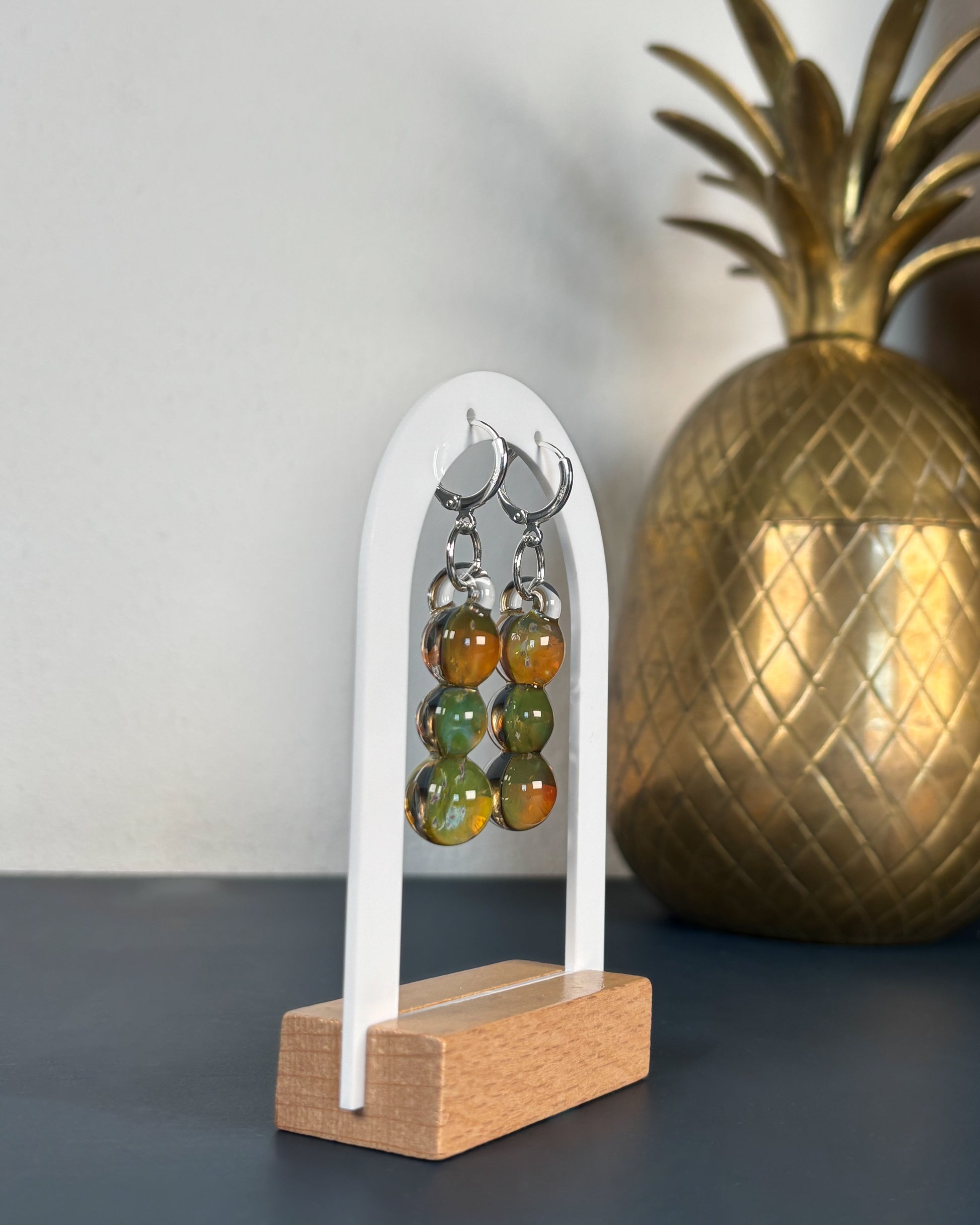 Das Glas schimmert in lebendigen Grüntönen mit Nuancen von Gelb und Gold. Je nach Lichteinfall verändert sich das Farbspiel und verleiht den Ohrringen Wärme und eine besondere Tiefe. Trotz ihrer Präsenz sind sie angenehm zu tragen und wirken elegant wie ausdrucksstark.
