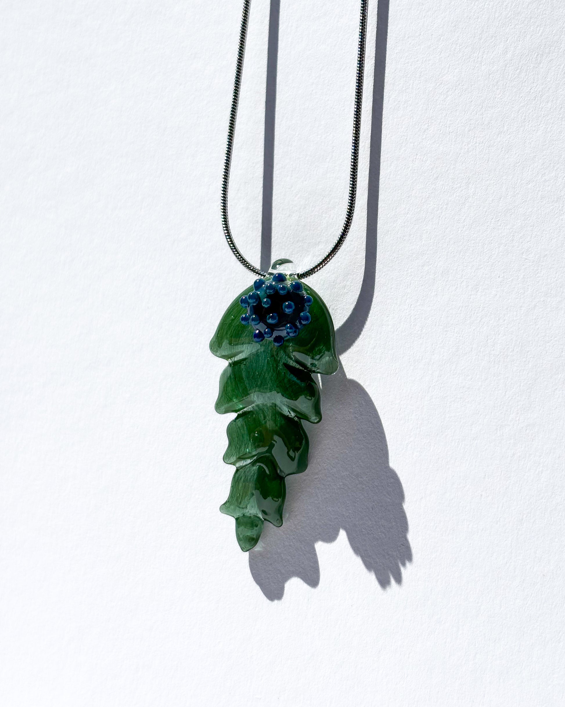 Das Glas wird von mir in traditioneller Lampwork-Technik gefertigt und steht klar im Mittelpunkt des Designs. Getragen an einer schlichten Edelstahlkette wirkt der Anhänger modern, reduziert und zeitlos, ein Schmuckstück für alle, die handgefertigte Glaskunst schätzen.