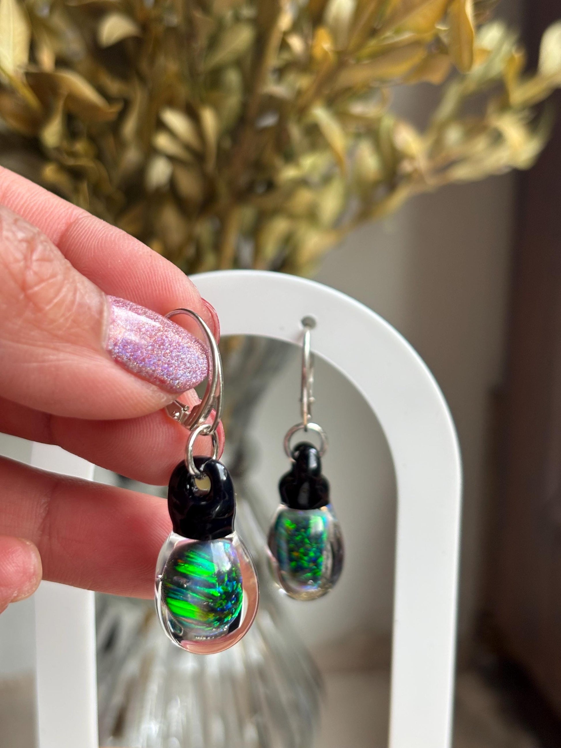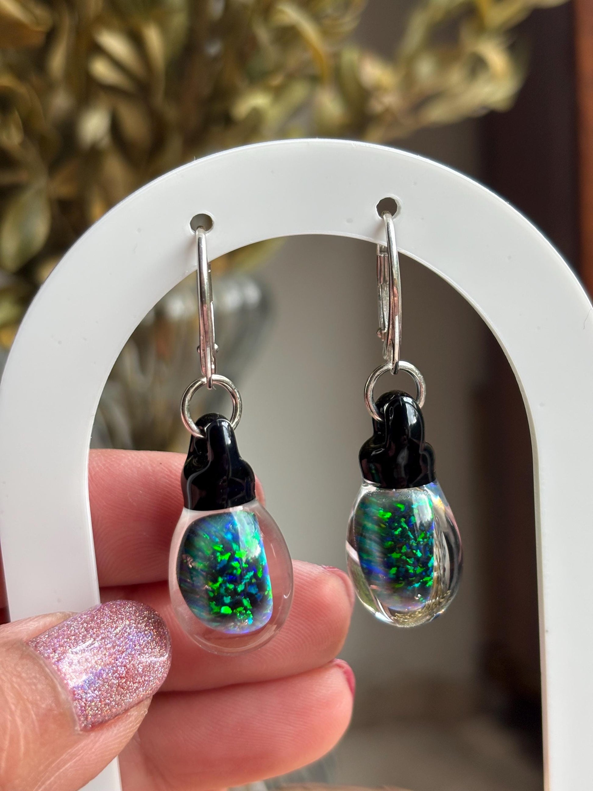 Diese handgefertigten Glasohrringe vereinen klares Borosilikatglas mit großen schwarzen synthetischen Opalen von ca. 12 mm Durchmesser. Die Opale werden sorgfältig in massives Glas eingeschmolzen und an hochwertigen Ohrhaken aus 925er Silber getragen – eine Kombination aus Präzision, Materialqualität und zeitlosem Design.