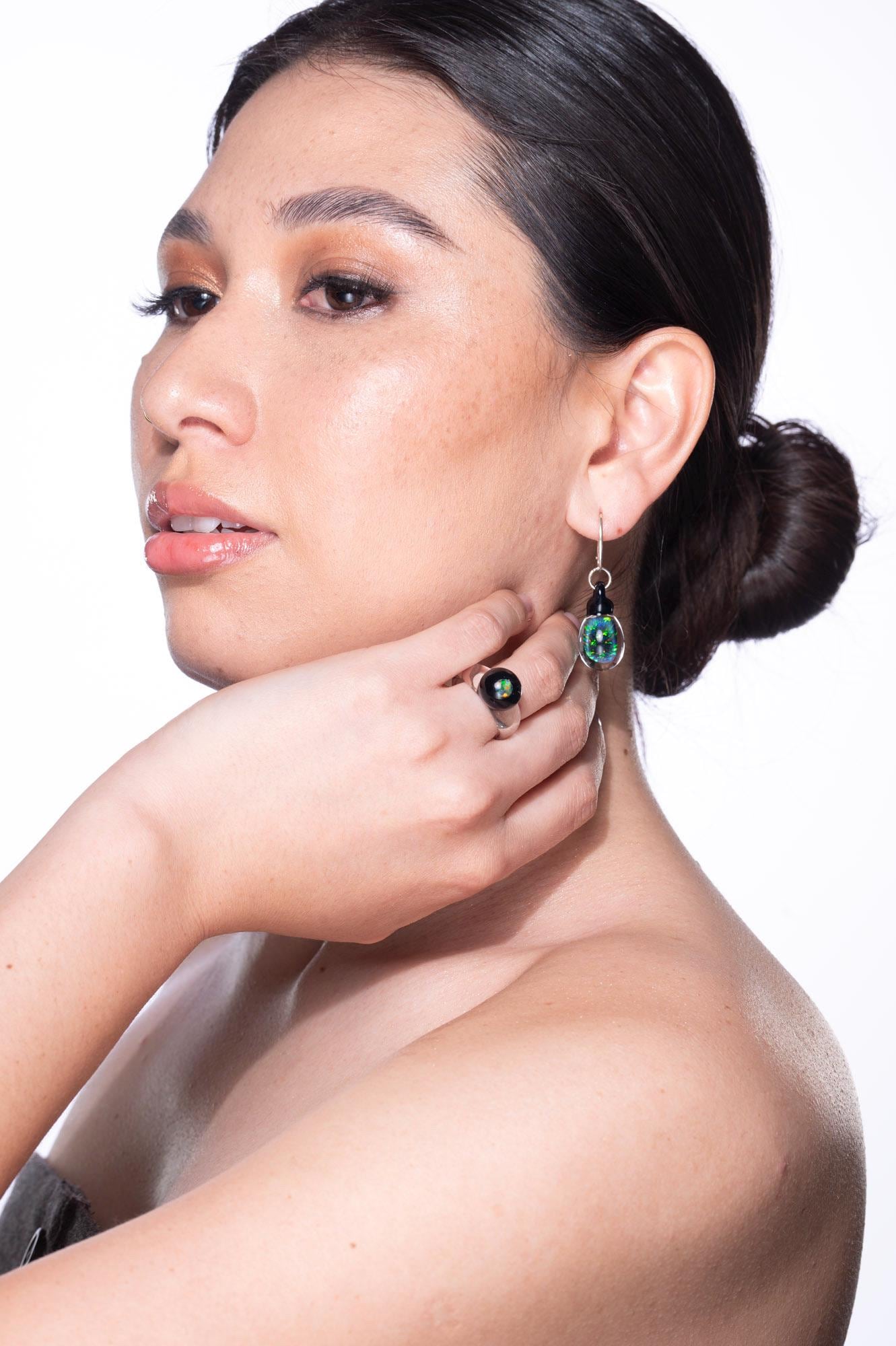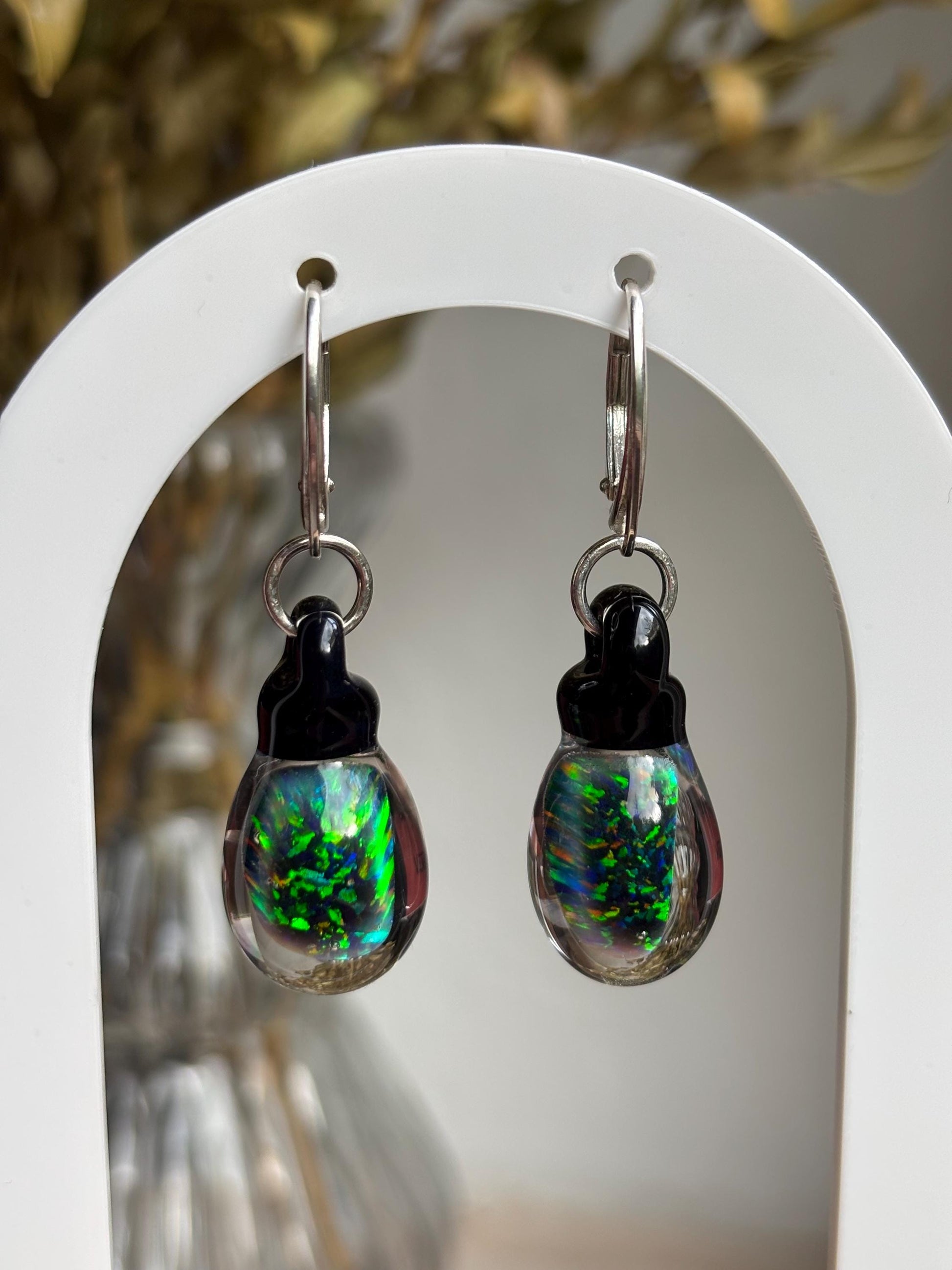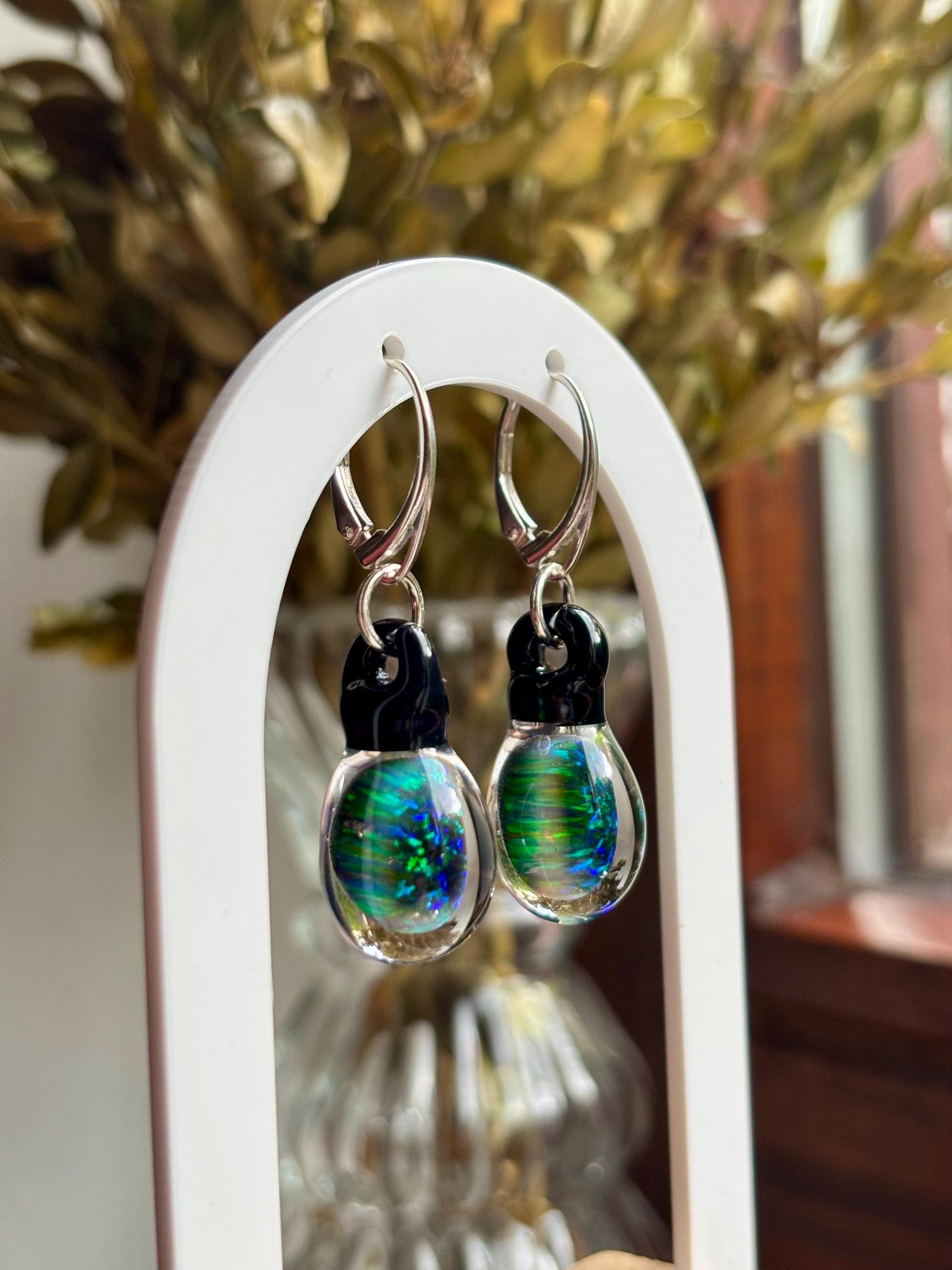 Das tiefe Schwarz der Opale zeigt ein intensives, schillerndes Farbspiel, das je nach Lichteinfall lebendig wirkt. In Verbindung mit dem klaren Glas entsteht ein starker Kontrast, der die Opale optisch schweben lässt und den Ohrringen eine elegante, moderne Präsenz verleiht.