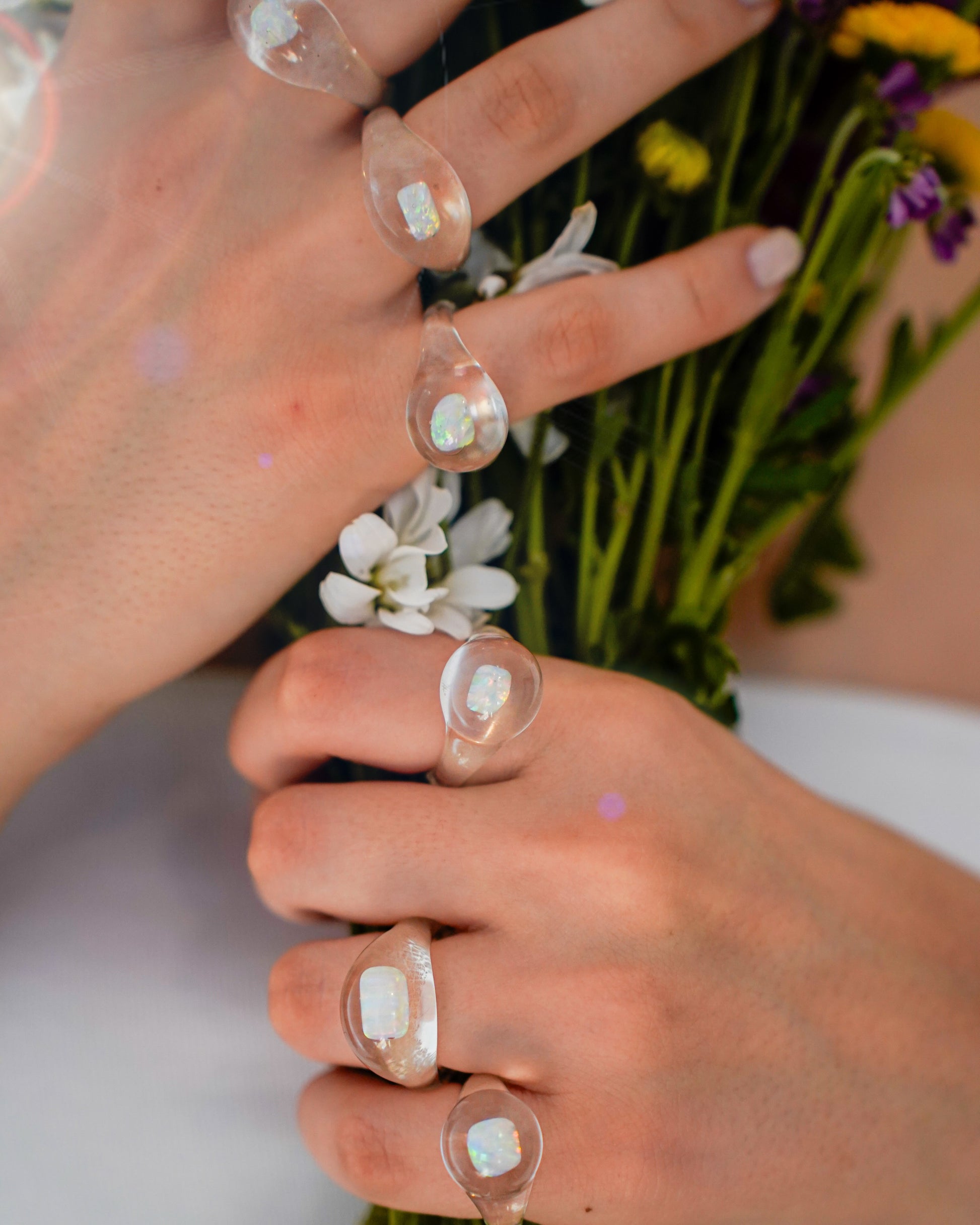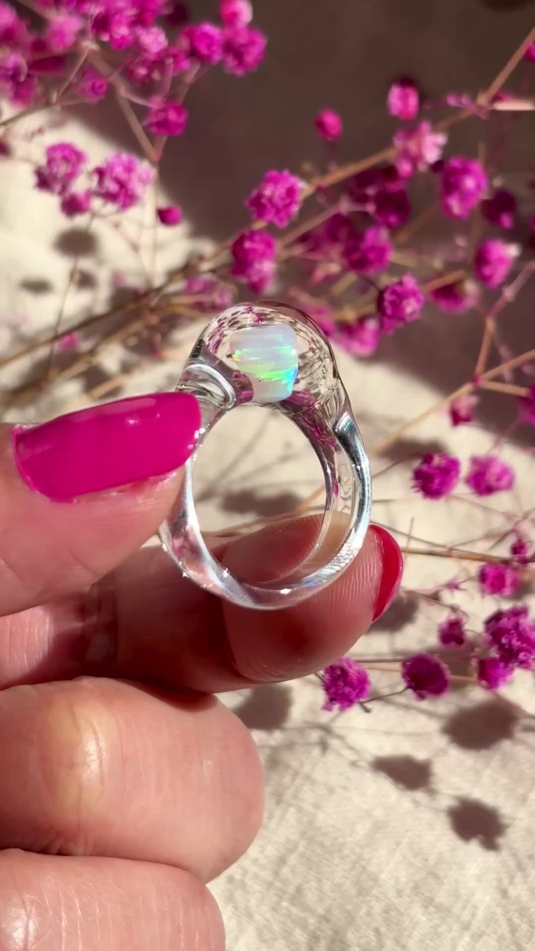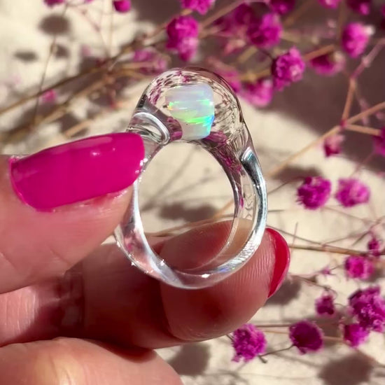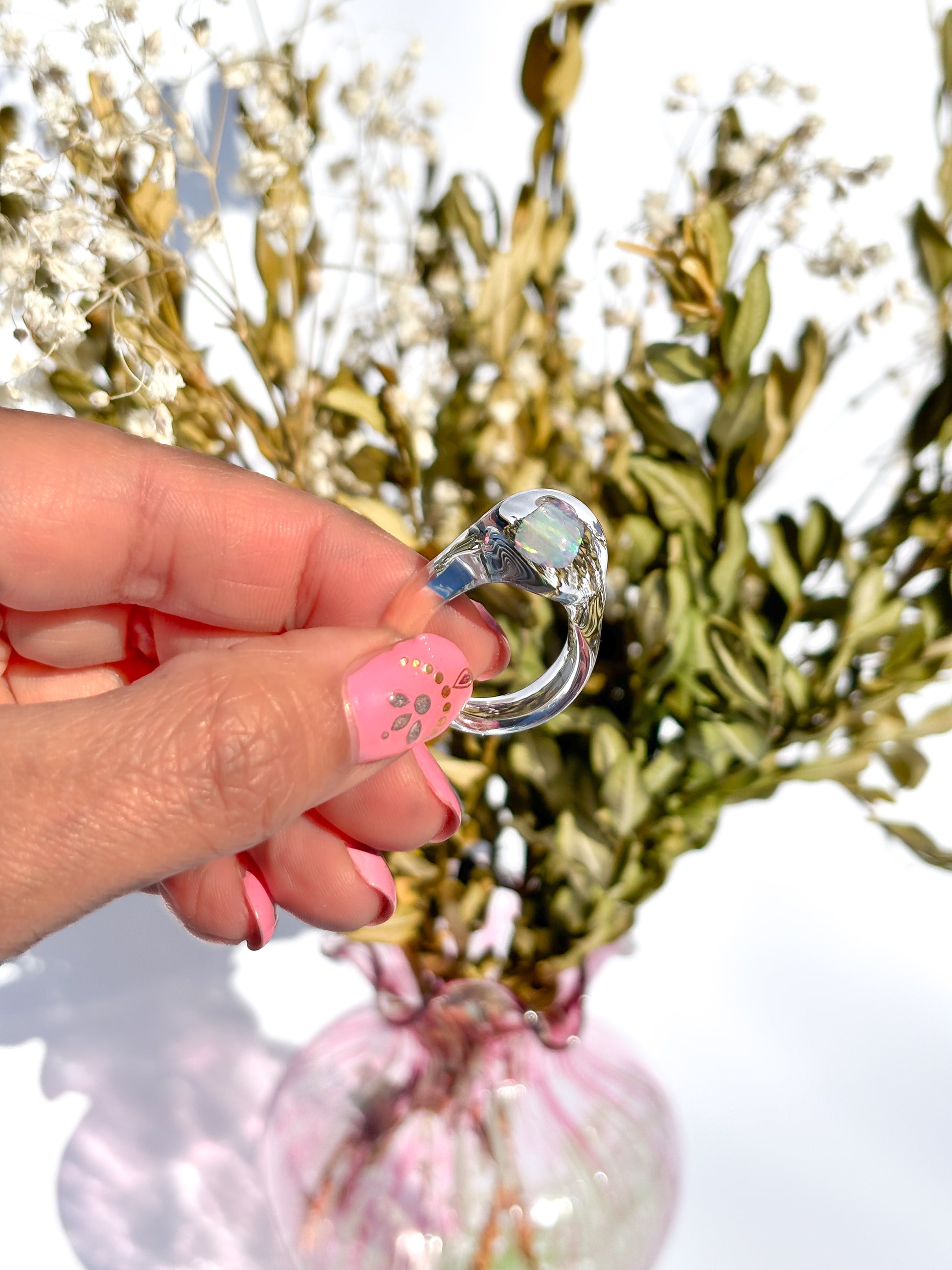 Dieser handgefertigte Glasring verbindet klares, hochwertiges Borosilikatglas mit einem faszinierenden Gilson-Opal. Der extra große Opal misst etwa 4–5 mm und entfaltet ein lebendiges Farbspiel, das sich je nach Lichteinfall ständig verändert.