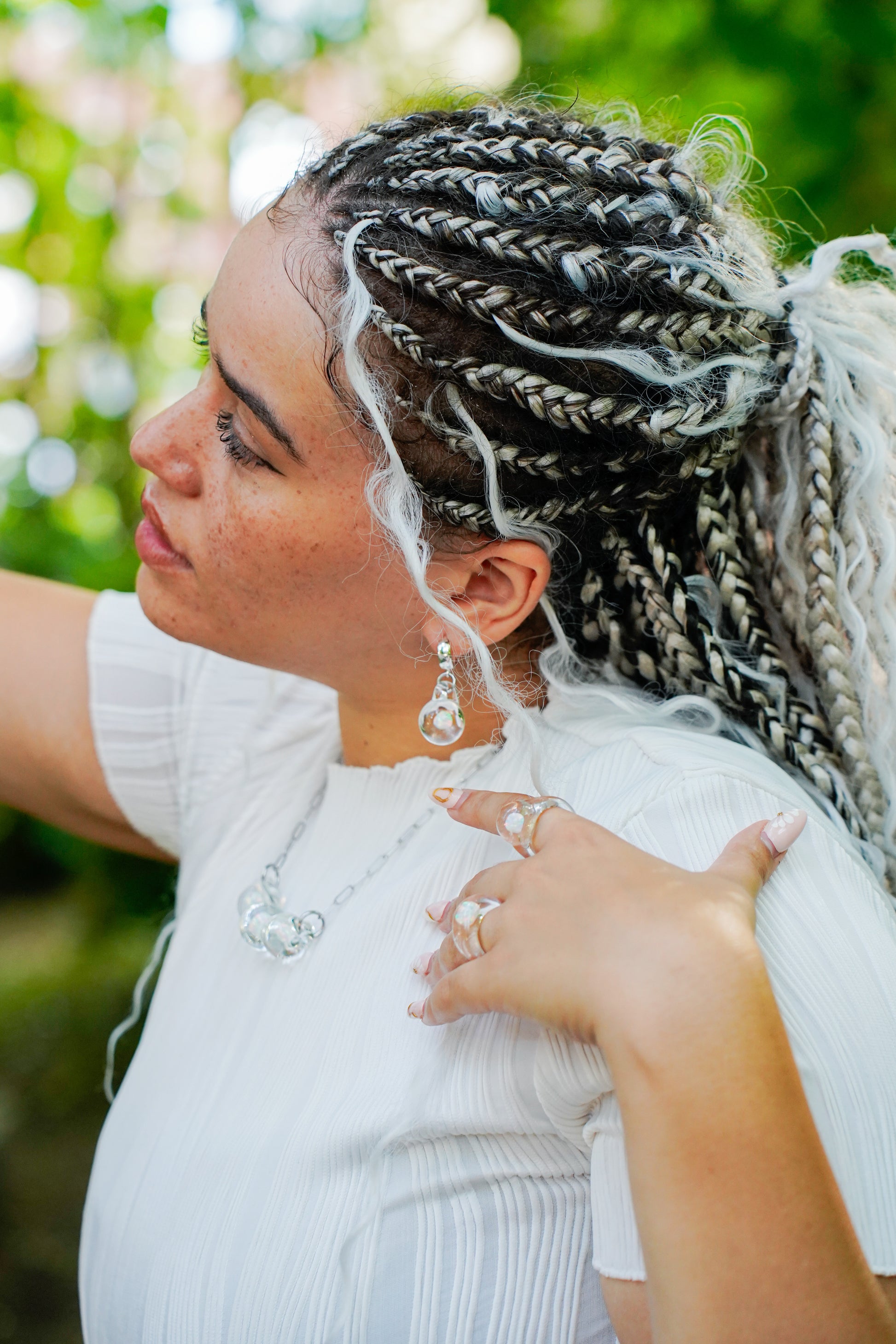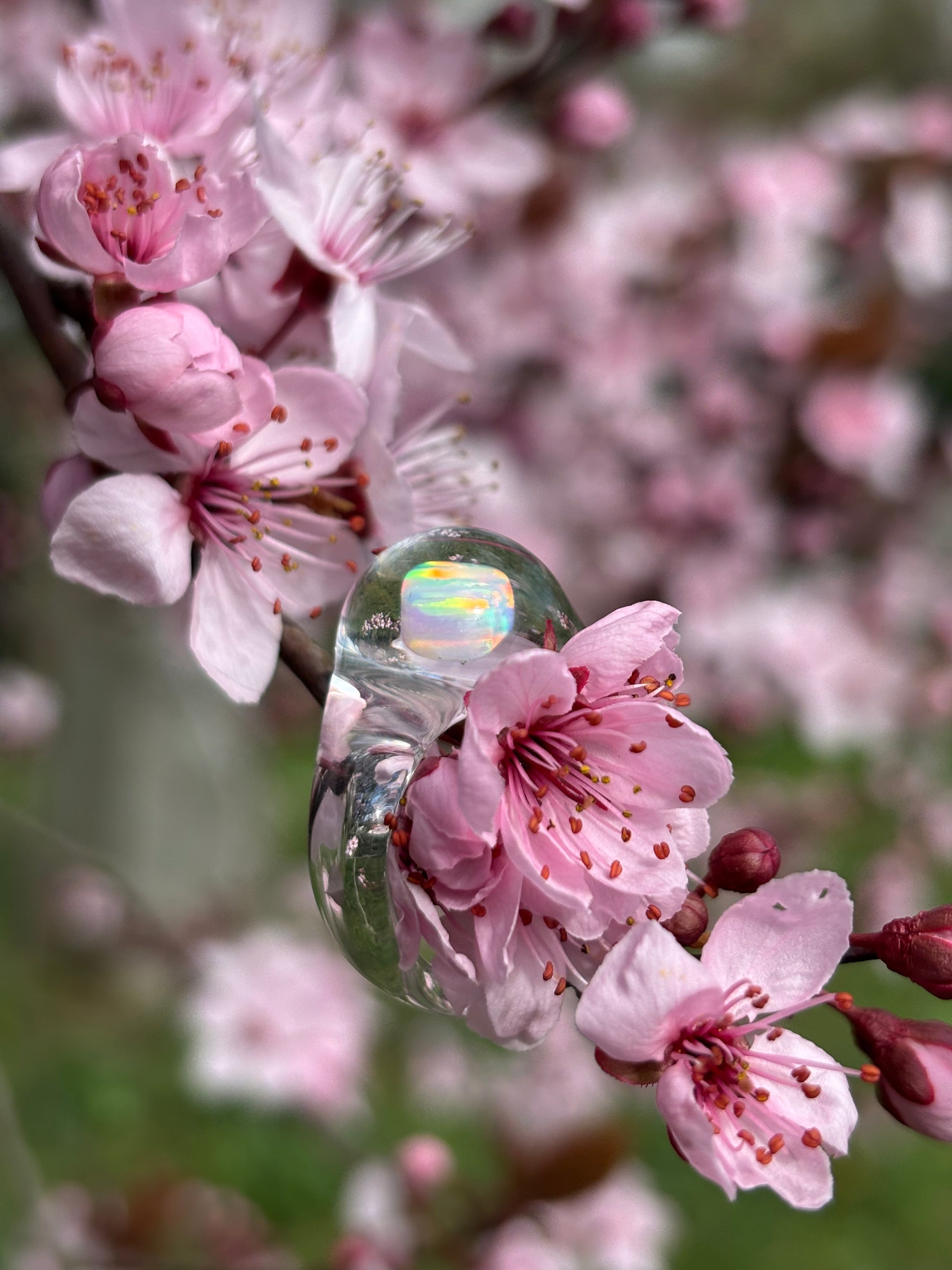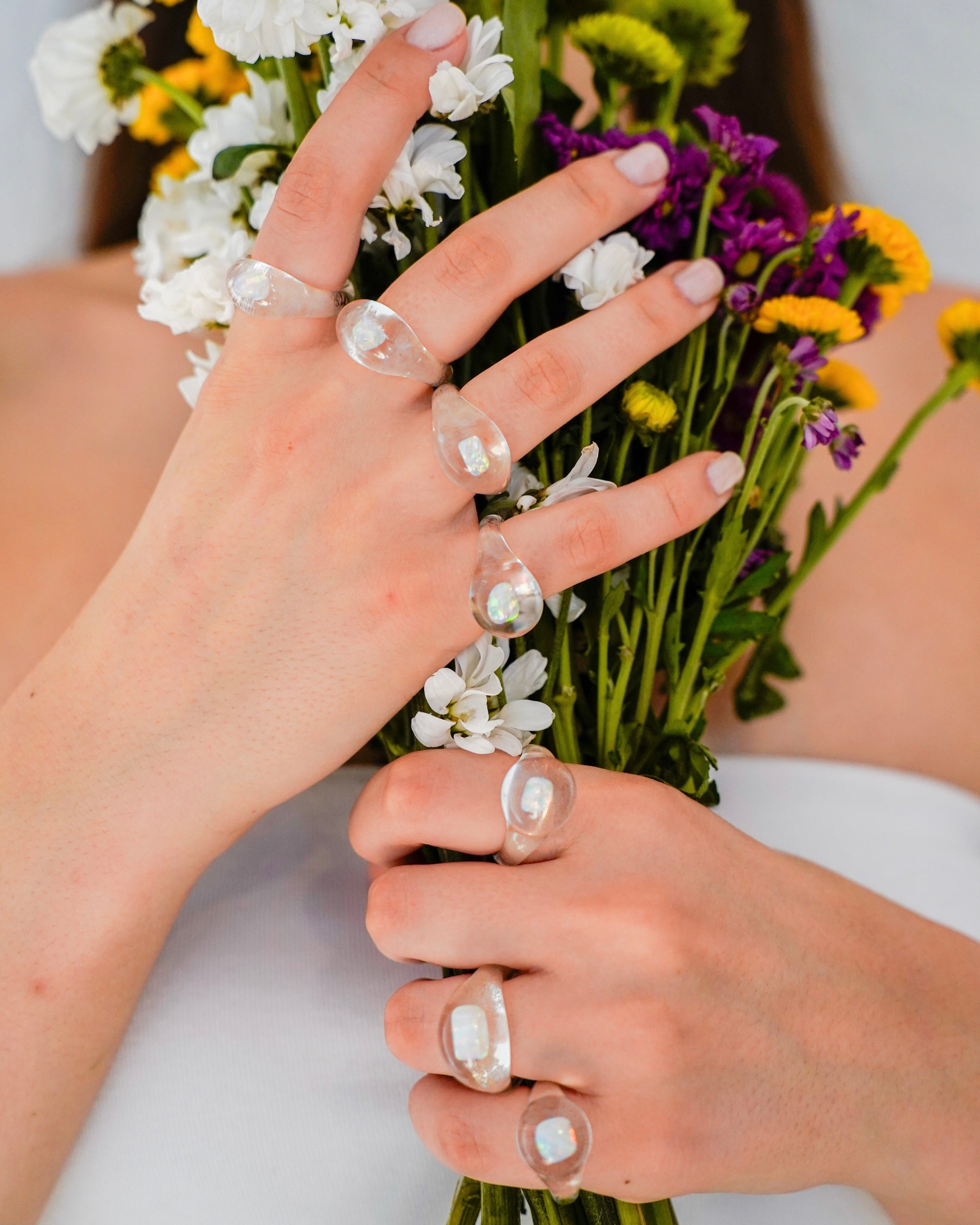 Dieser handgefertigte Glasring verbindet klares, hochwertiges Borosilikatglas mit einem faszinierenden Gilson-Opal. Der extra große Opal misst etwa 4–5 mm und entfaltet ein lebendiges Farbspiel, das sich je nach Lichteinfall ständig verändert.