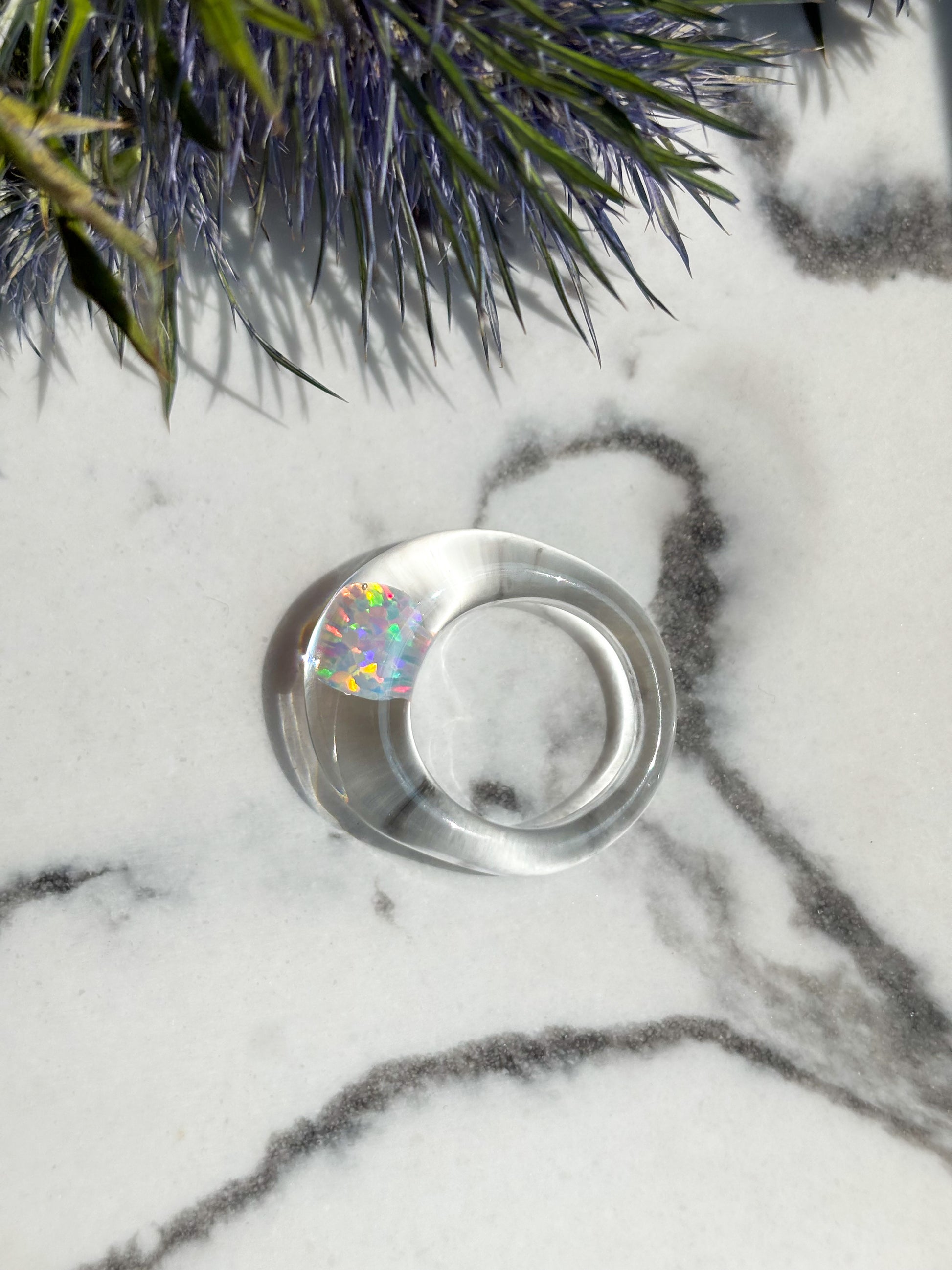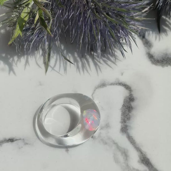 Zart, modern und minimalistisch: Der Ring „Lite Dome“ kombiniert klares Borosilikatglas mit einem schimmernden Gilson-Opal (ca. 3–4 mm). Die besonders kleine, flach gewölbte Glaskuppel verschmilzt optisch mit dem Ringkörper – für einen dezenten, eleganten Look mit Tiefe.