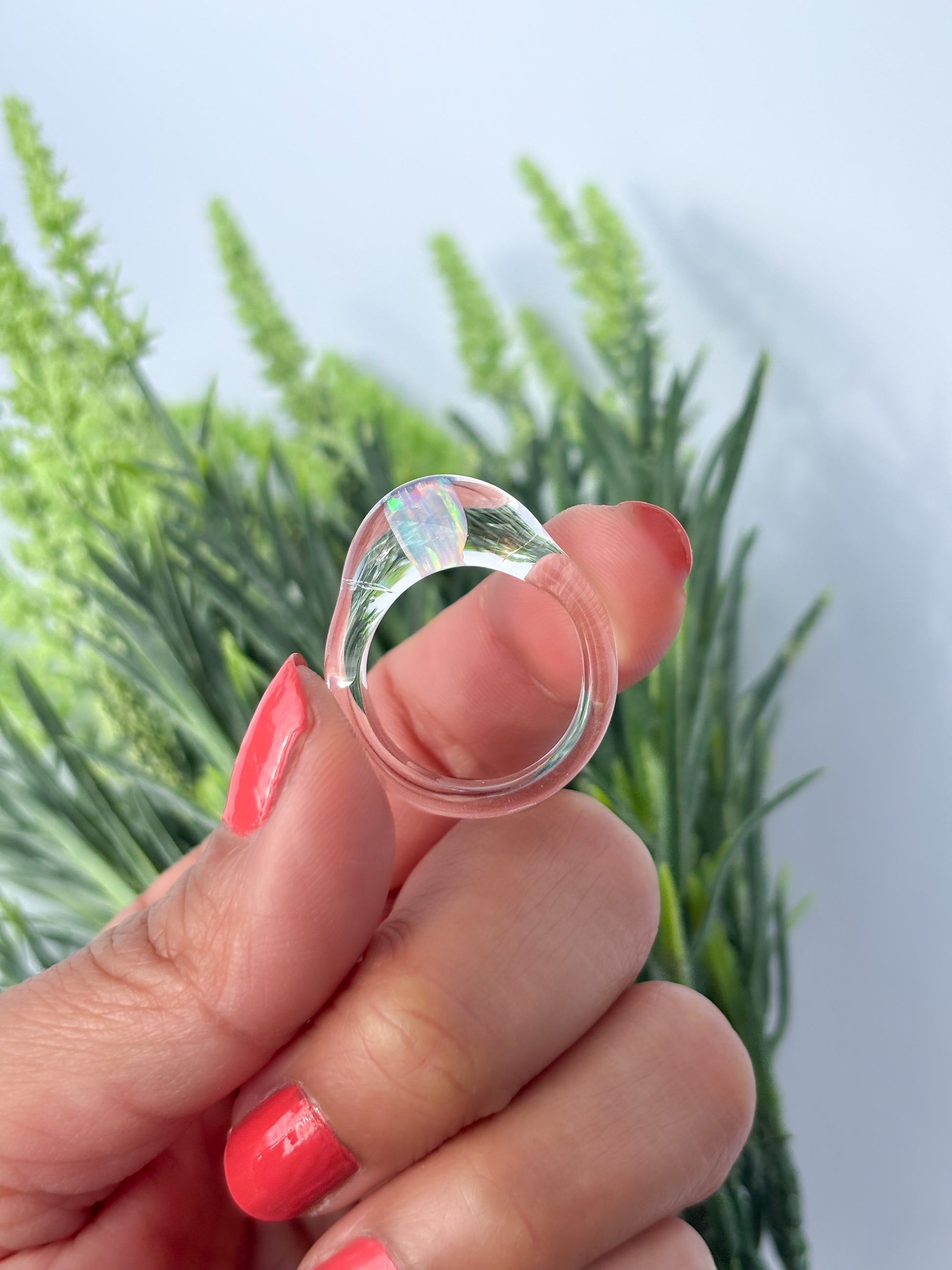 Ein eleganter Ring aus klarem Borosilikatglas mit einer sanft geformten, ovalen Glaskuppel. Der schimmernde Gilson-Opal (ca. 3–4 mm) entfaltet je nach Licht ein faszinierendes Farbspiel harmonisch, ausgewogen und mit magischer Tiefe.