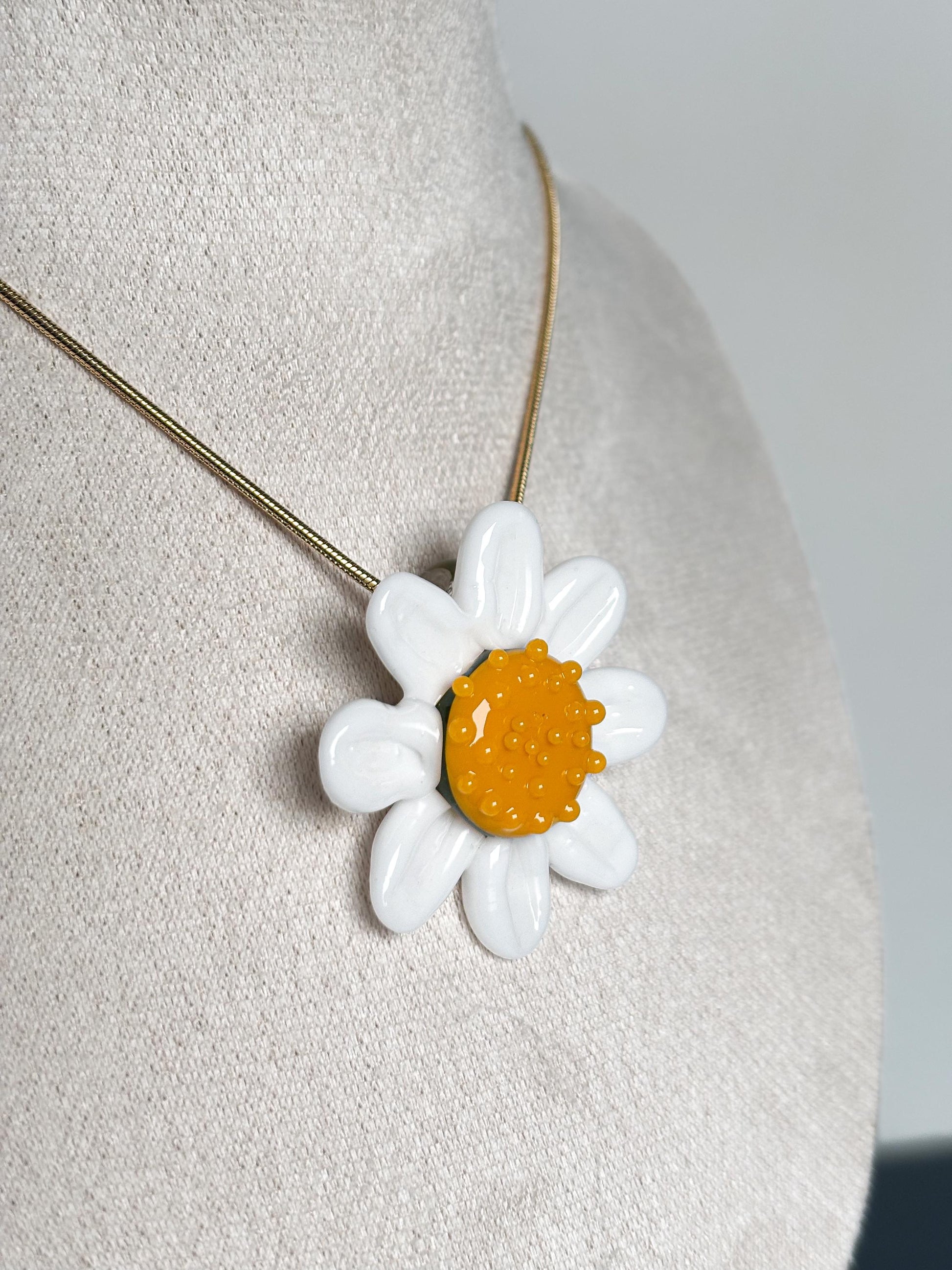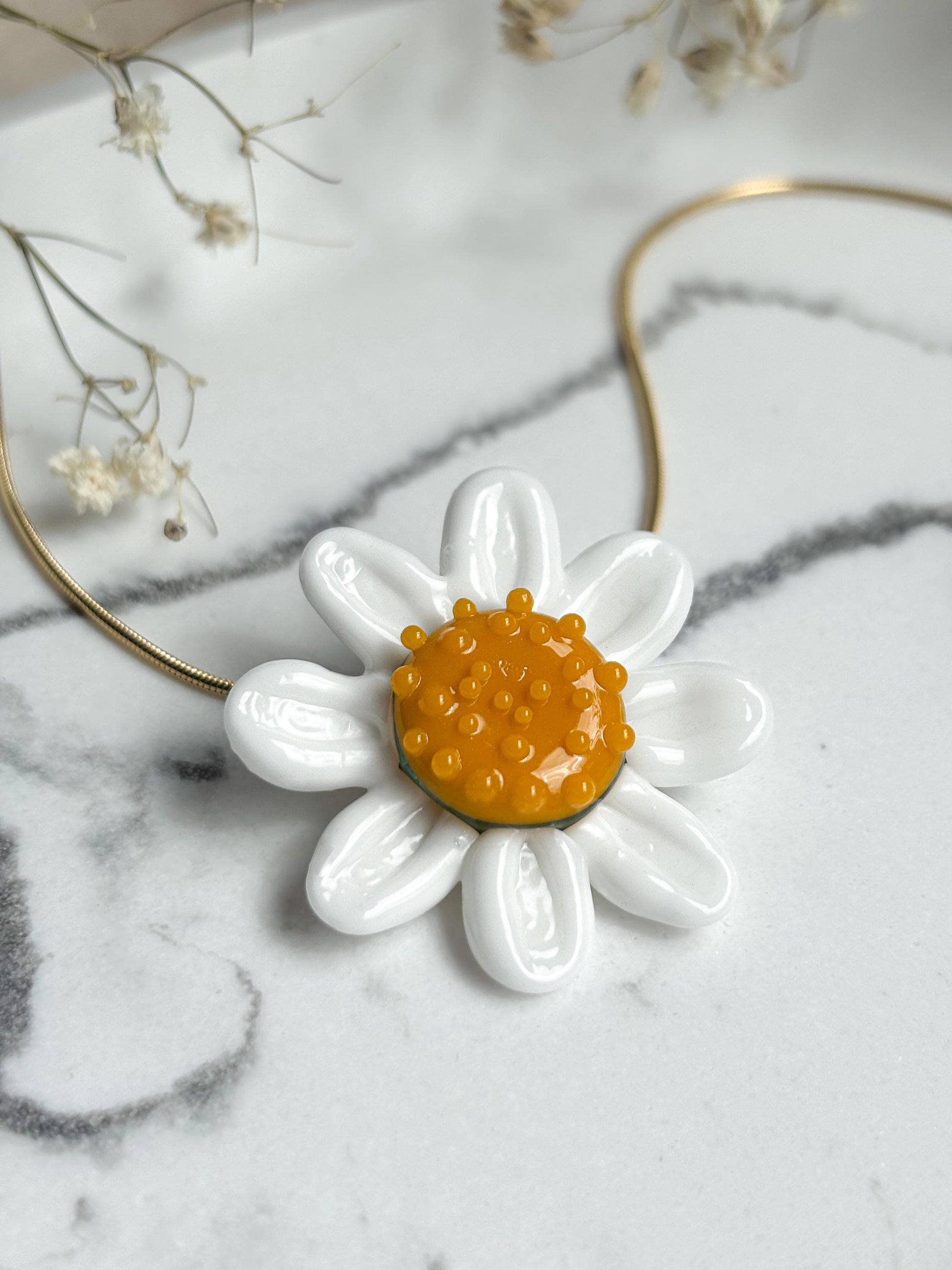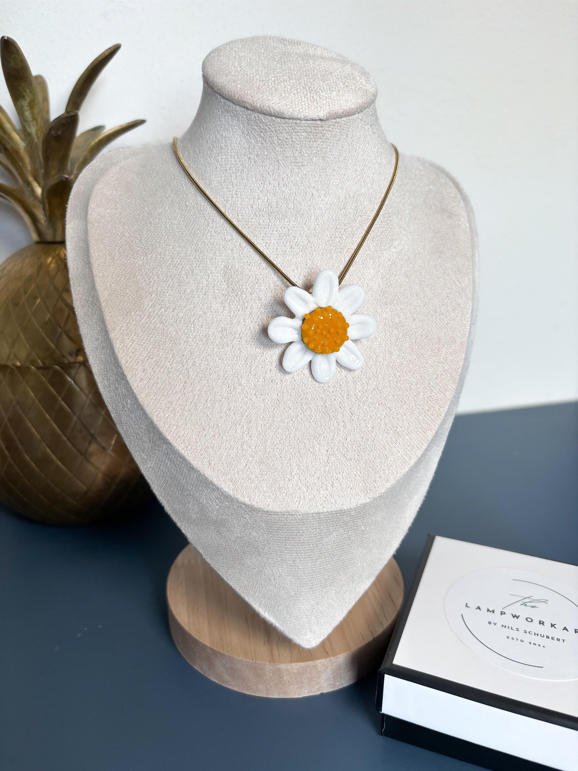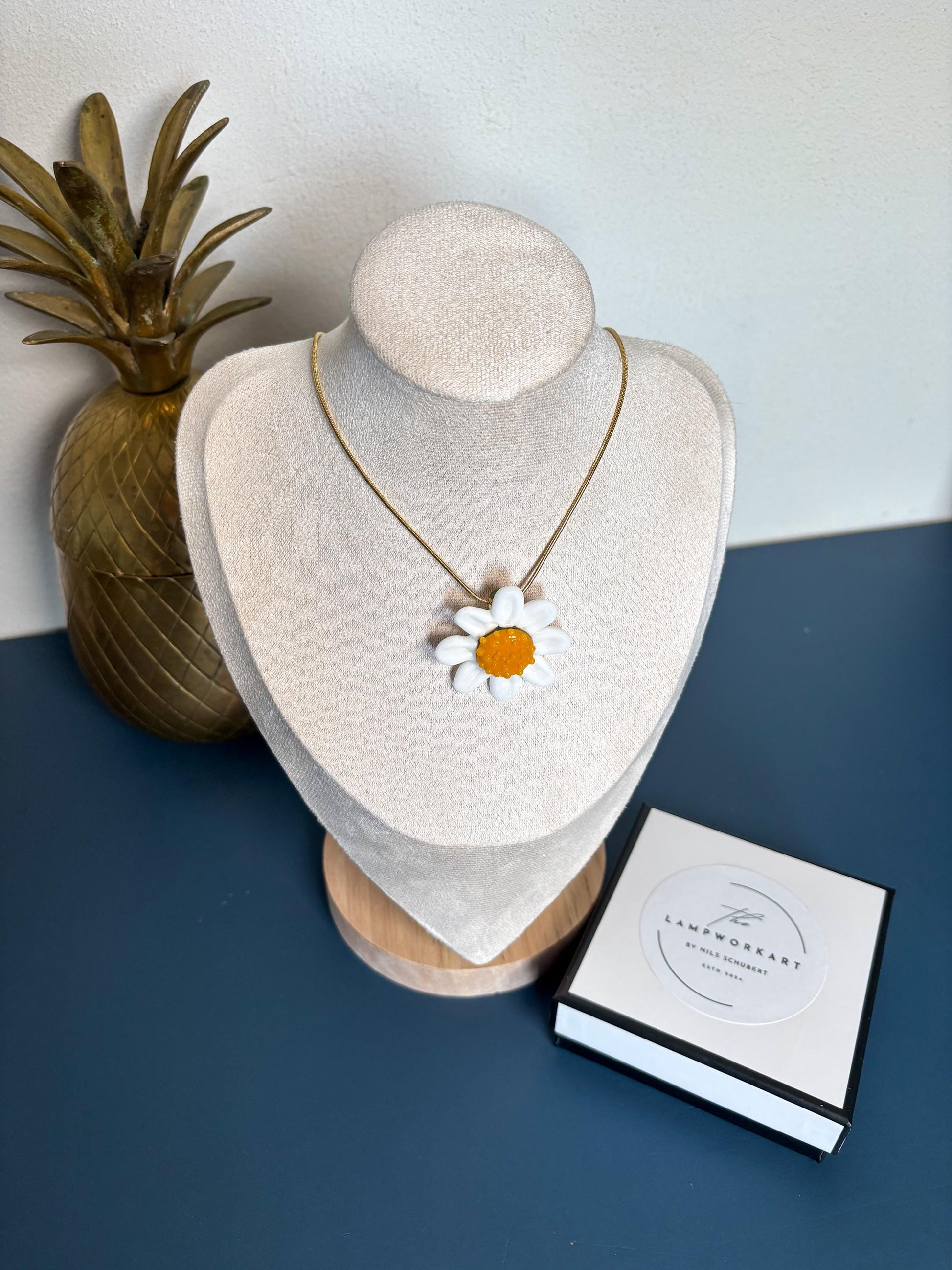 Jeder Anhänger wird erst nach deiner Bestellung in meinem Atelier gefertigt. Obwohl ich großen Wert darauf lege, jede Margerite so identisch wie möglich zu gestalten, lassen sich kleine Unterschiede in Form und Glasstruktur nicht vollständig vermeiden. Genau diese feinen Abweichungen machen den handwerklichen Charakter und die Einzigartigkeit jedes Stücks aus.