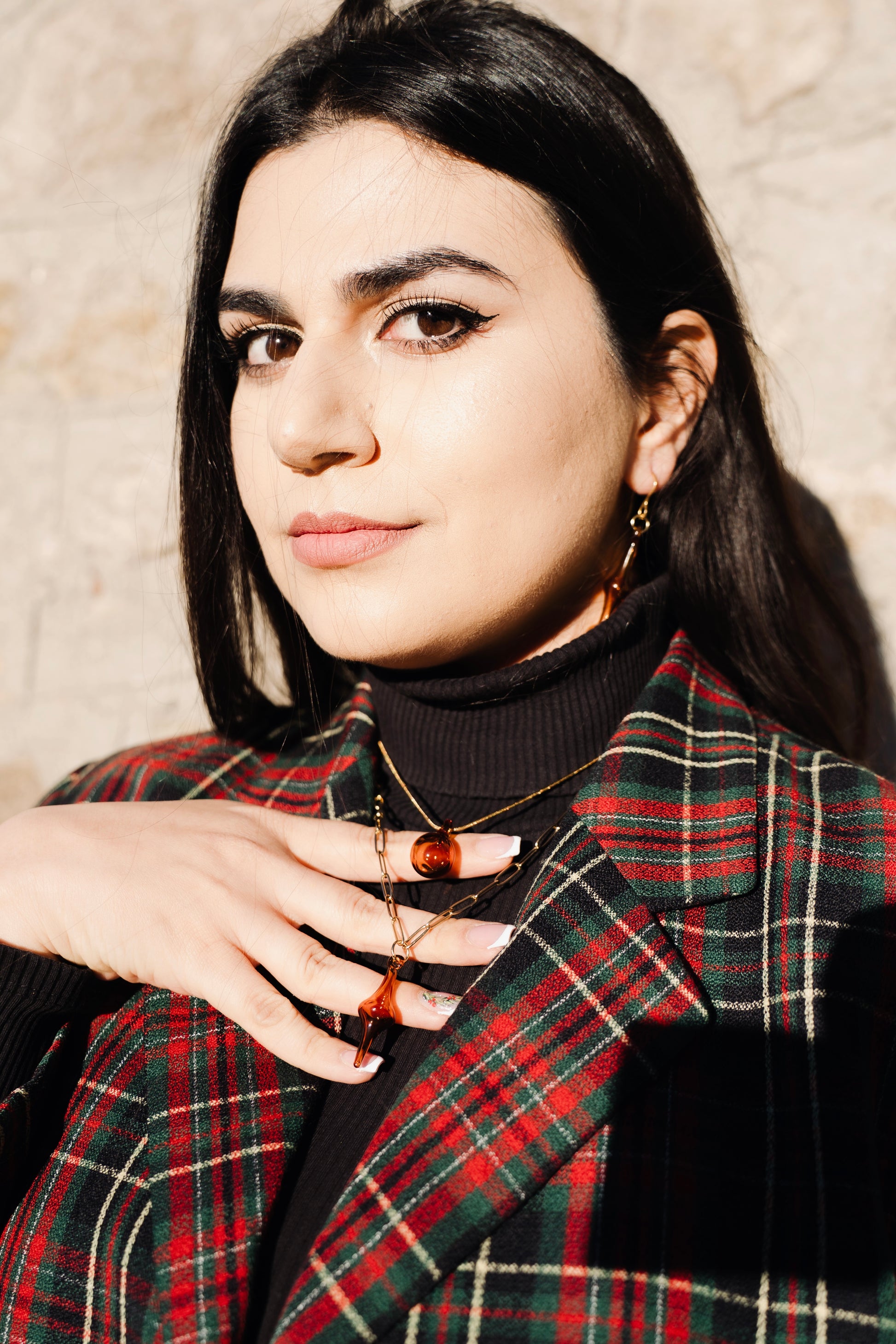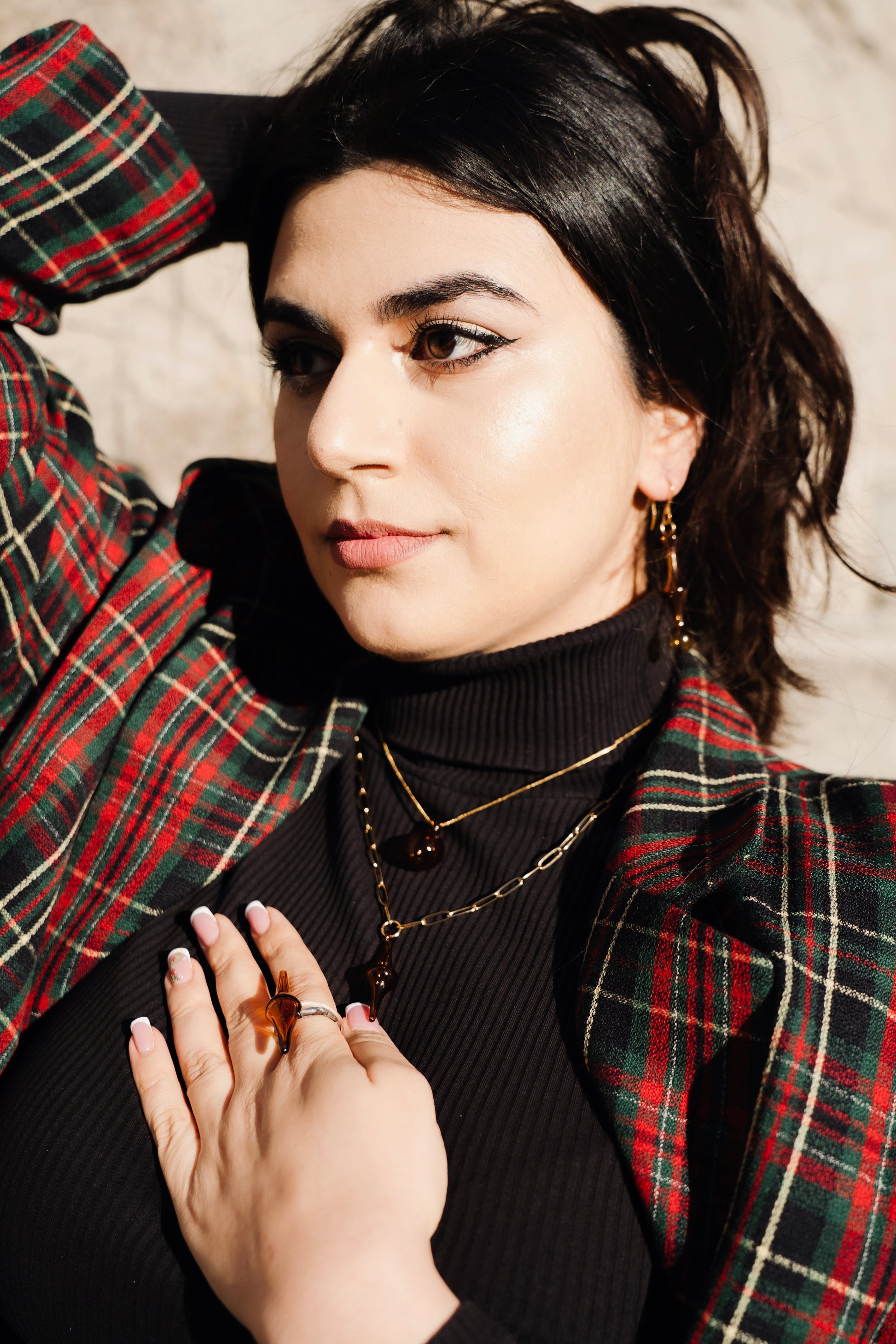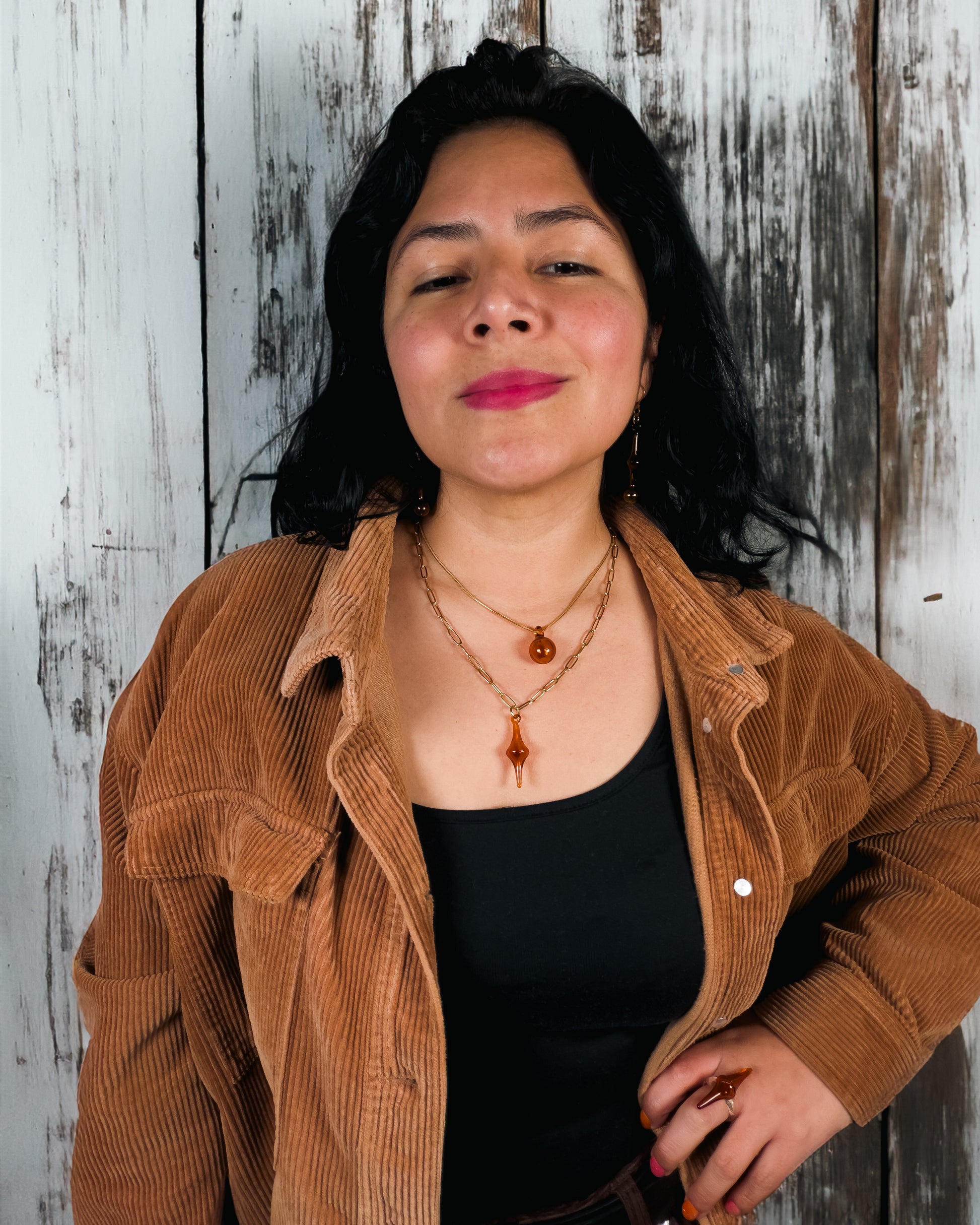Die Layer Kette besteht aus zwei vergoldeten Edelstahlketten (40 cm und 50 cm), die das Glas präzise rahmen. Der Ring greift die Form des Rhombus als zentrales Element auf und ergänzt das Set als eigenständiges Objekt.