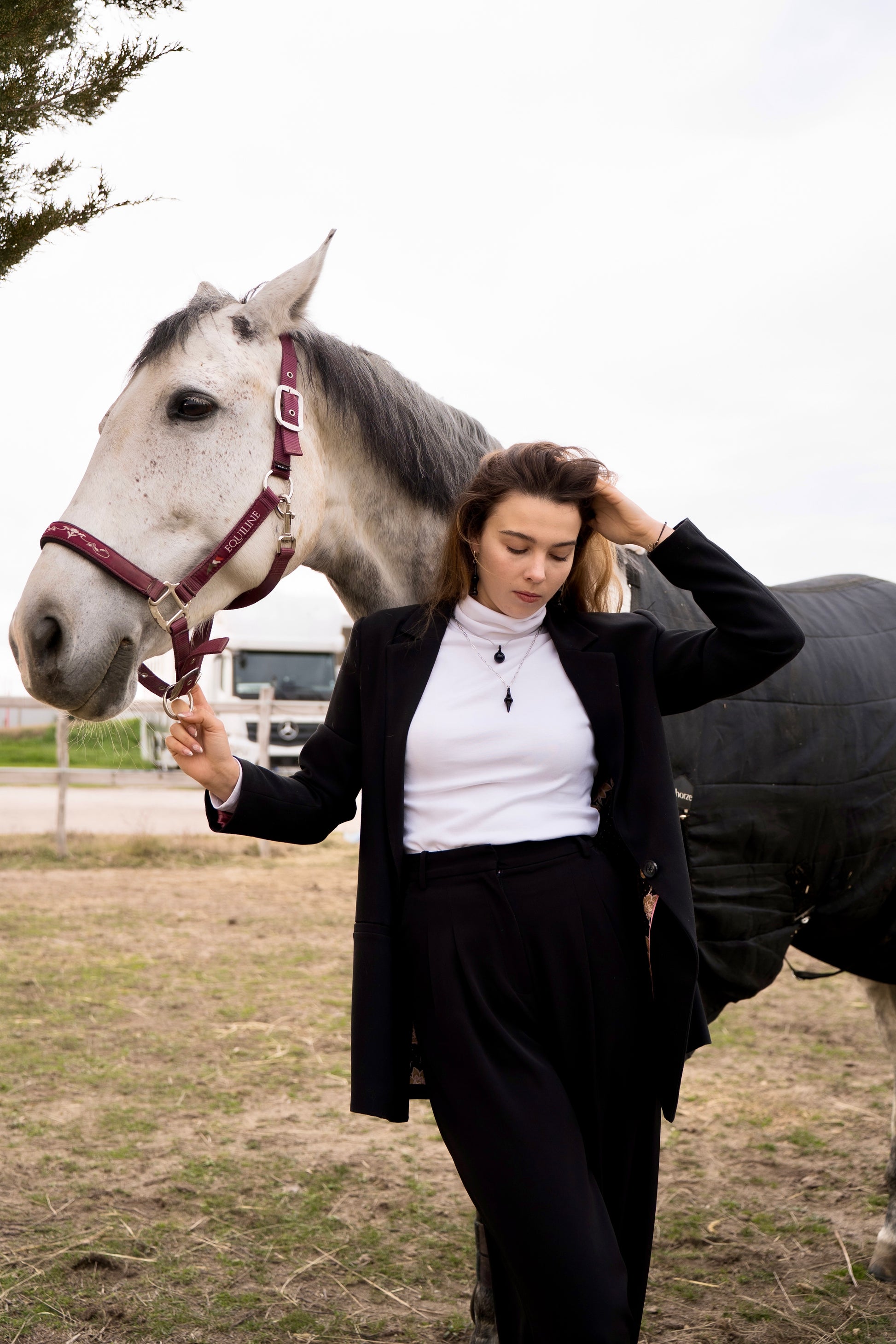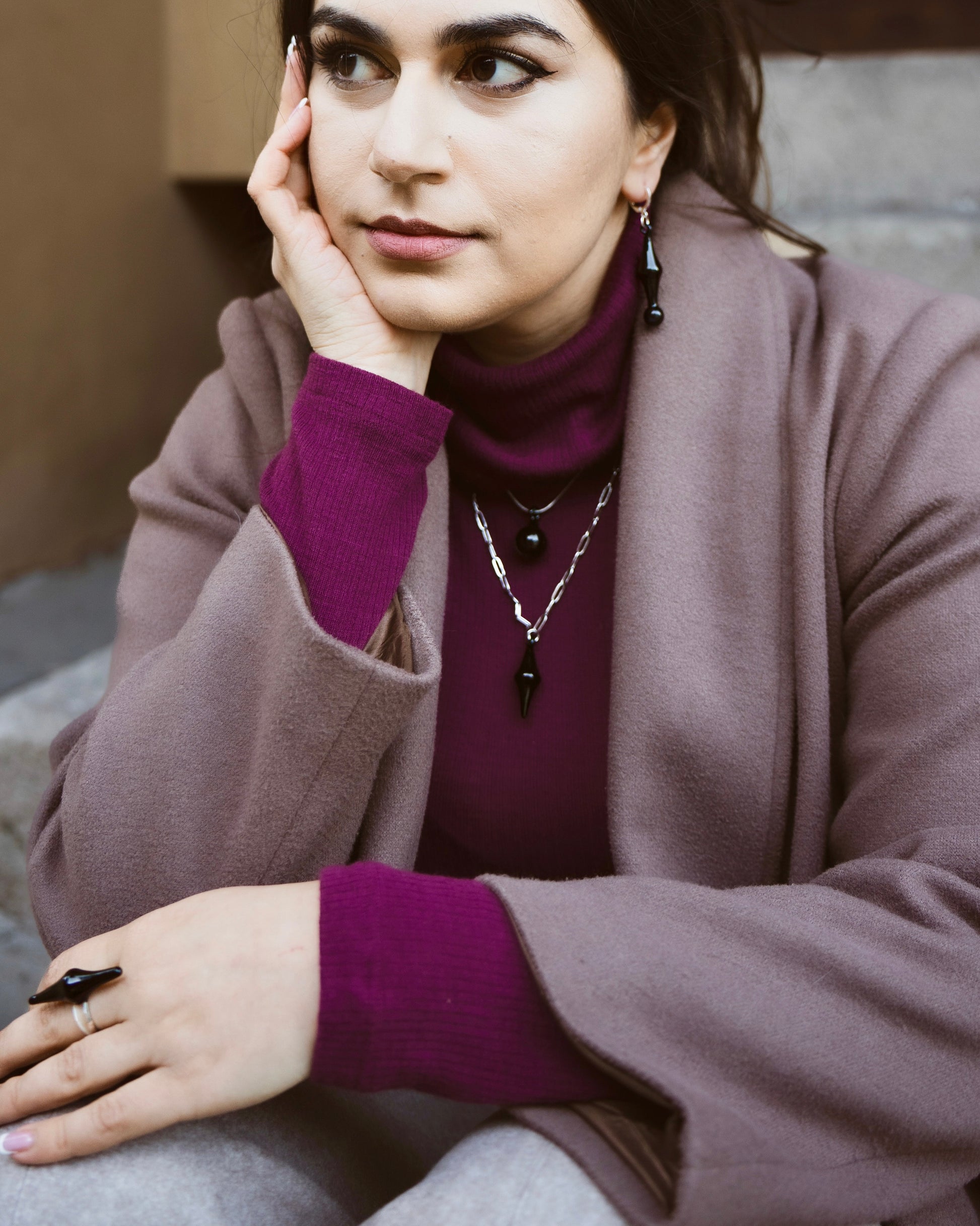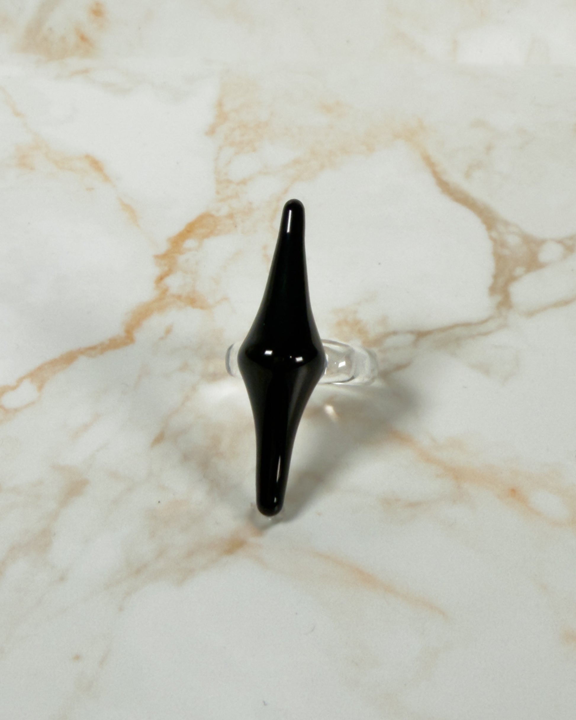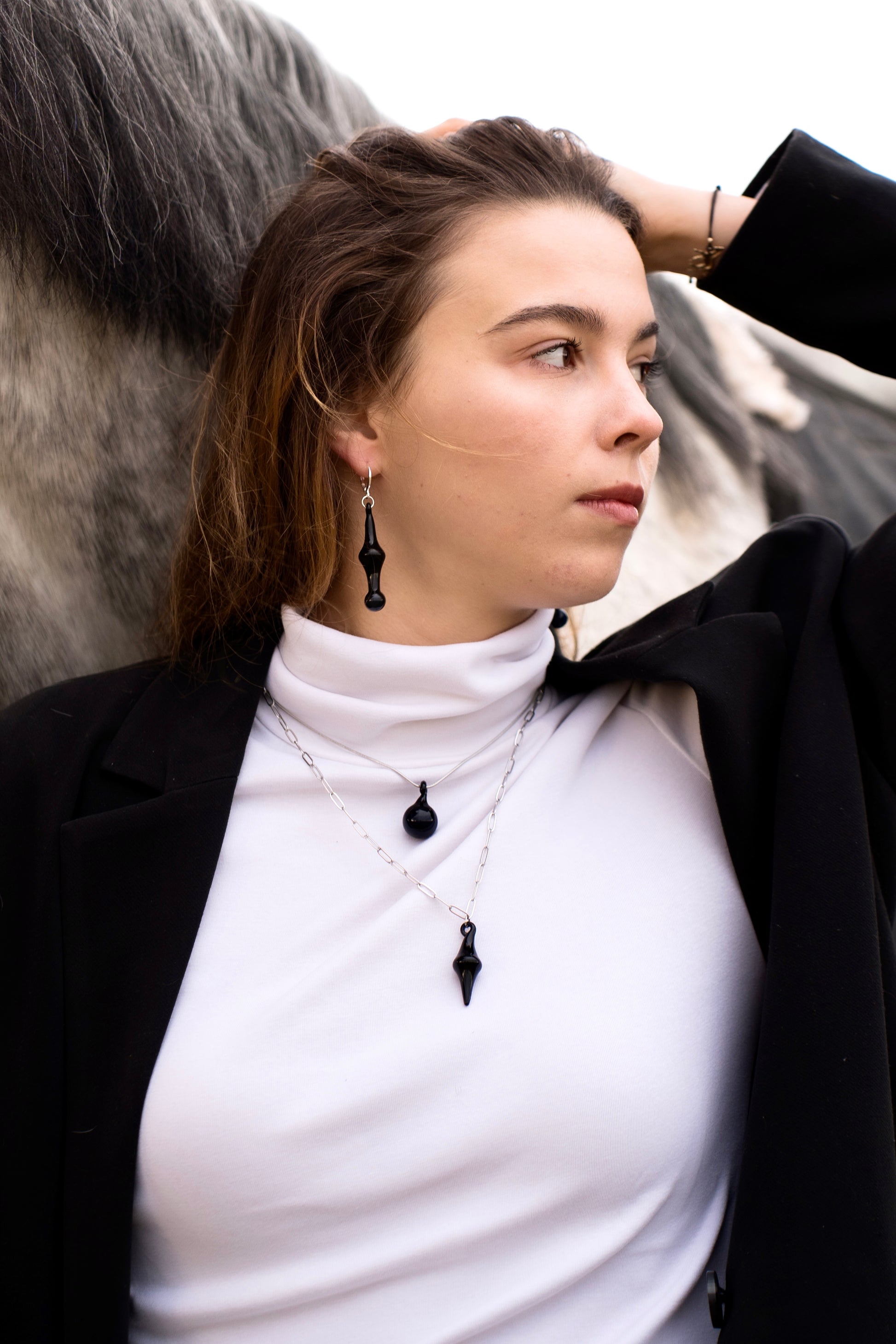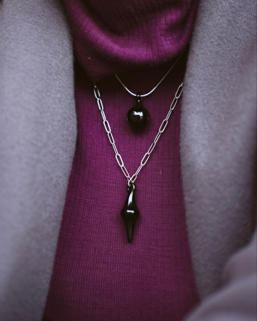 Die Layer Kette besteht aus zwei Edelstahlketten (40 cm und 50 cm), die einen klaren Kontrast zum tiefschwarzen Glas bilden. Der Ring greift den Rhombus als zentrales Element auf und ergänzt das Set als eigenständiges, skulpturales Objekt.
