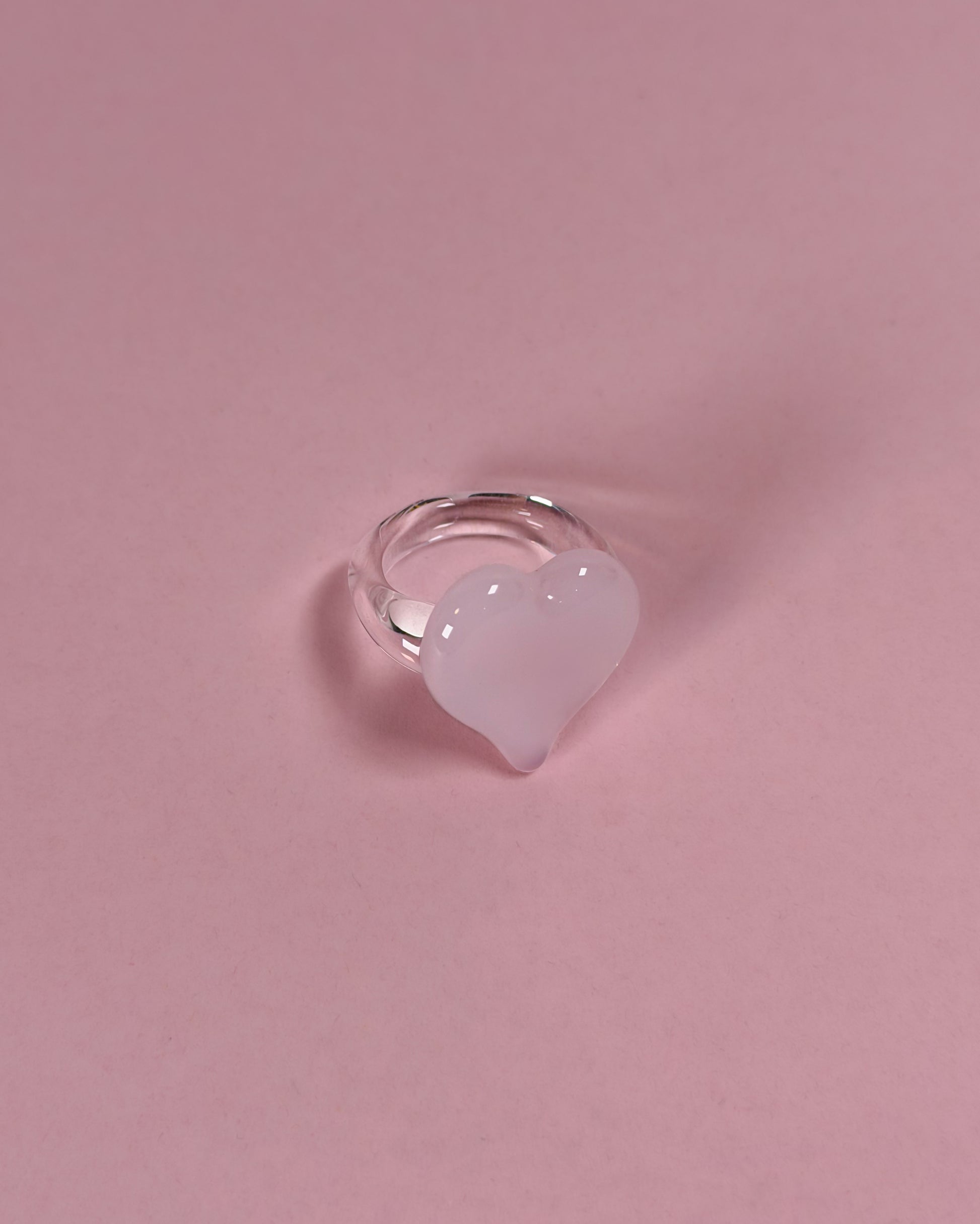 Die voluminösen Formen bleiben außergewöhnlich leicht und wirken schwebend am Körper. Das milchig-transluzente Rosa reagiert subtil auf Licht und Bewegung und verleiht dem Glas Tiefe und weiche Reflexionen.
