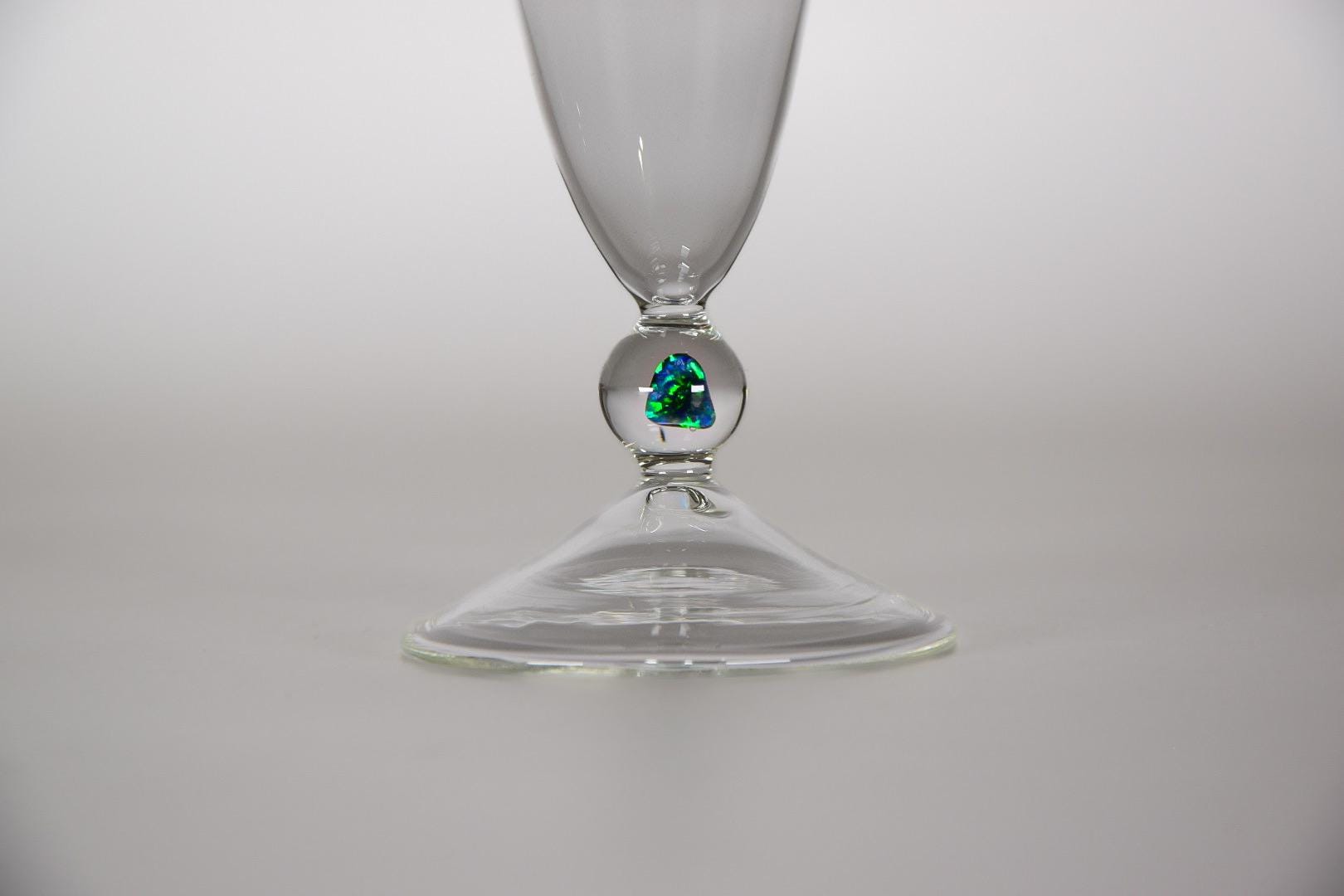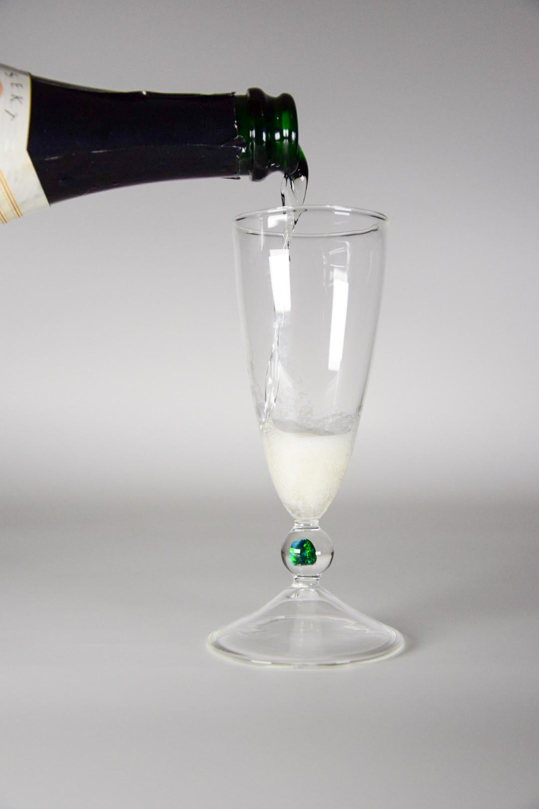 Elegantes, handgefertigtes Sektglas mit eingeschlossenem schwarzem Opal