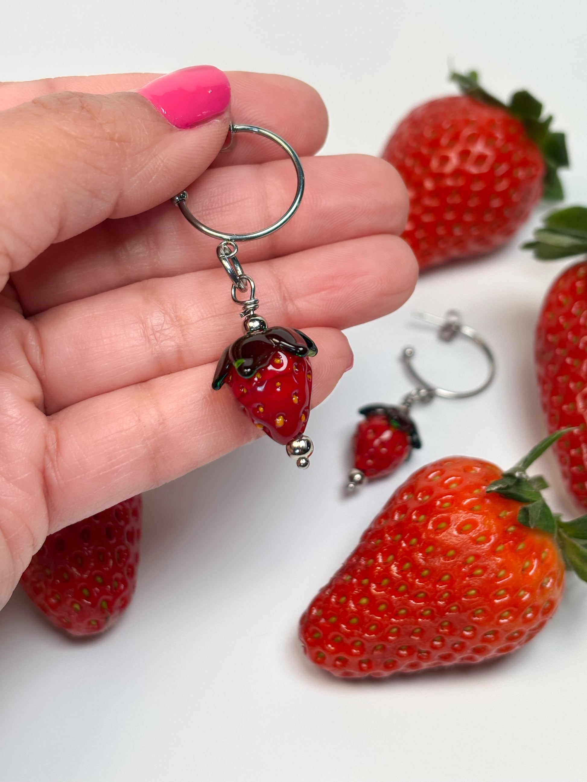 Silberne Creolen mit handgefertigten Glas-Erdbeeren – Edelstahl & Murano-Glas