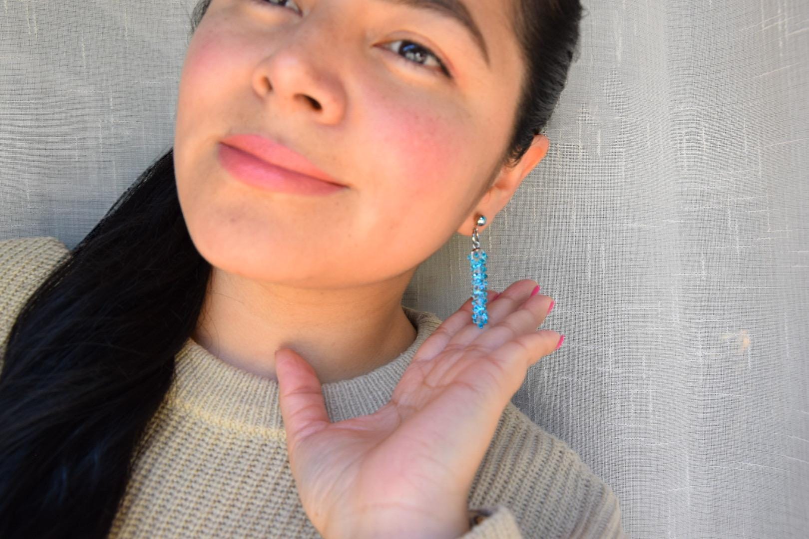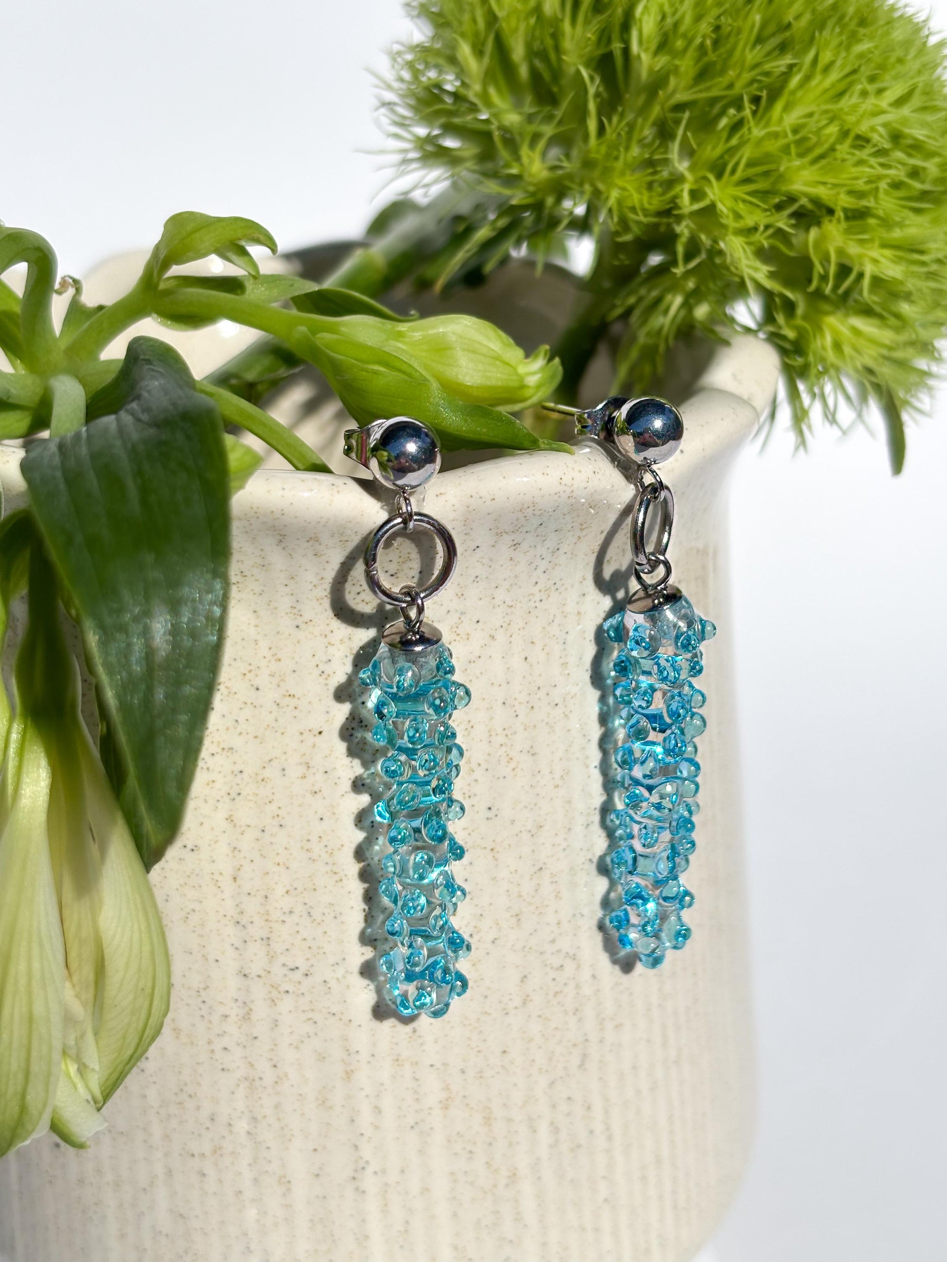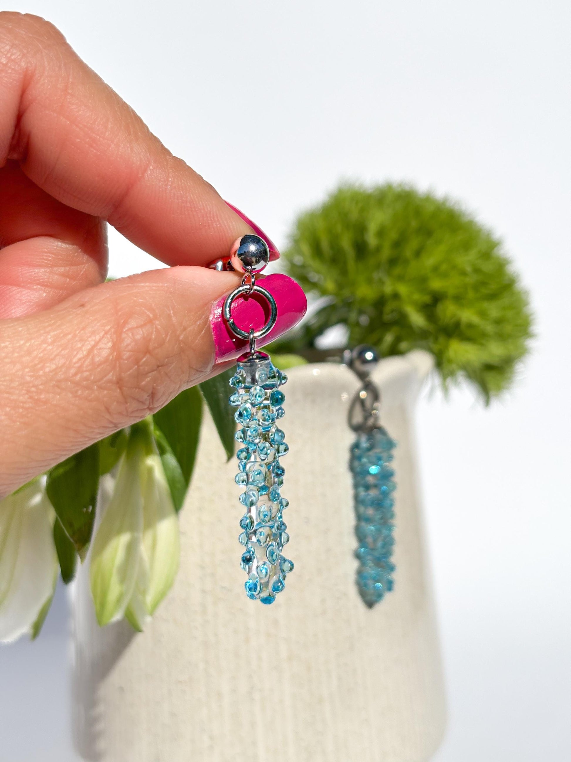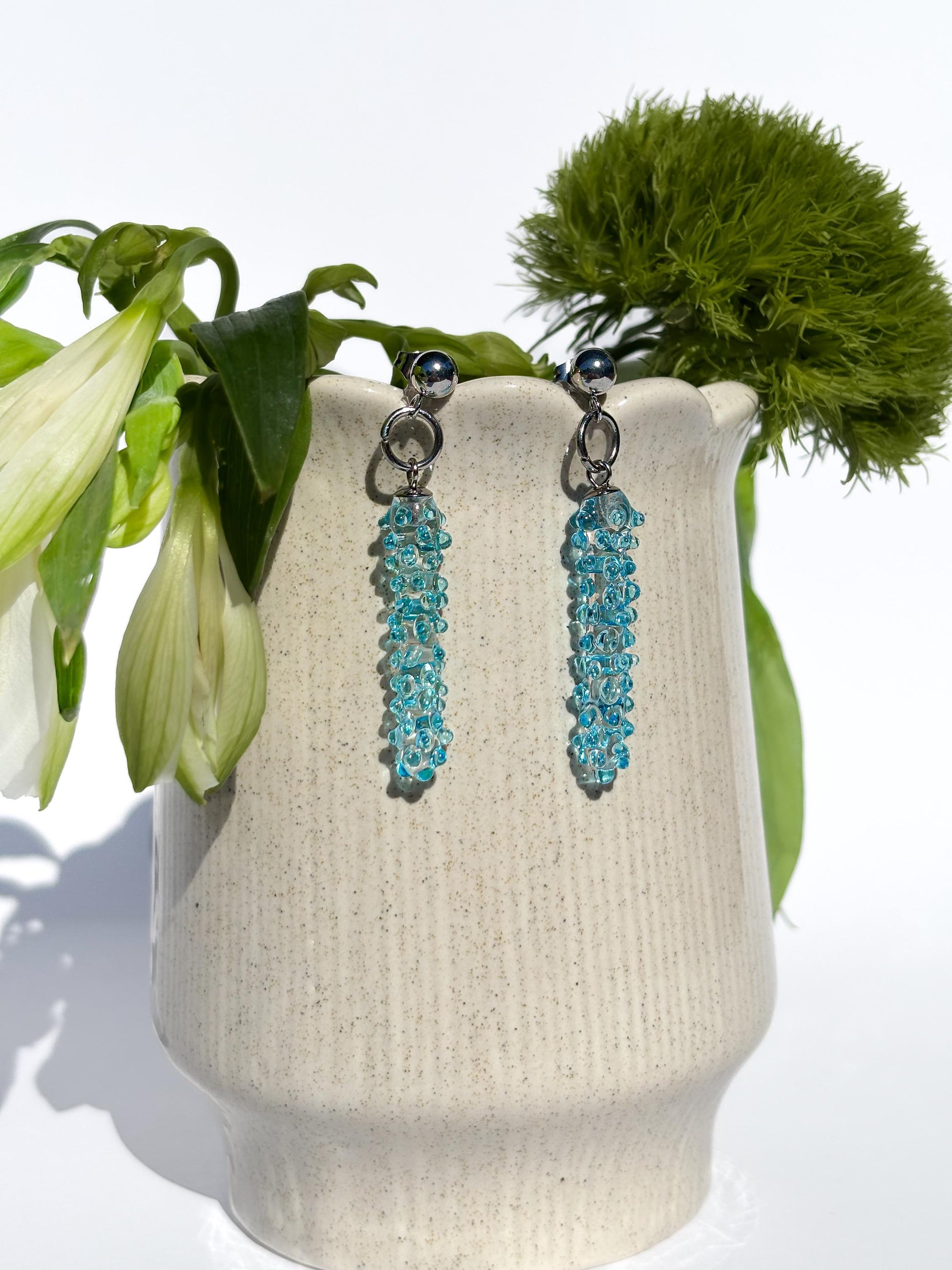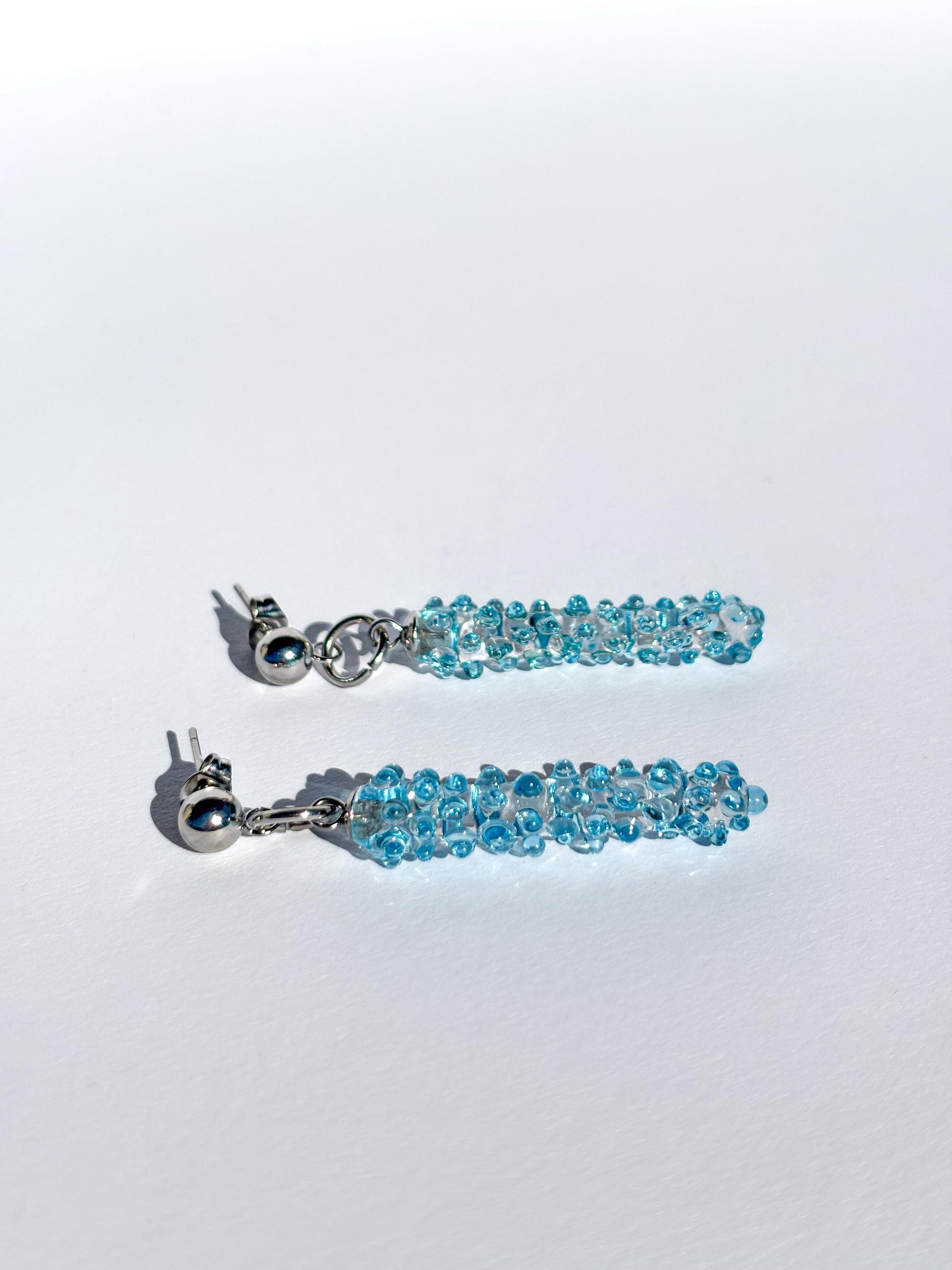 Elegante Ohrringe aus klarem und leuchtend blauem Murano-Glas – handgefertigt in traditioneller Lampwork-Technik. Die schlanke, säulenförmige Form mit applizierten Glasdetails reflektiert das Licht auf faszinierende Weise. Ein stilvoller Hingucker bei jeder Bewegung!