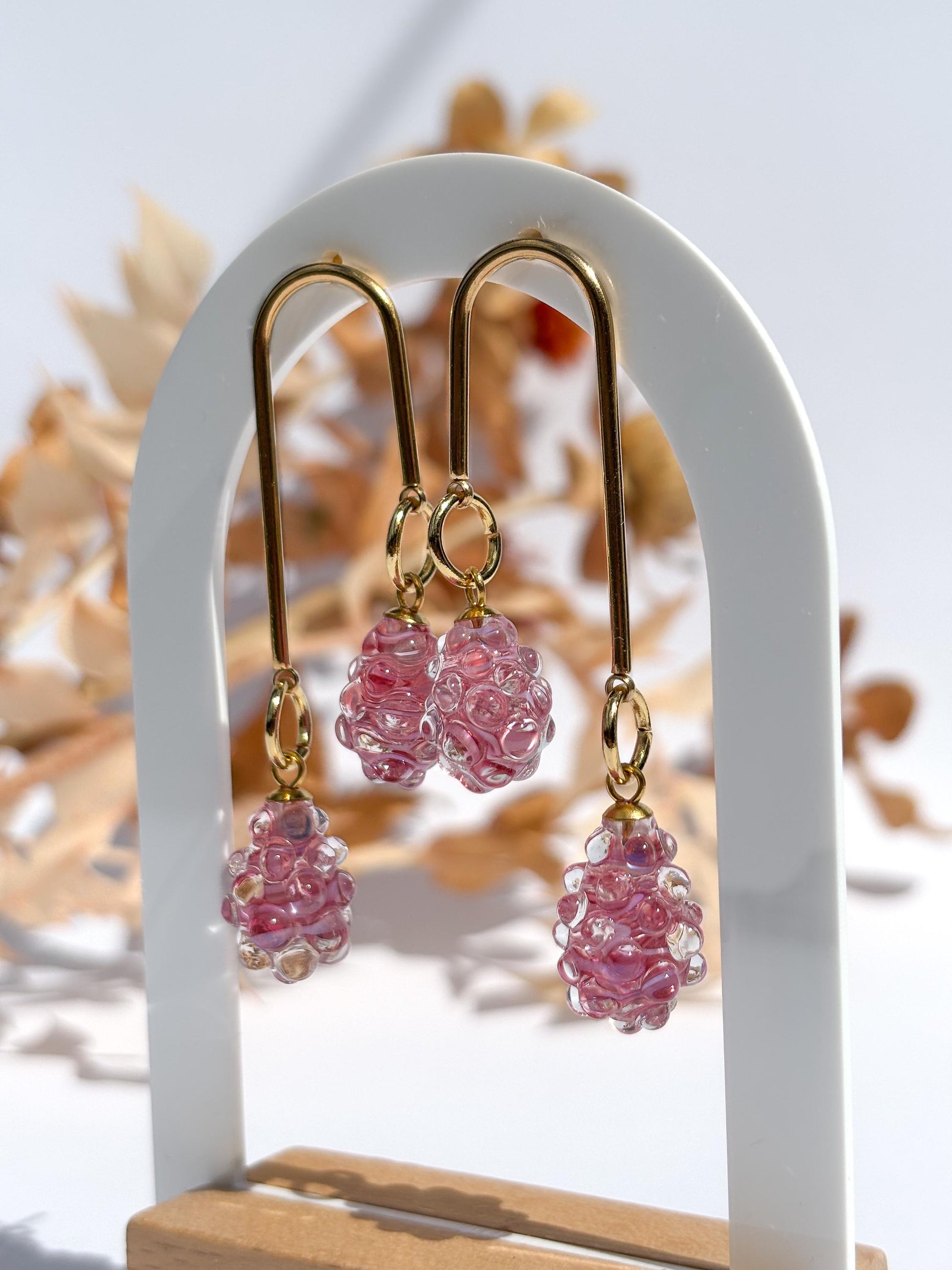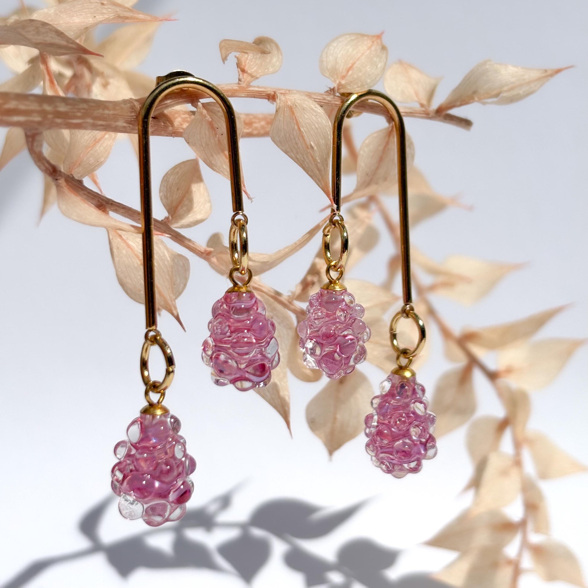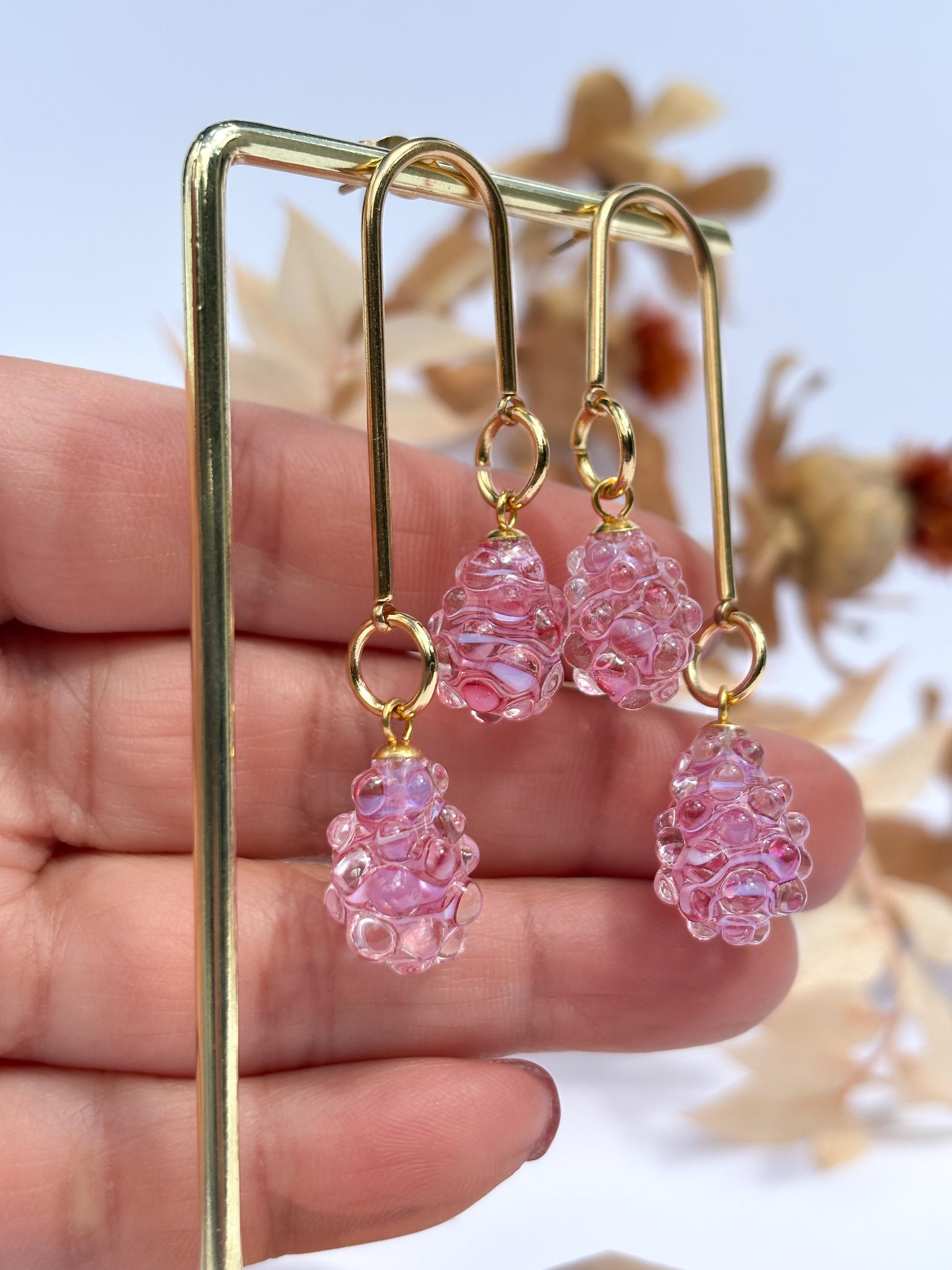 Die Ohrringe Tautropfen sind inspiriert von dem Moment, in dem ein einzelner Tautropfen langsam zu rinnen beginnt und sich in viele kleine Lichtperlen auflöst. Dieses Bild diente als Grundlage für das Design: eine tropfenförmige Hauptperle aus Glas, umgeben von feinen Glaströpfchen, die Bewegung und Leichtigkeit einfrieren.
