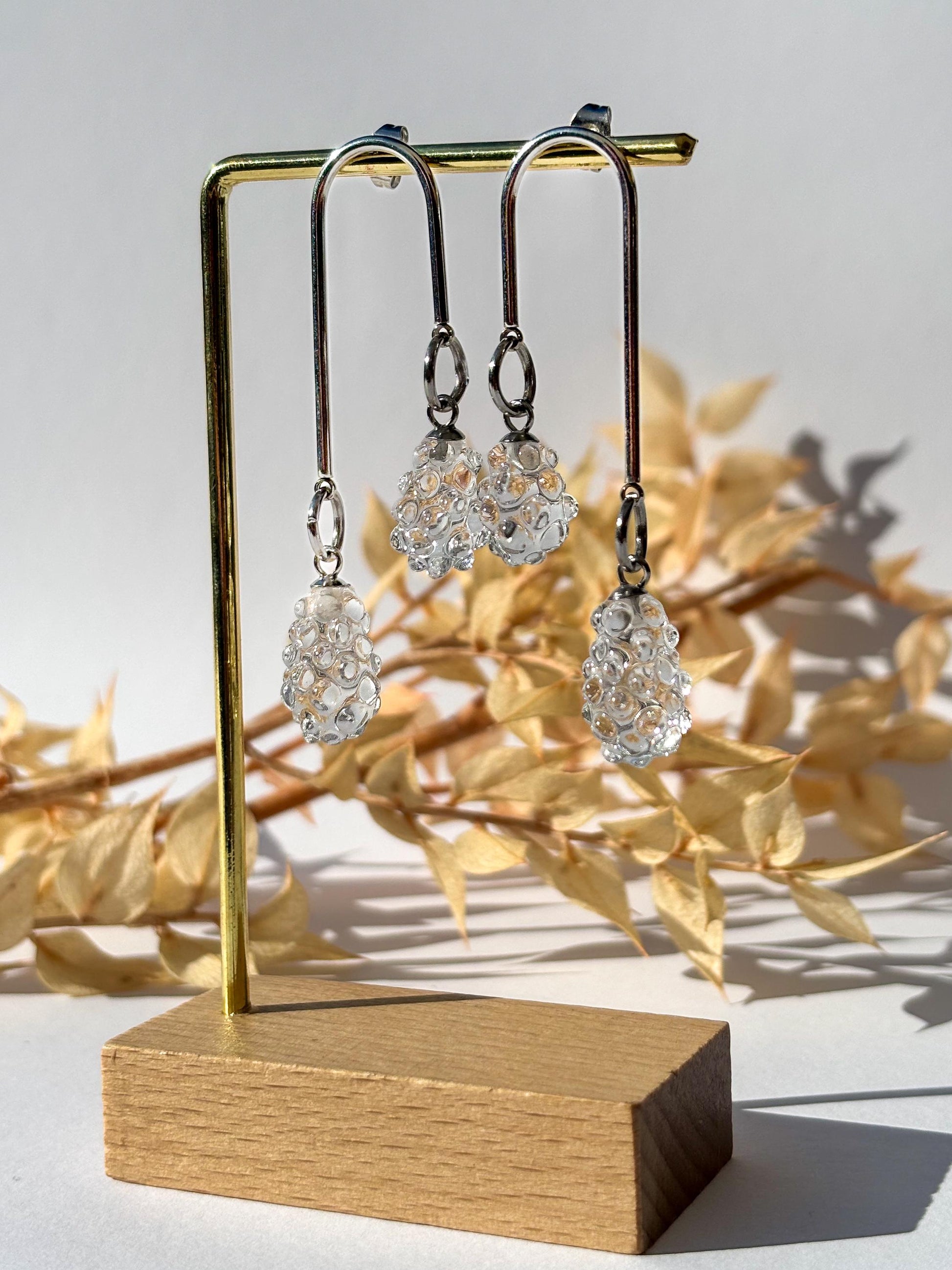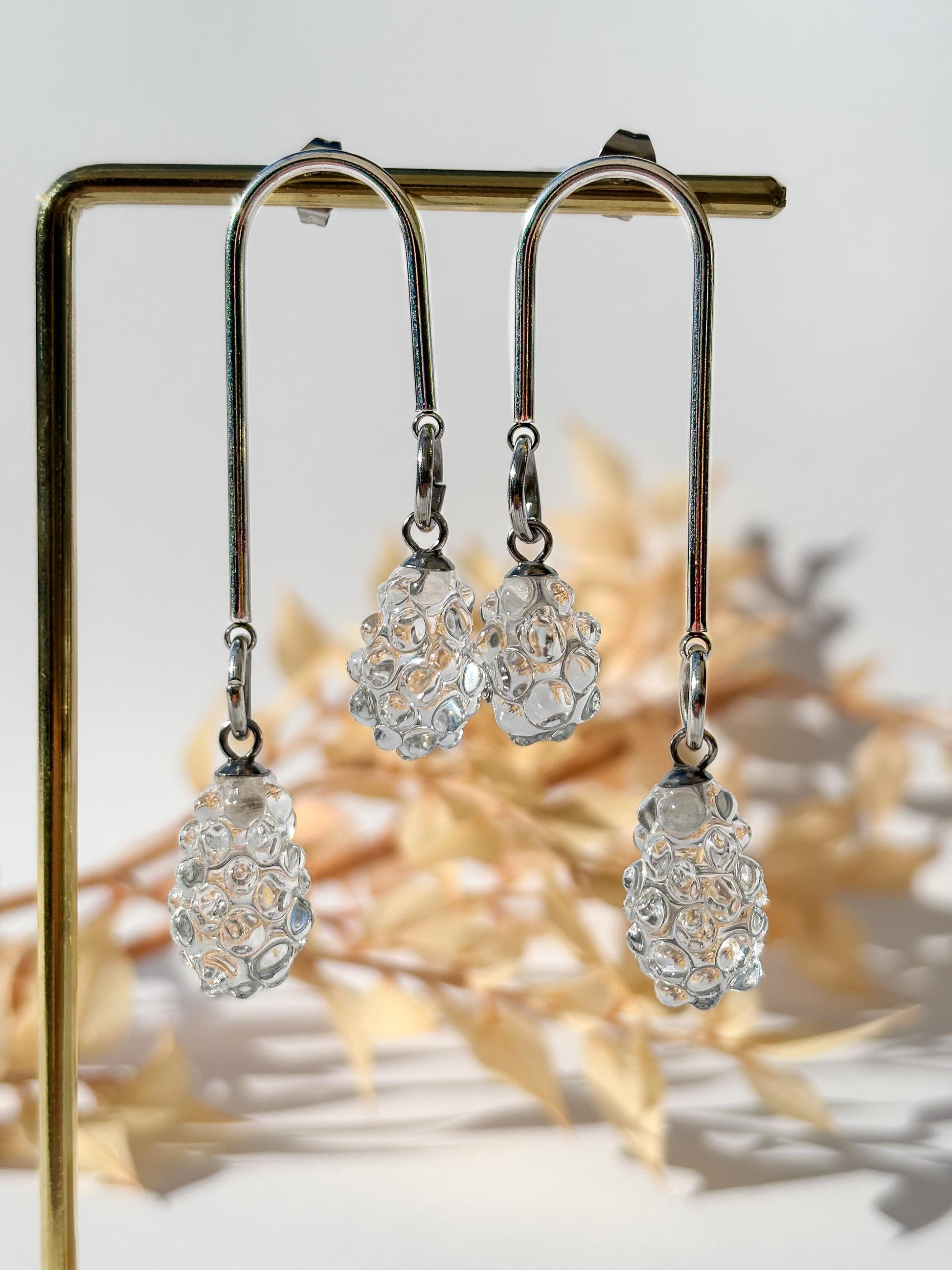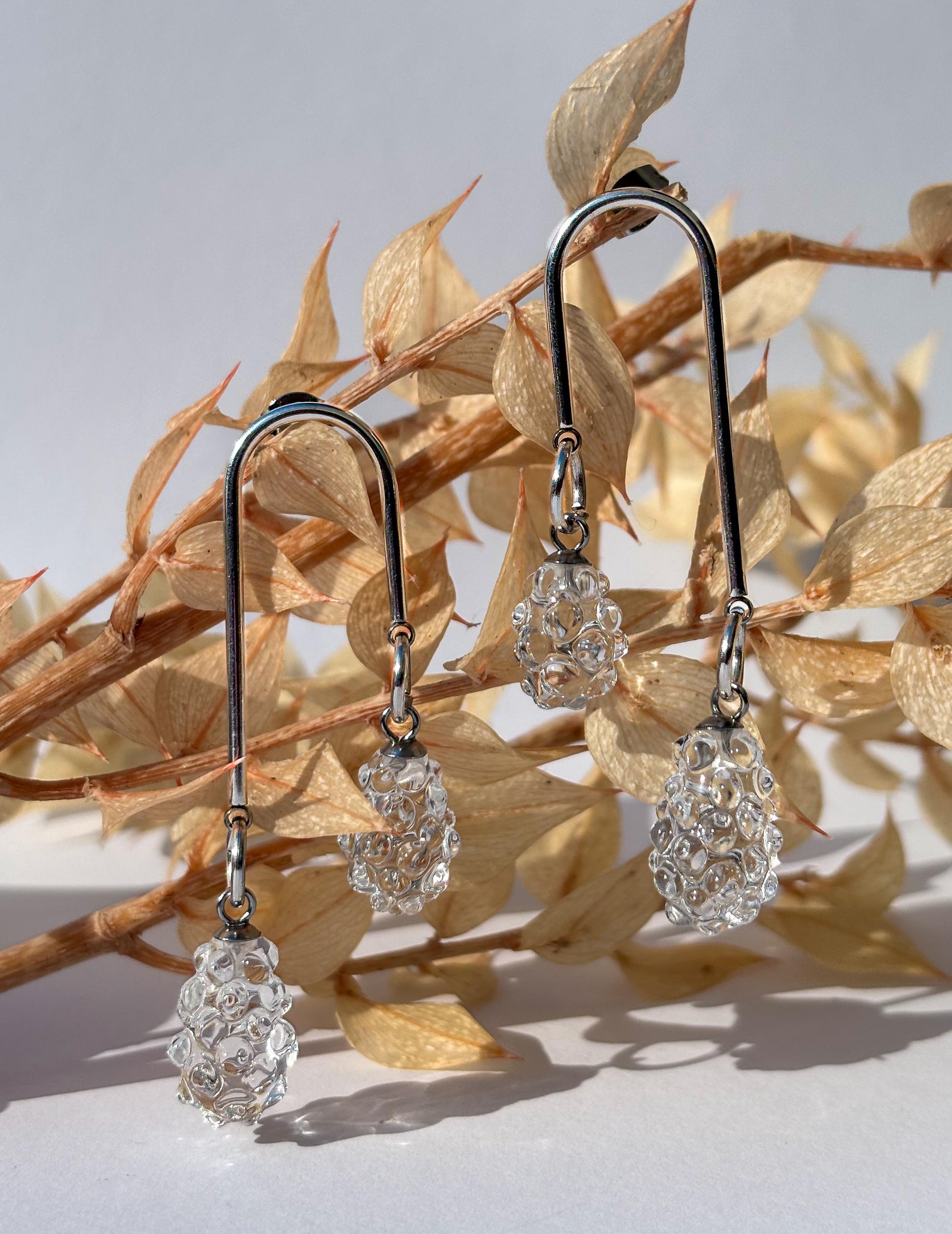 Die Ohrringe Tautropfen greifen die Idee von Klarheit, Licht und fließender Bewegung auf. Die tropfenförmige Hauptperle aus transparentem Glas wird von kleinen Glaströpfchen begleitet, die wie eingefrorene Lichtperlen wirken.