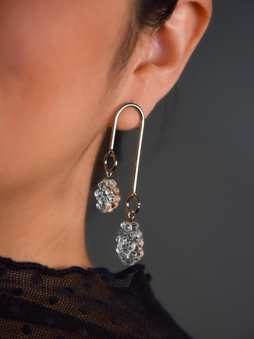 Das klare Glas in Kombination mit silberfarbenem Edelstahl unterstreicht den reduzierten, modernen Charakter dieser Ohrringe. Subtile Lichtreflexionen lassen die Oberfläche lebendig wirken, ohne aufdringlich zu sein. Ein eleganter, minimalistischer Look mit klarer Formensprache.