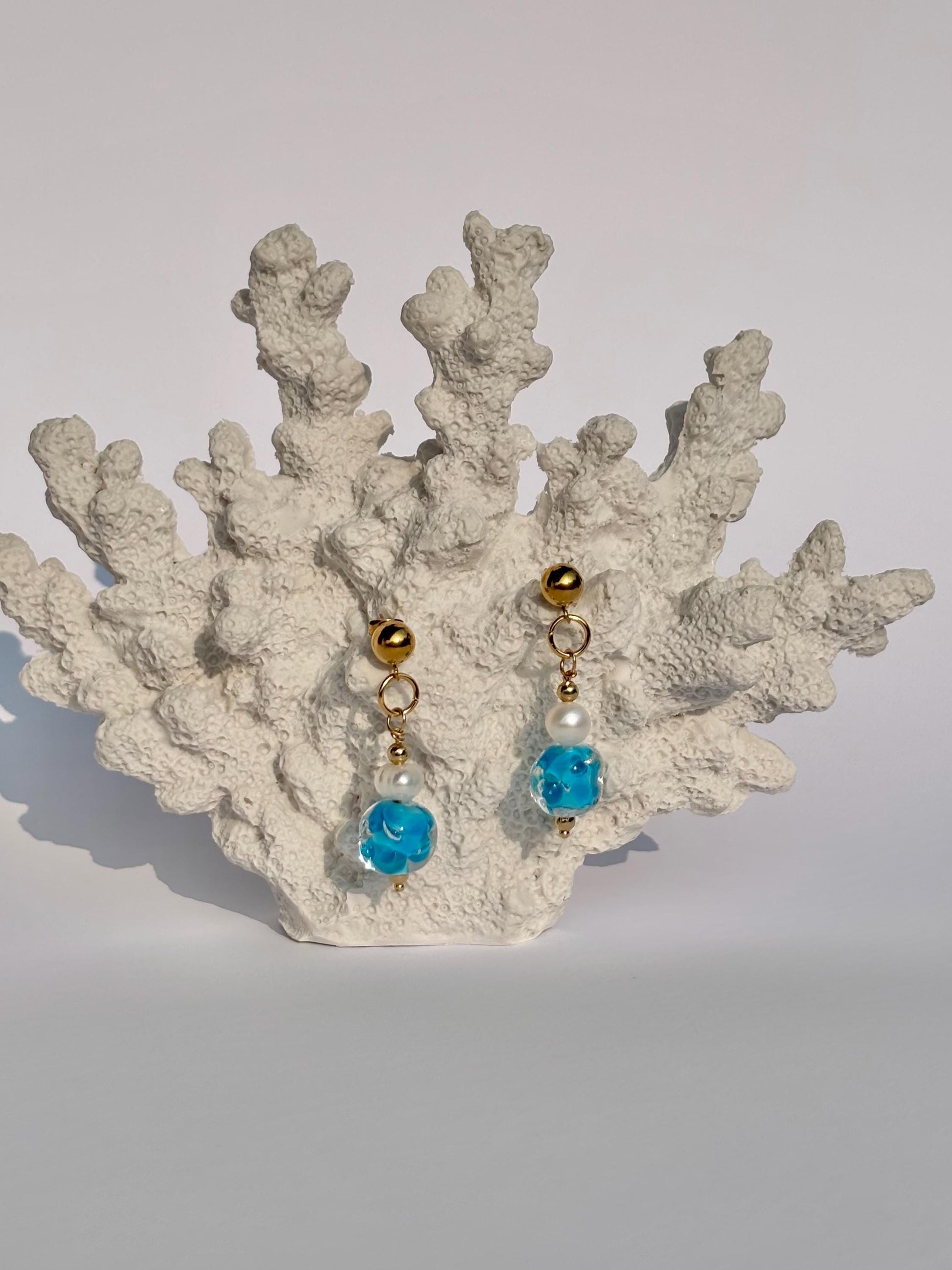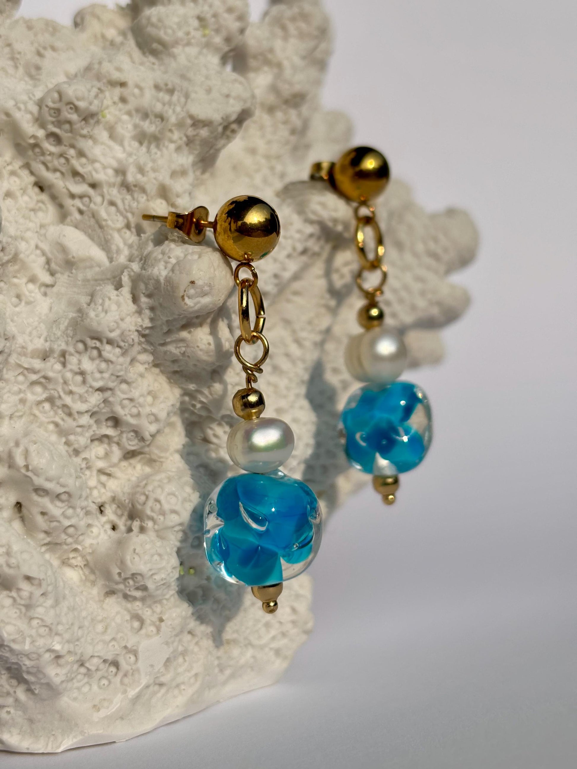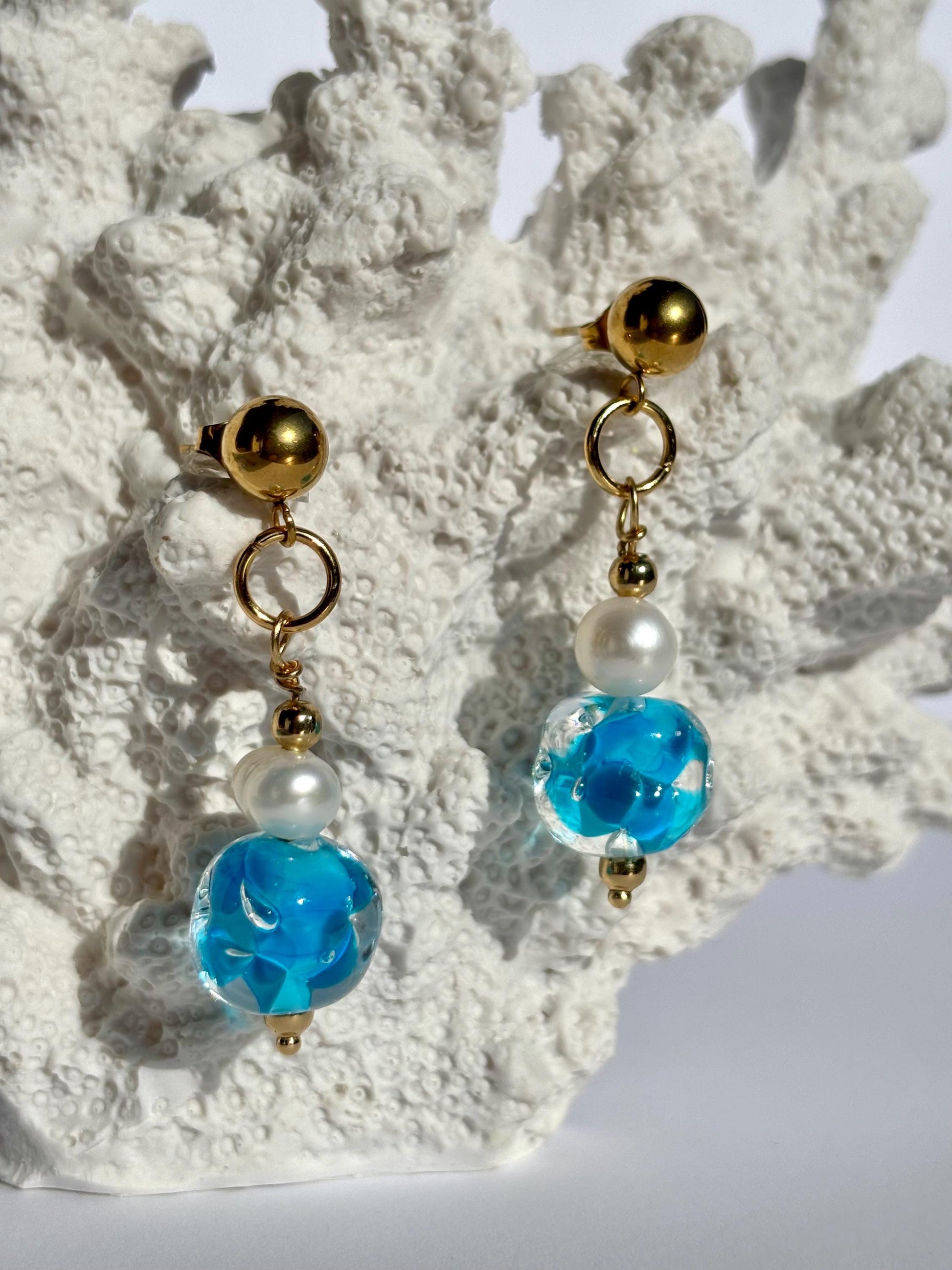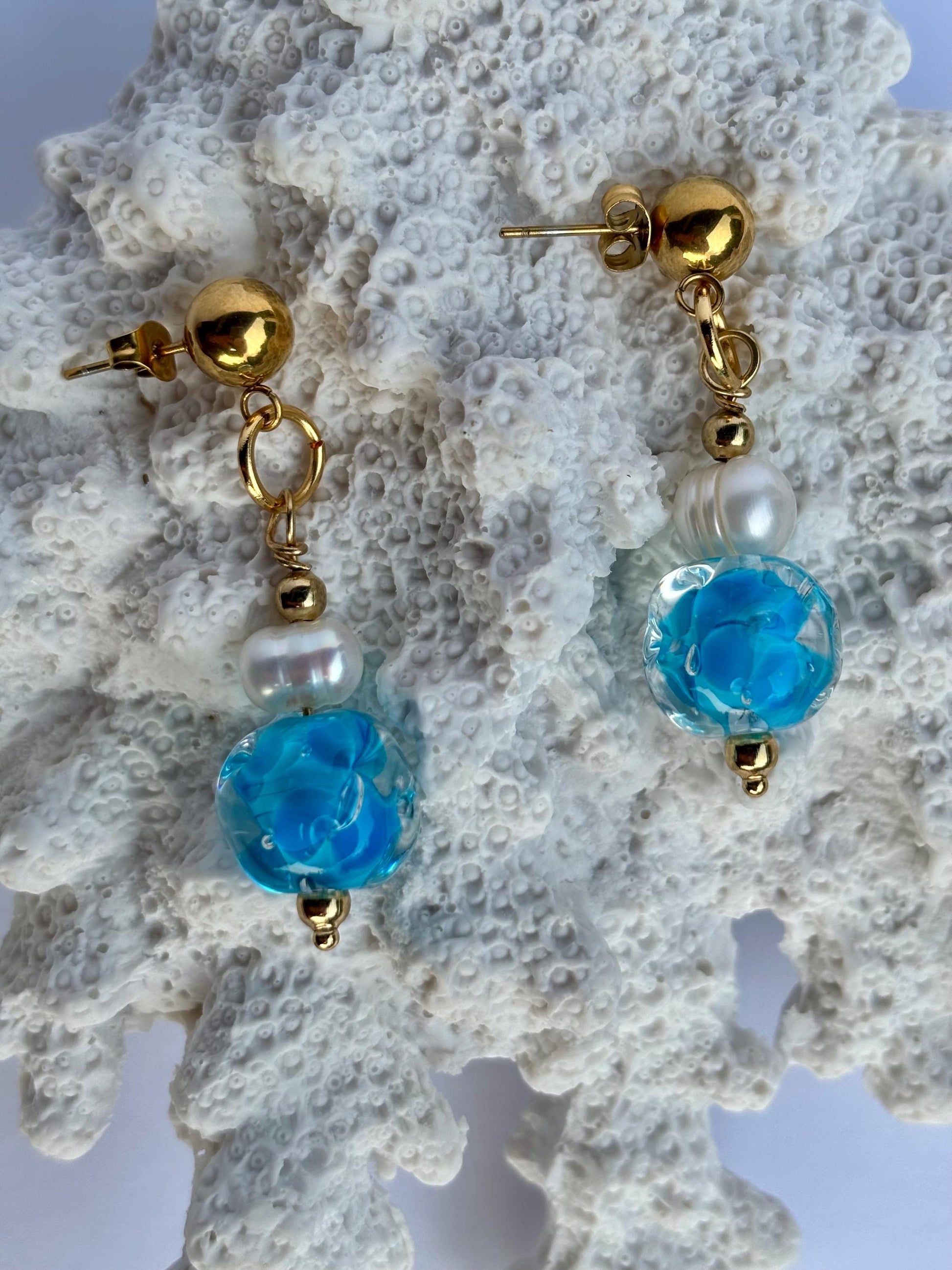 Die Ohrringe Water Dream sind inspiriert vom Farbspiel und der Leichtigkeit des Meeres. Handgeformte Glasperlen mit sanften Türkis- und Blautönen erzeugen einen lebendigen Wassereffekt, der je nach Bewegung und Lichteinfall ständig neue Nuancen zeigt.