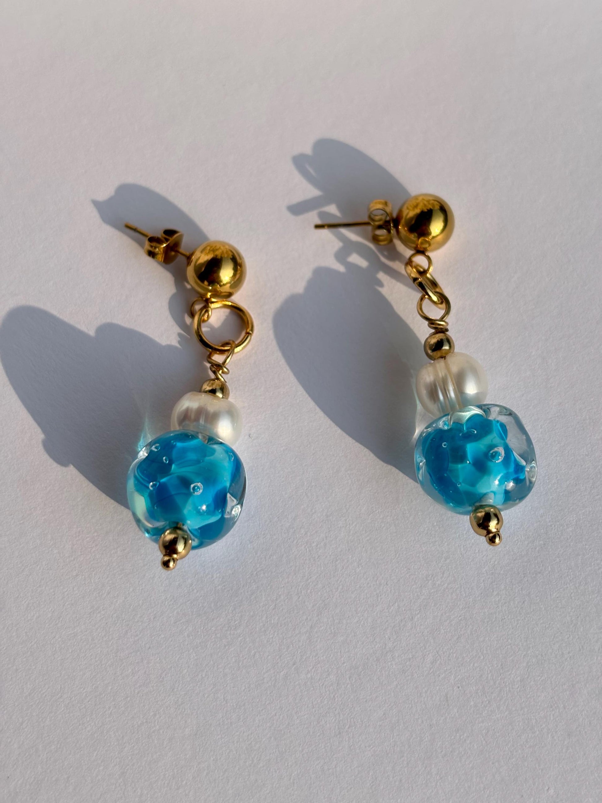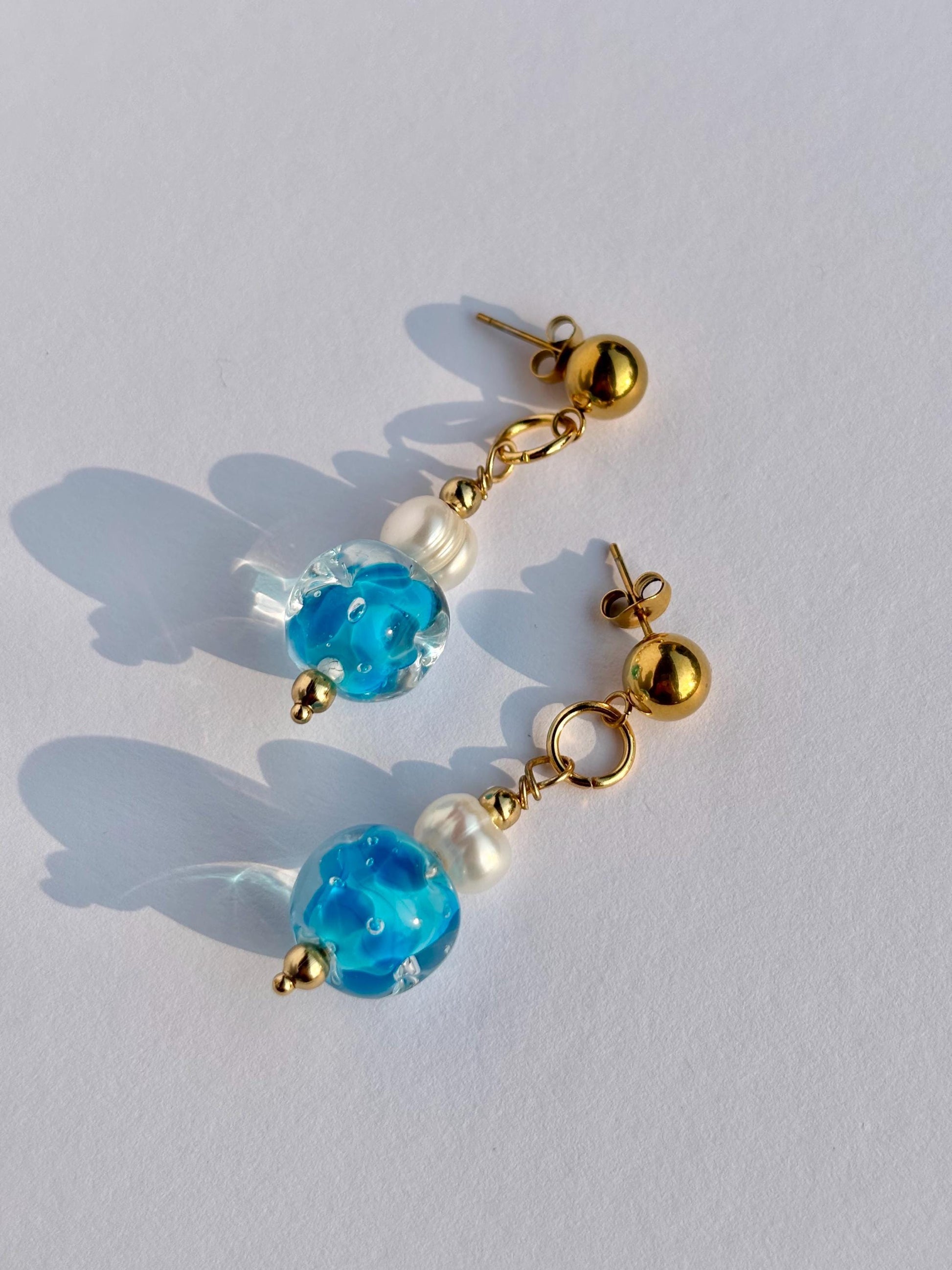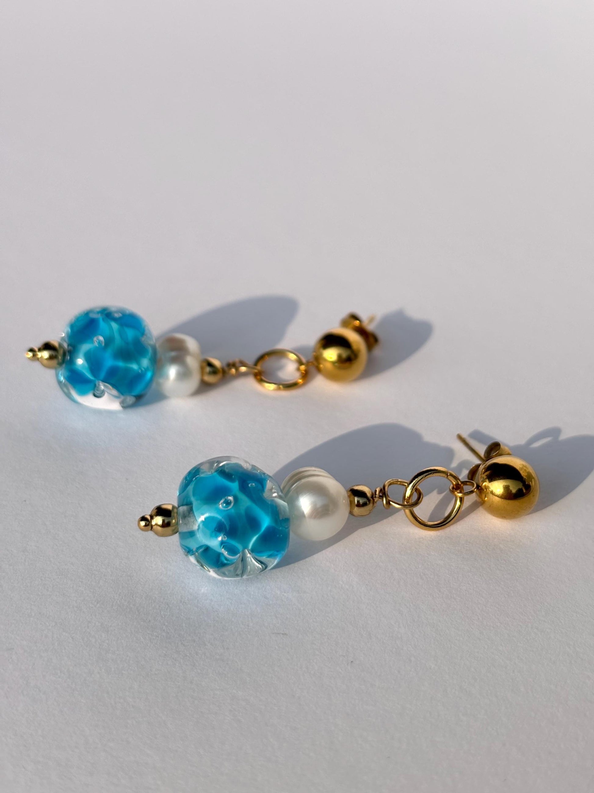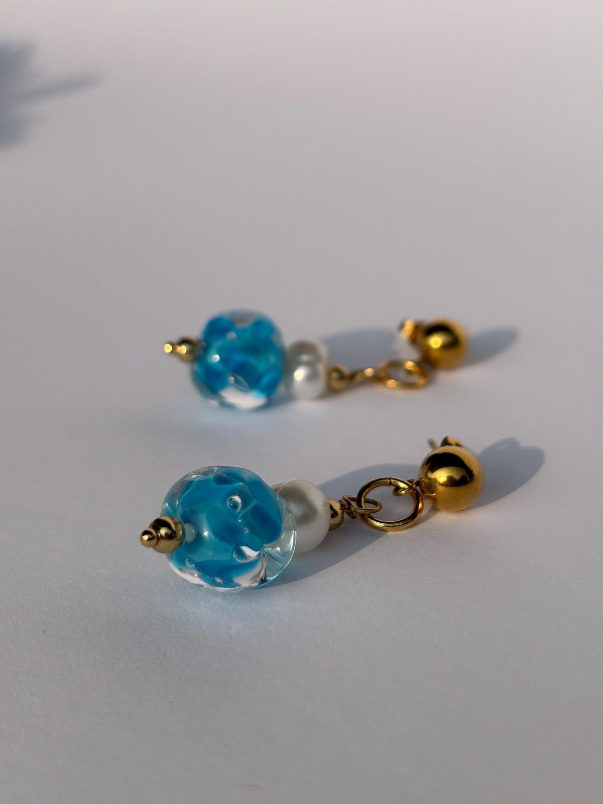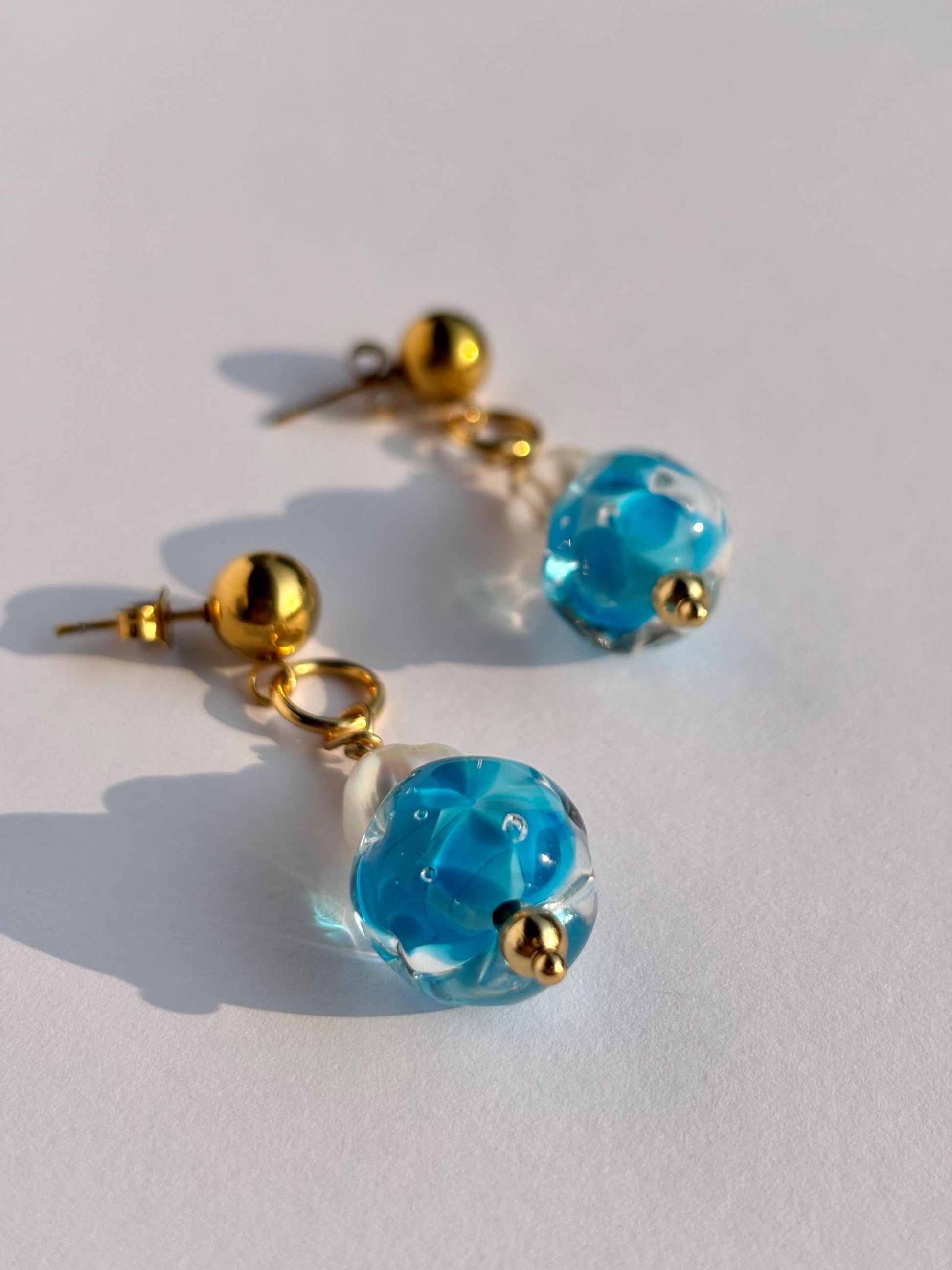 Jede Glasperle wird in meinem Atelier einzeln frei über der Flamme in traditioneller Lampwork-Technik gefertigt. Die fließenden Farbverläufe verleihen den Ohrringen eine organische, ruhige Ausstrahlung – leicht, klar und sommerlich.