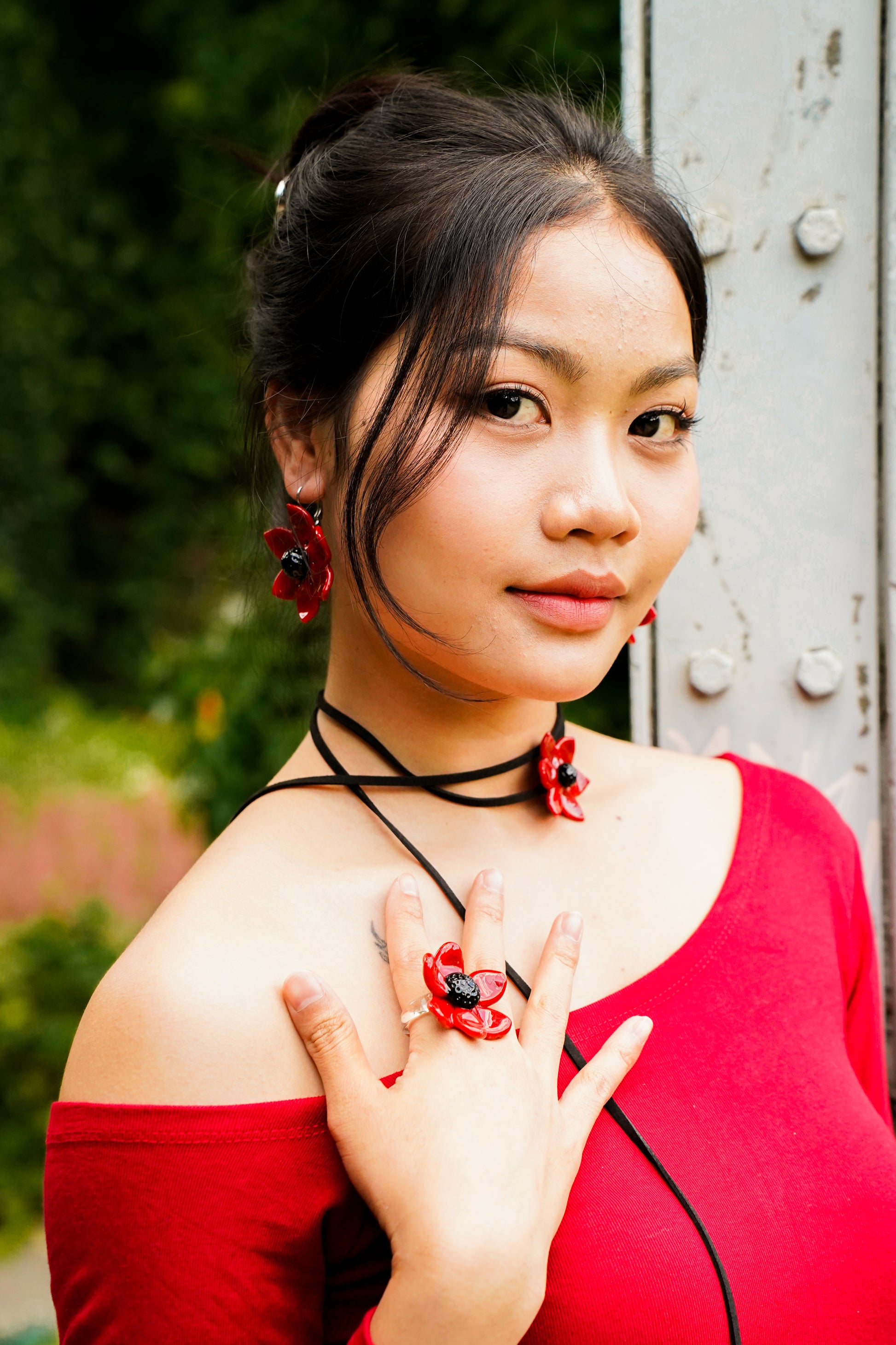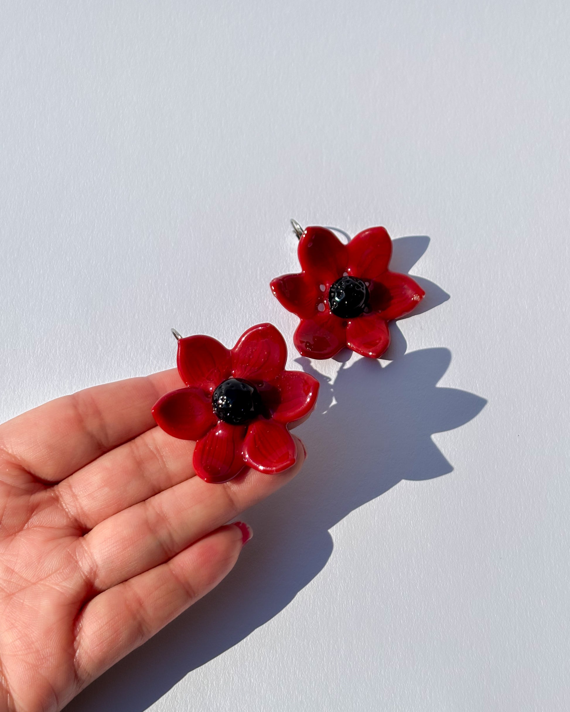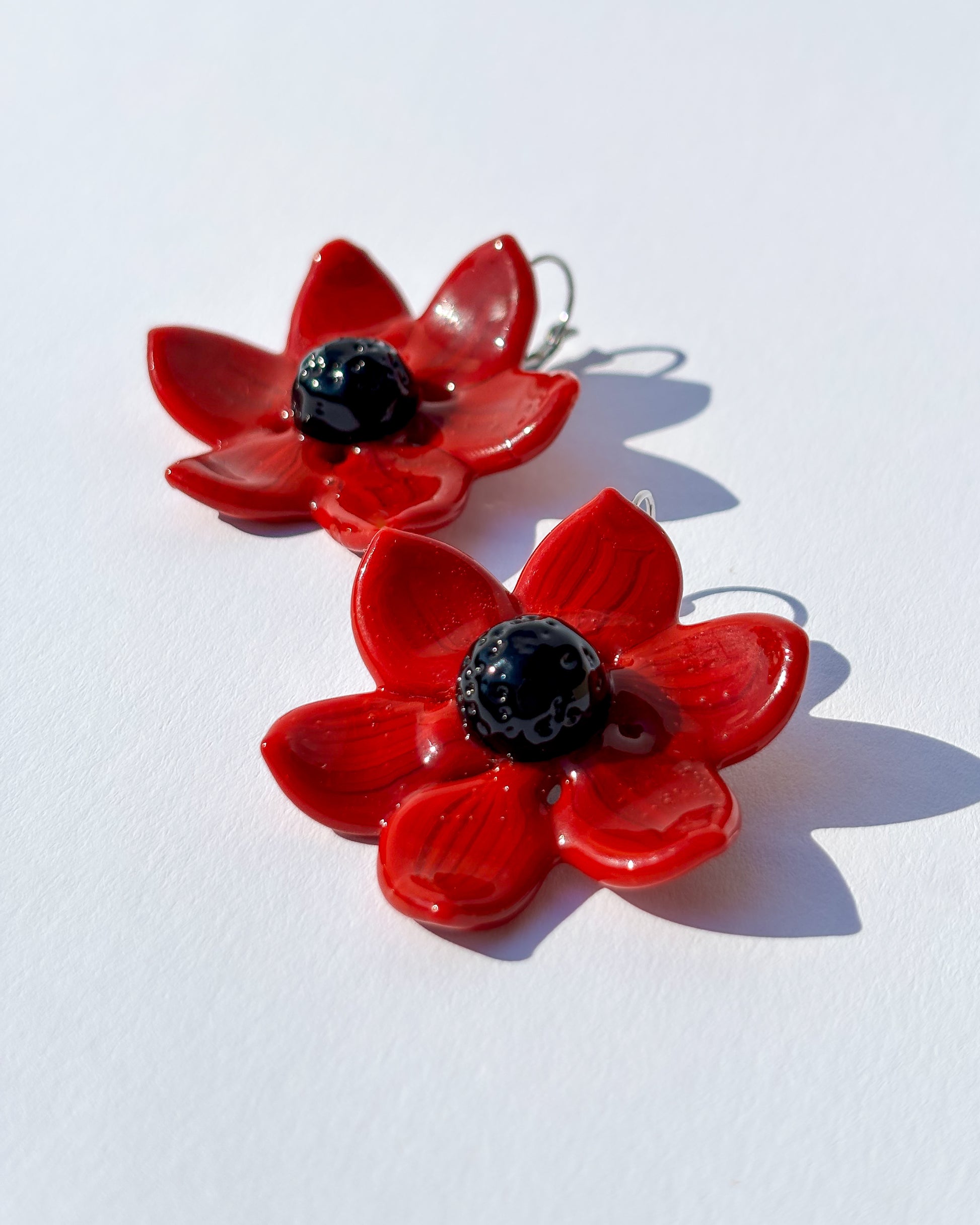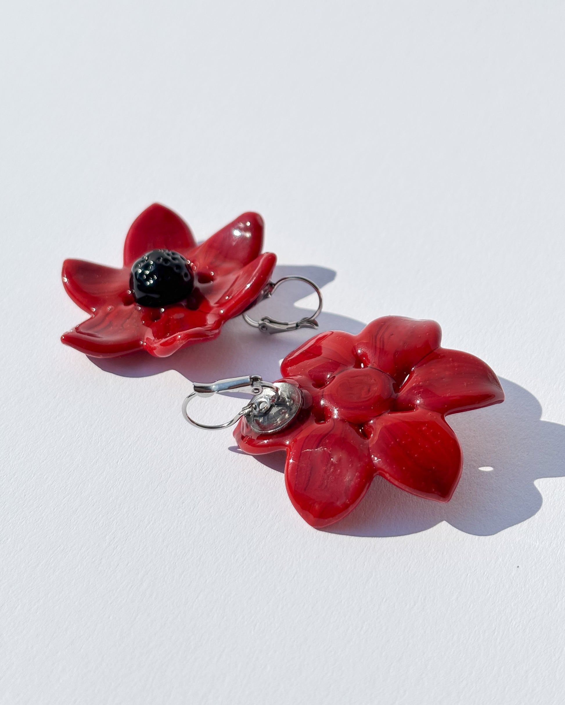 Die Scarlet Whisper Ohrringe sind ausdrucksstarke Statement-Ohrringe aus handgearbeitetem Borosilikatglas. Die leuchtend roten Glasblumen mit tiefschwarzem Zentrum wirken kraftvoll, elegant und intensiv, ein klares visuelles Statement.