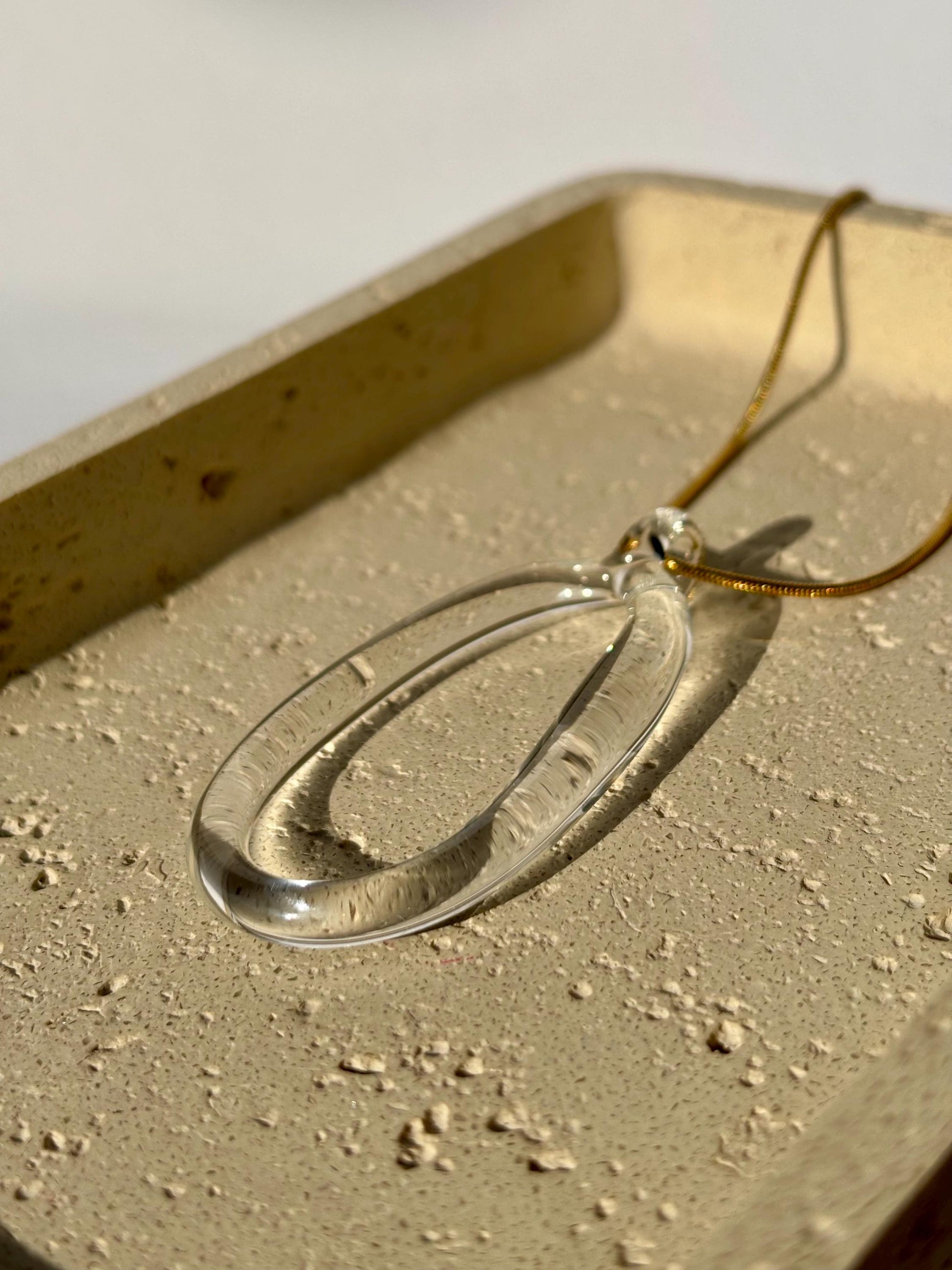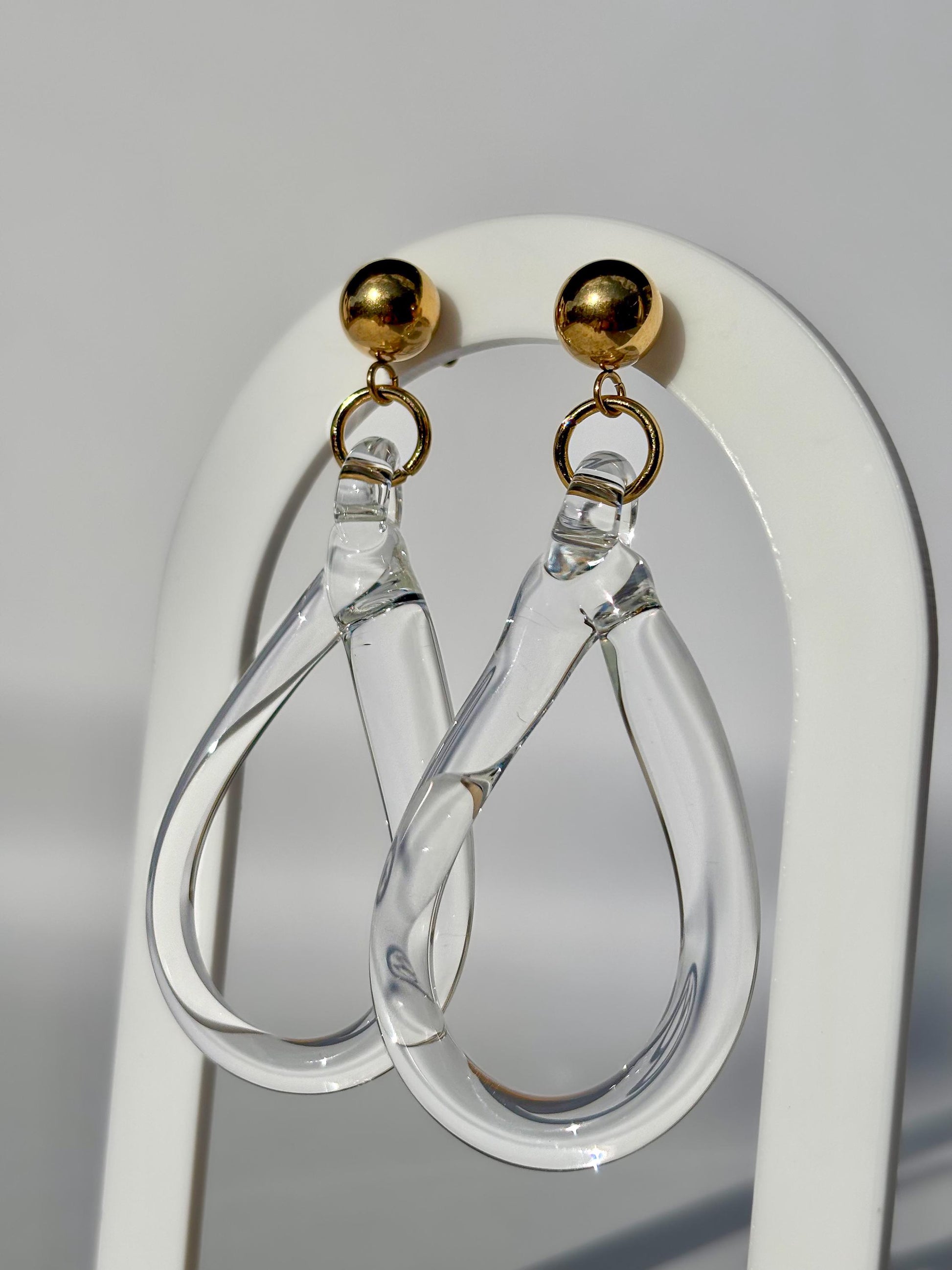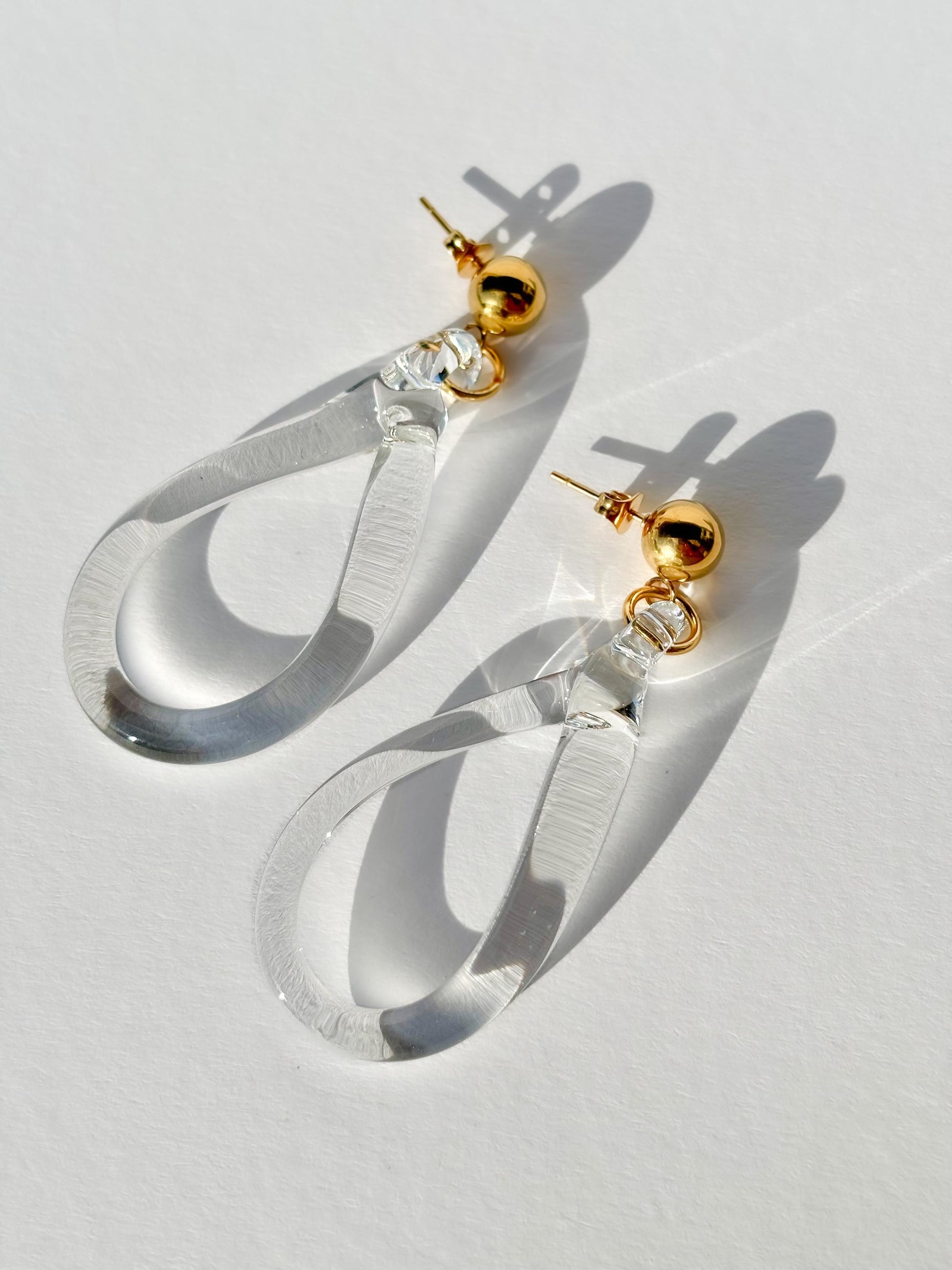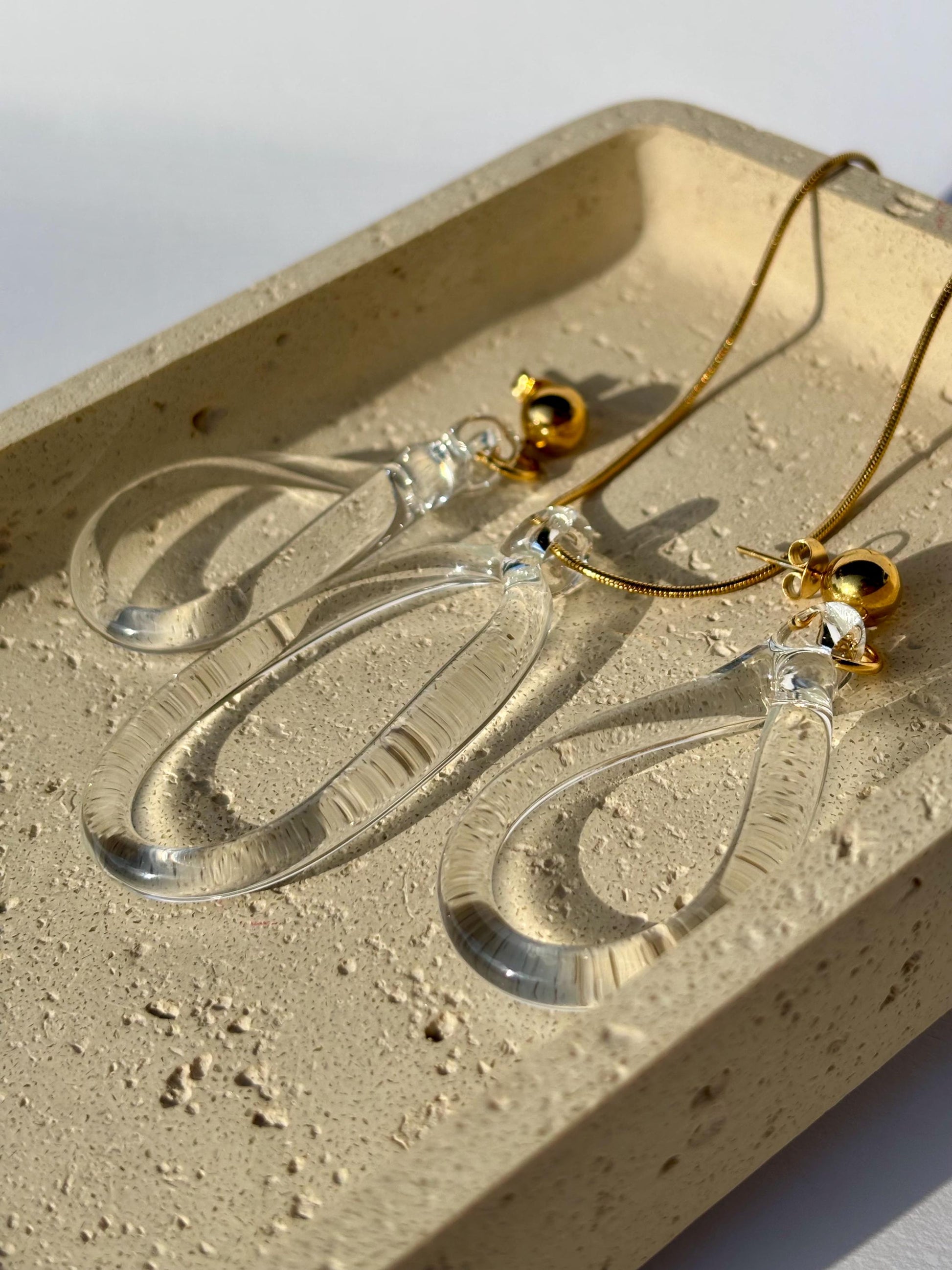 Die GUTTA Ohrringe sind elegante Statement-Ohrringe aus klarem Borosilikatglas. Inspiriert von der reinen Form des Tropfens, stehen sie für Ruhe, Gewicht und Balance in einer fließenden, organischen Silhouette.